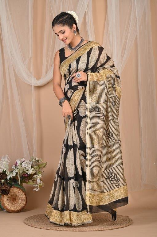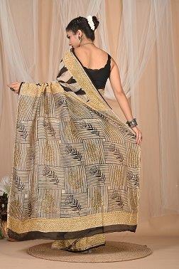 Black & Beige Traditional Handblock Printed Saree with Blouse Piece