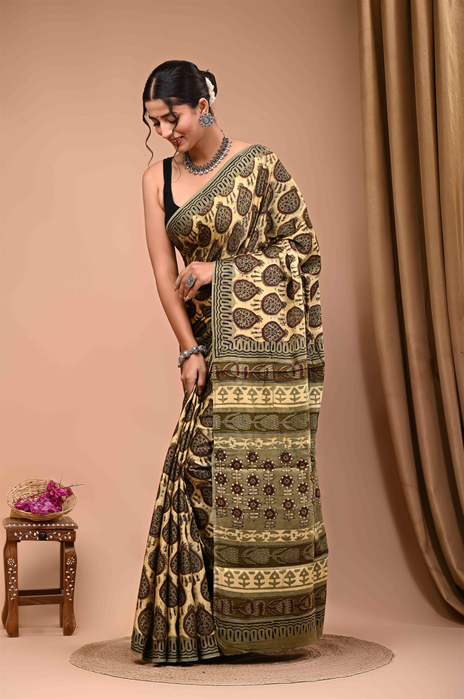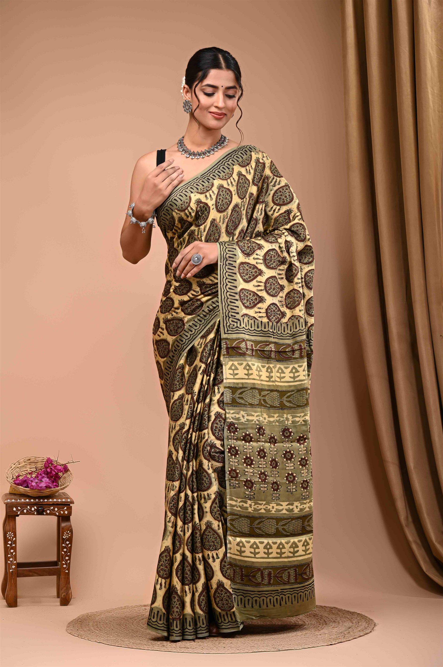 The saree is a DES-Modal Silk Sarees 77. It's beige with brown and green patterns, featuring teardrop and geometric motifs. The saree has a mix of designs and is draped elegantly on the model. It's paired with a black sleeveless blouse and complemented by silver jewellery. ??