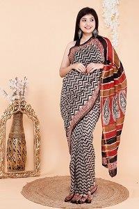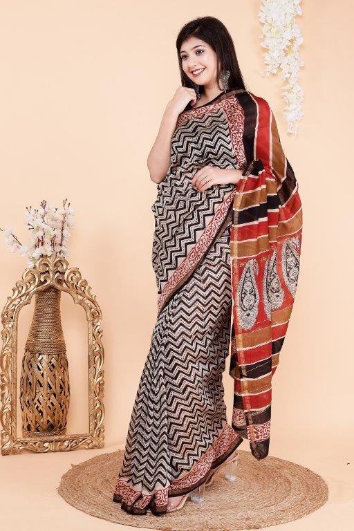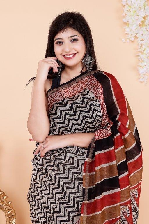 This striking black cotton saree features a bold zigzag print throughout the body, complemented by a vibrant multicolor pallu adorned with traditional motifs. The contrast between the monochrome base and rich, colorful pallu adds a touch of contemporary charm to a classic ethnic design. Made from soft cotton, it ensures comfort all day long—perfect for festive occasions, casual outings, and office wear.