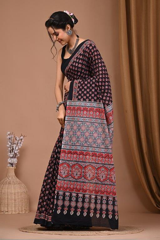 This elegant black saree features a striking printed design in shades of red and grey, offering a beautiful contrast. The body of the saree has a delicate all-over print, while the pallu showcases a more elaborate and vibrant pattern. Made from a comfortable and flowing fabric, this saree is perfect for festive occasions, casual gatherings, or daily wear, adding a touch of traditional charm to your ensemble. It comes with a matching blouse piece (though the blouse is not explicitly shown, it's standard for sarees).