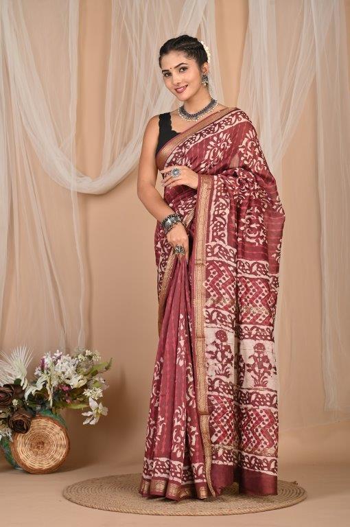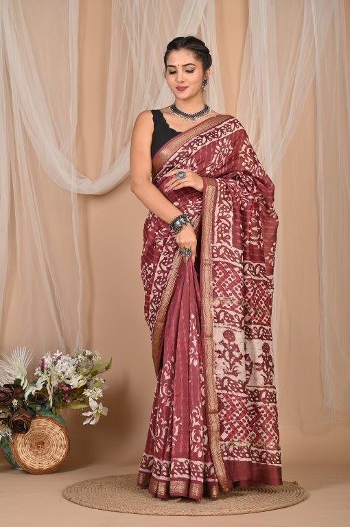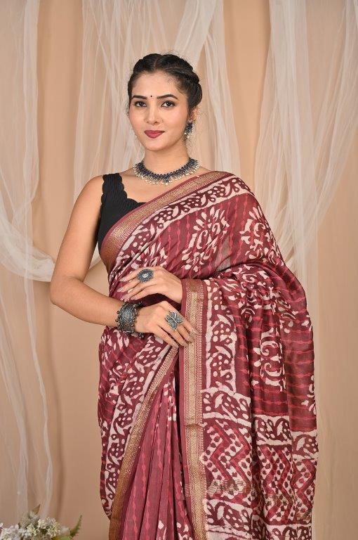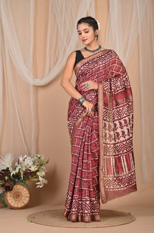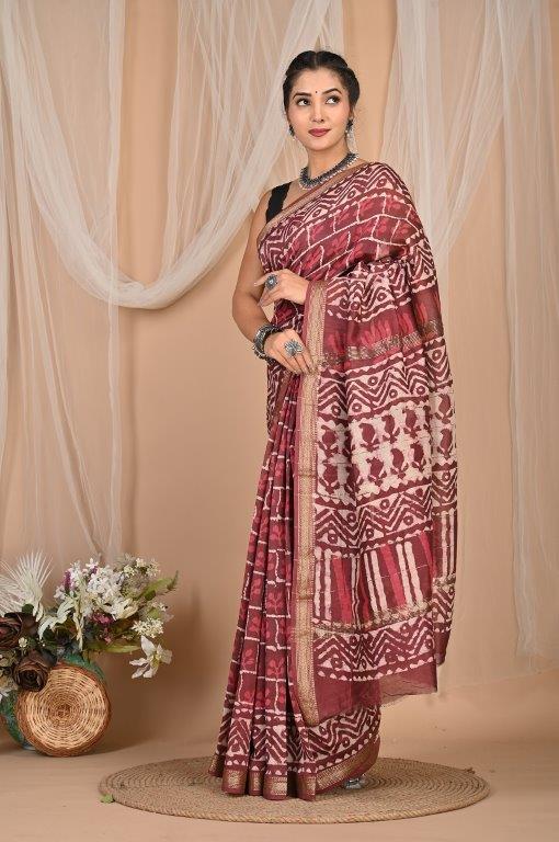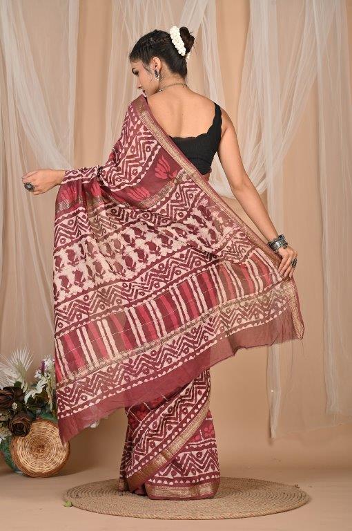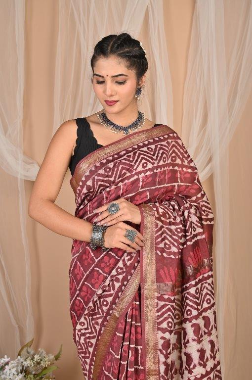 This elegant Maheshwari saree, known for its lightweight and airy feel, features a rich maroon or burgundy base adorned with intricate white or off-white prints. The patterns are a captivating mix of abstract, geometric, and possibly traditional motifs, distributed throughout the body and pallu, creating a unique and artistic look. Maheshwari sarees are renowned for their fine silk and cotton blend, making them comfortable and graceful. The saree is bordered with subtle golden lines, adding a touch of sophisticated shimmer. Originating from Maheshwar, Madhya Pradesh, this saree offers a graceful drape and comfortable feel, making it an ideal choice for festive occasions, cultural gatherings, or elegant daily wear.