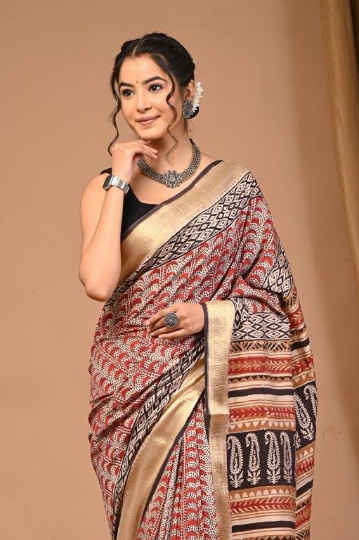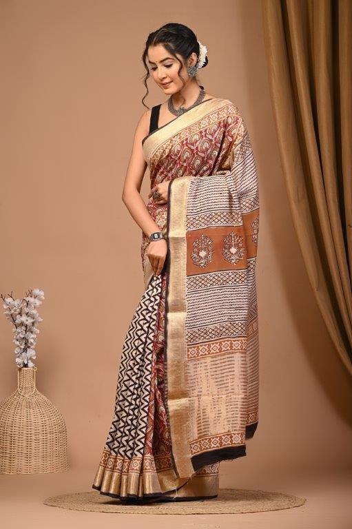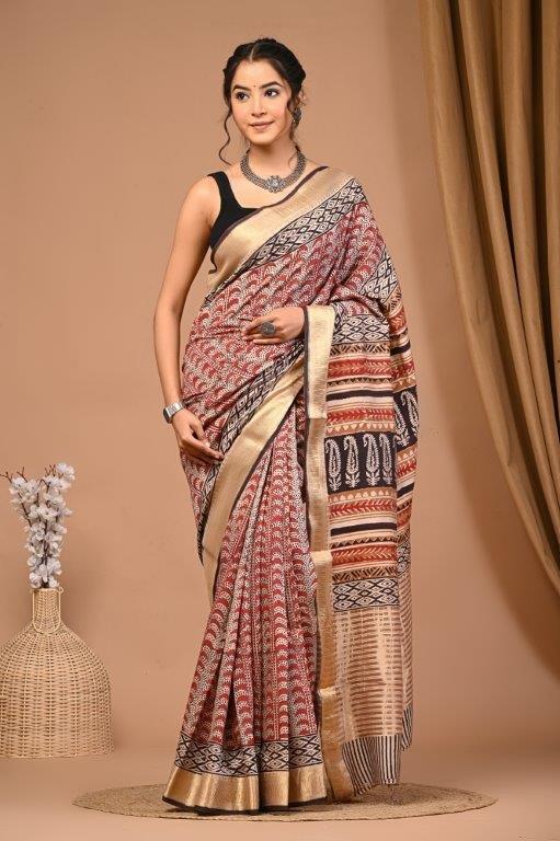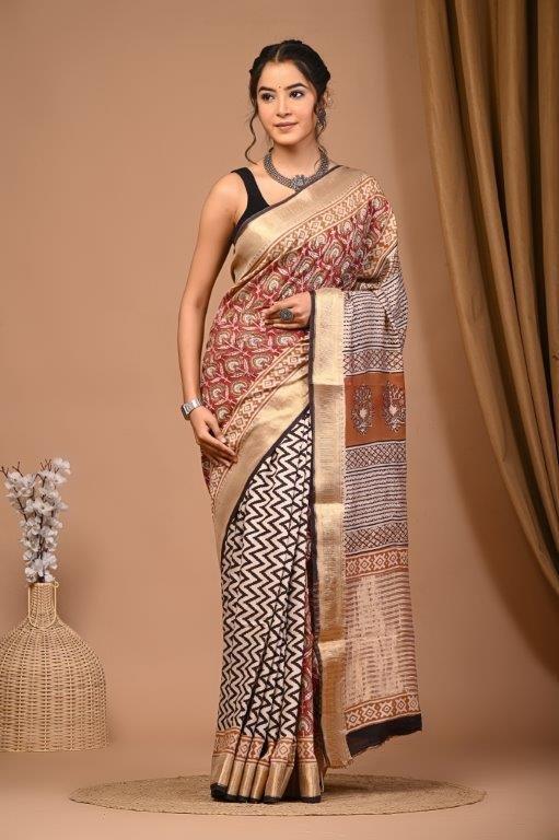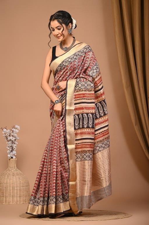This exquisite Mangalagiri saree, celebrated for its fine count weave and characteristic plain body with Nizam borders, features a beautiful blend of red, beige/cream, and black. The body of the saree is adorned with intricate patterns, possibly block prints or traditional motifs, in red and beige/cream tones. The pallu showcases elaborate designs, including stripes and stylized elements in black, red, and beige, adding to its traditional appeal. A striking golden border frames the saree, enhancing its elegance. Mangalagiri sarees are known for their comfortable and crisp drape, making this a versatile choice for various occasions. This saree is perfect for festive gatherings, cultural events, or sophisticated daily wear, embodying the rich textile heritage of Mangalagiri.