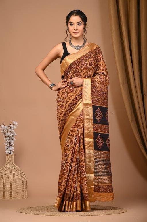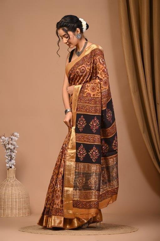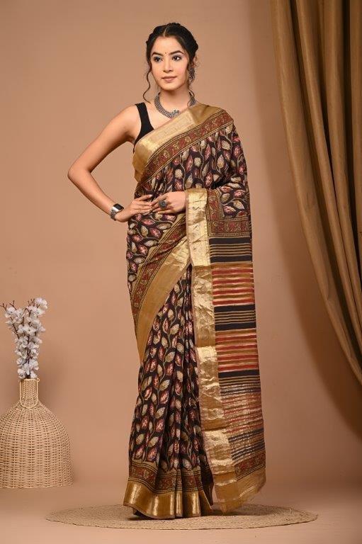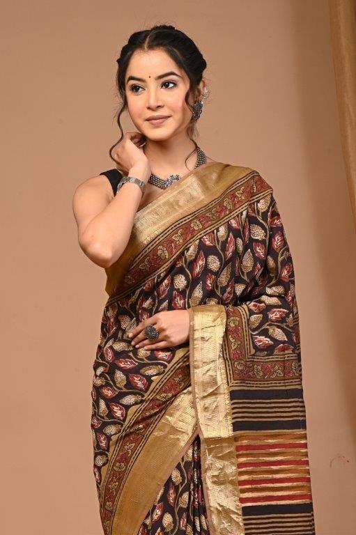 This exquisite Mangalagiri saree, known for its fine weave and comfortable drape, features a rich black base adorned with vibrant multi-color leaf and botanical prints in shades of red, yellow, and white. The body of the saree showcases an intricate all-over design. The pallu is particularly striking, featuring bold horizontal stripes in red, black, and gold, along with traditional motifs, all framed by a prominent golden border. The Mangalagiri weave ensures a comfortable and crisp feel, making this saree a perfect blend of traditional artistry and luxurious appeal. It is an excellent choice for festive occasions, cultural events, or grand celebrations, especially suitable for the cultural tastes in Jaipur, Rajasthan.