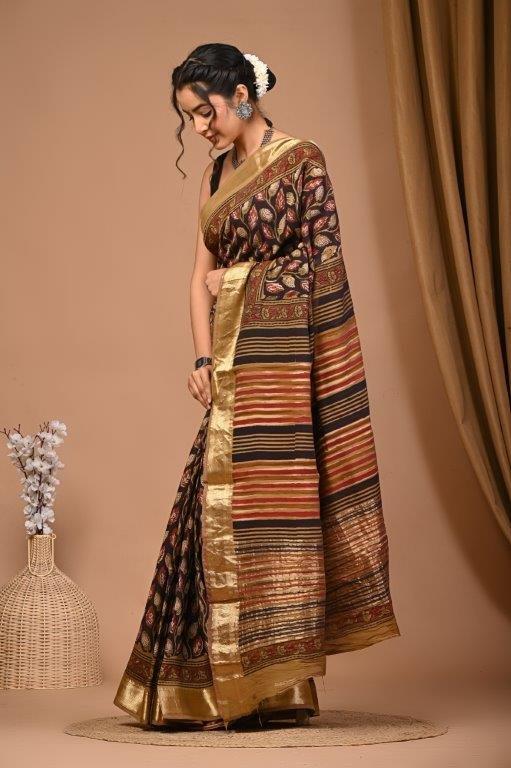 Women''s Black & Multi-Color Printed Mangalagiri Saree