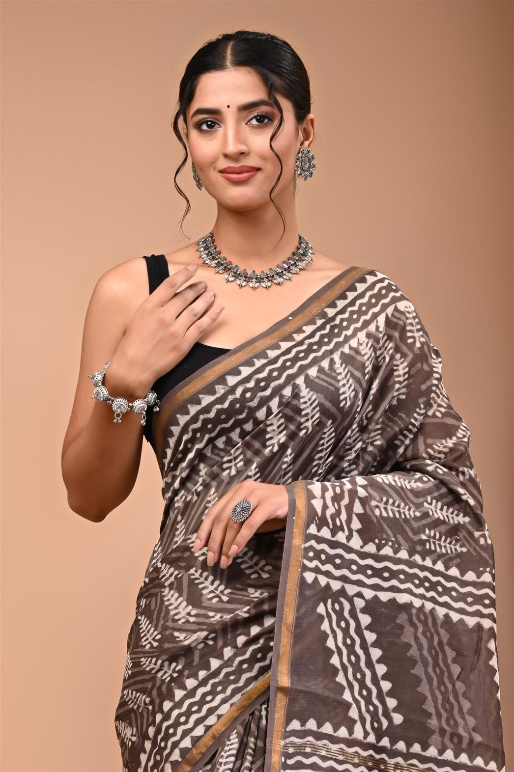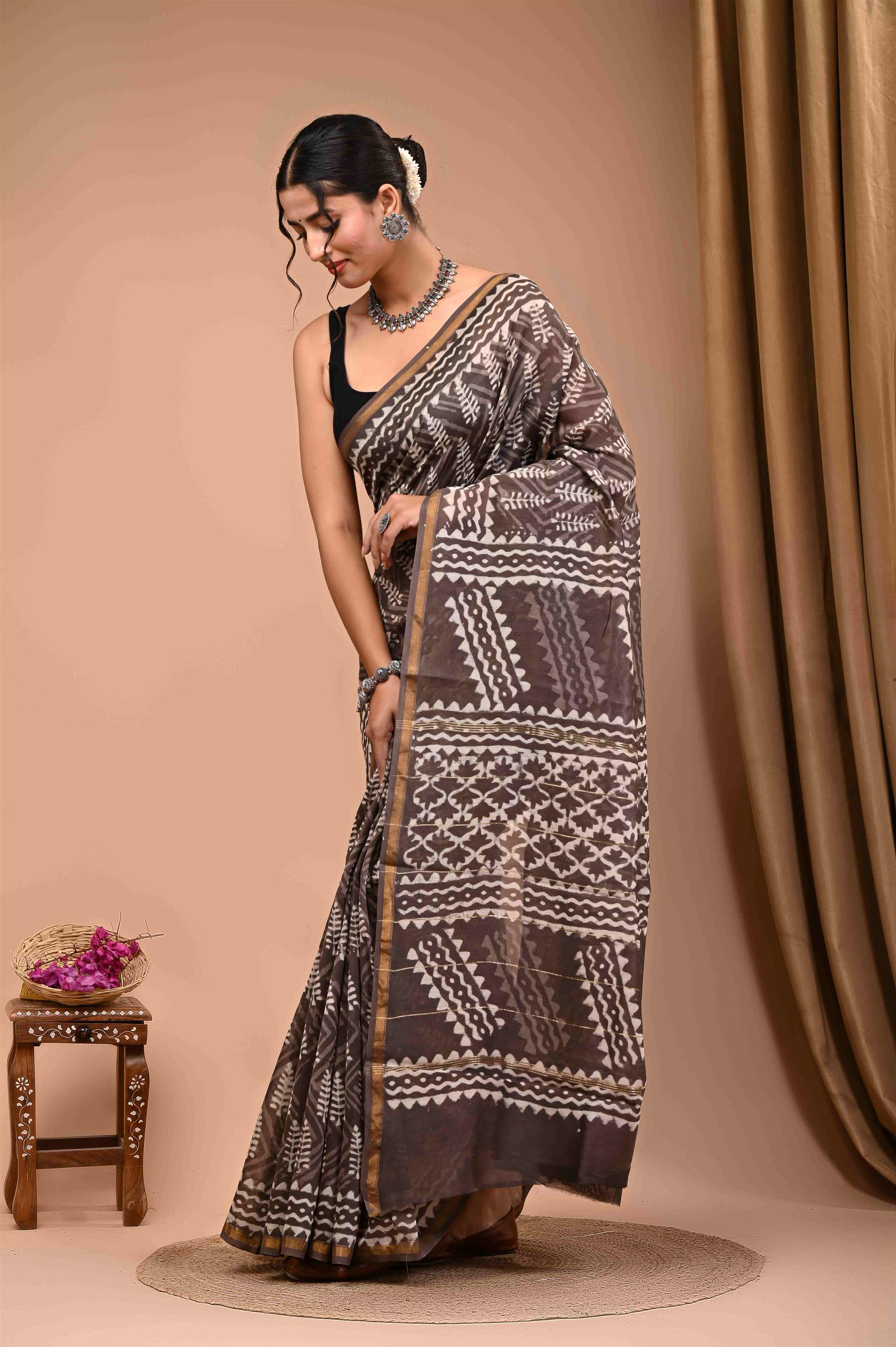 This saree features a coffee brown base adorned with white geometric and leaf patterns, giving it a chic ethnic appeal.