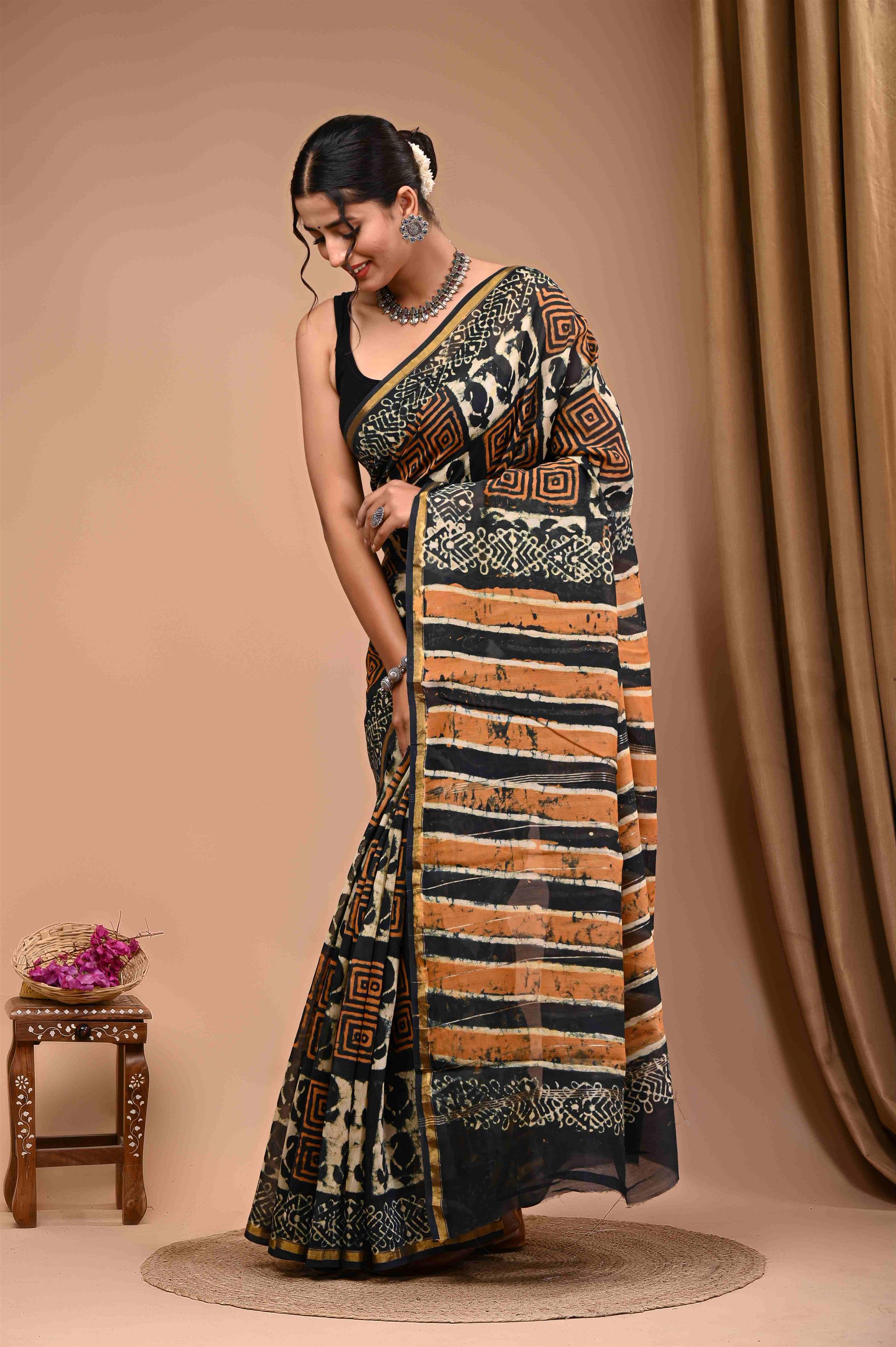WOMENS BLACK WITH MIX WHITE AND ORANGE CHANDERI SILK SAREE