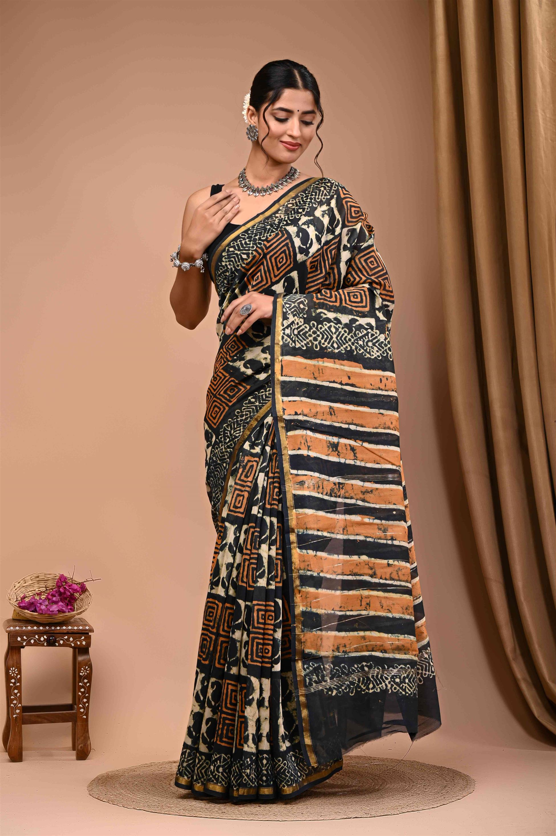 The image depicts a woman wearing a traditional Indian saree, standing in a studio setting. She is dressed in a black, white, and orange saree with intricate patterns and designs. Her dark hair is pulled back, and she accessorizes with silver jewelry, including a necklace, earrings, and bangles. The woman stands on a circular rug, with her hands placed on her chest and waist. To her left, a small wooden stool holds a wicker basket containing pink flowers. The background features a beige wall and a brown curtain to the right.