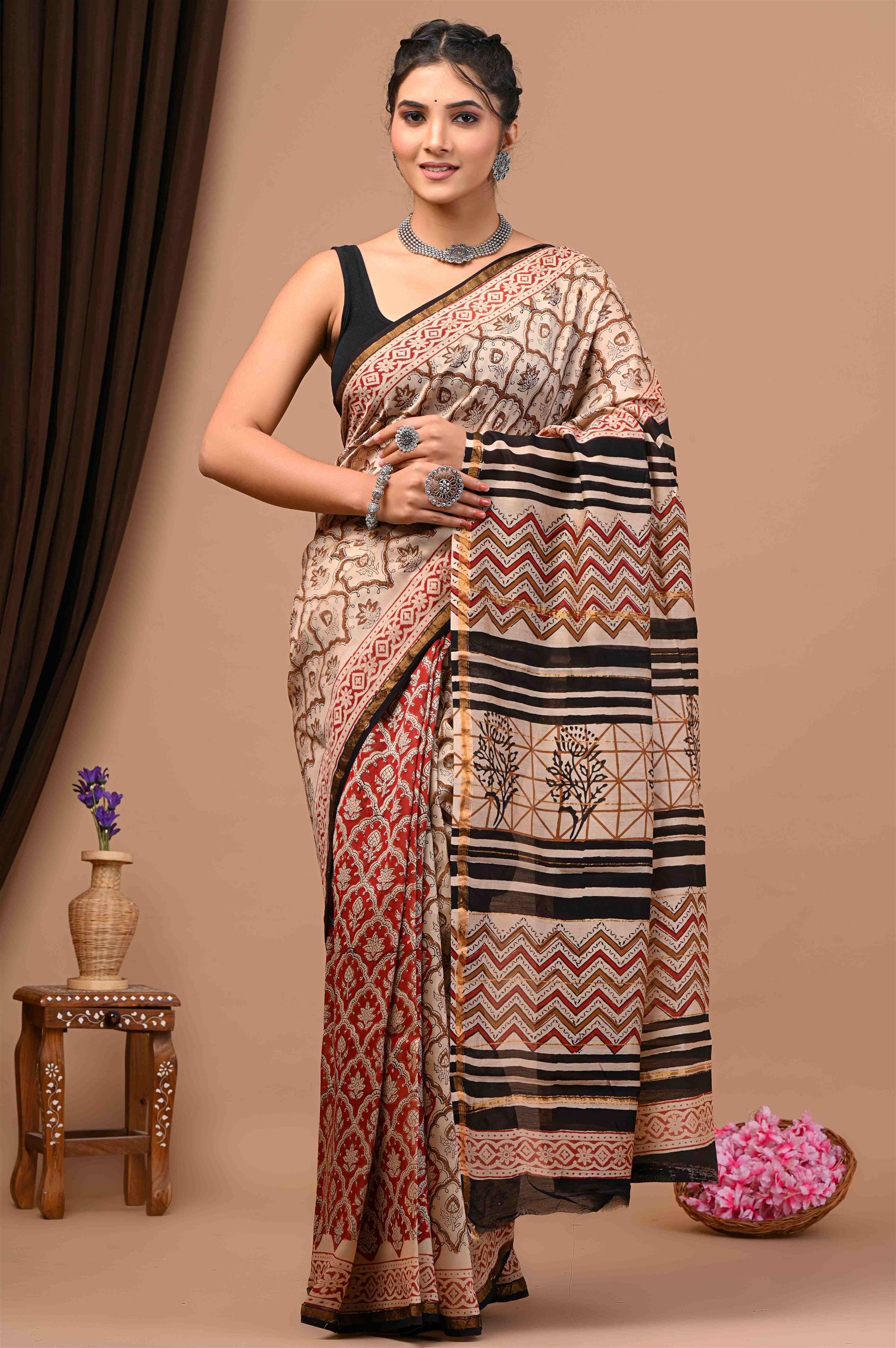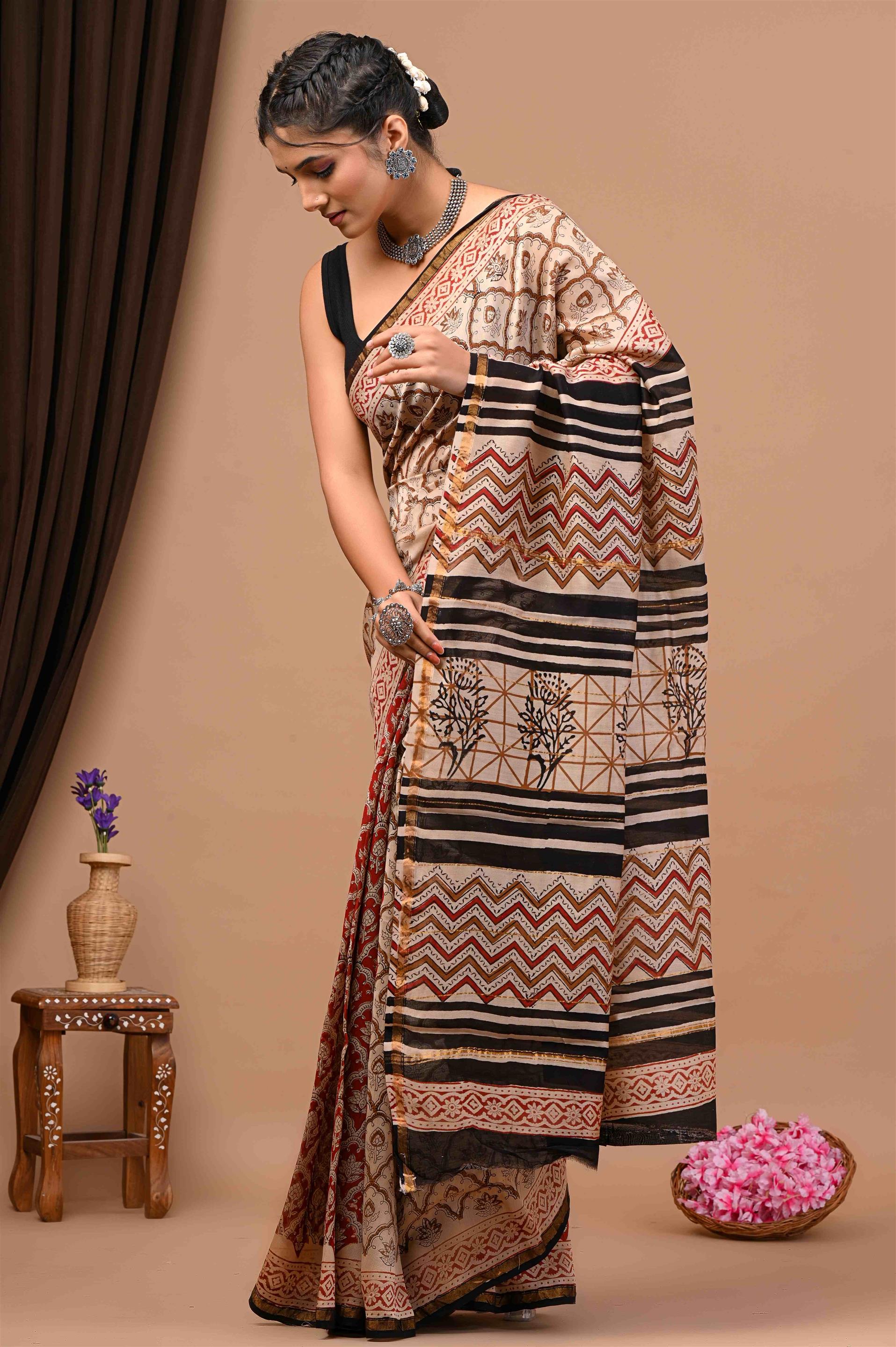 The saree is draped elegantly by the woman, showcasing a mix of beige, red, black, and brown patterns. It features various designs like zigzags, stripes, floral motifs, and geometric patterns. The saree has a black border with golden accents, adding to its appeal. The woman has paired it with a black sleeveless blouse and accessorized with silver jewelry like a necklace, earrings, bangles, and rings ??. The overall look is complemented by the beige background with a brown curtain, a wooden stool with purple flowers, and a bowl of pink flowers ??.
