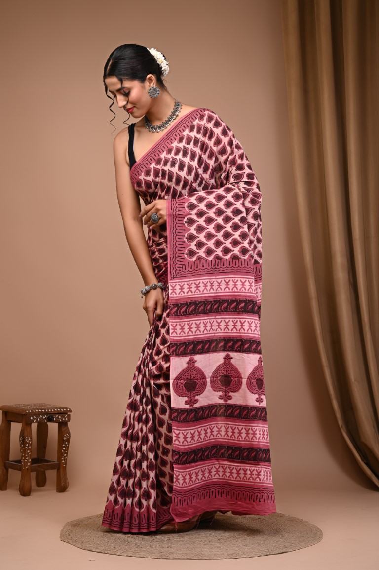 Vanaspati Ajrakh hand block printed cotton Mulmul sarees Size Saree = 5.5 mtr Blouse = 0.80 mtr