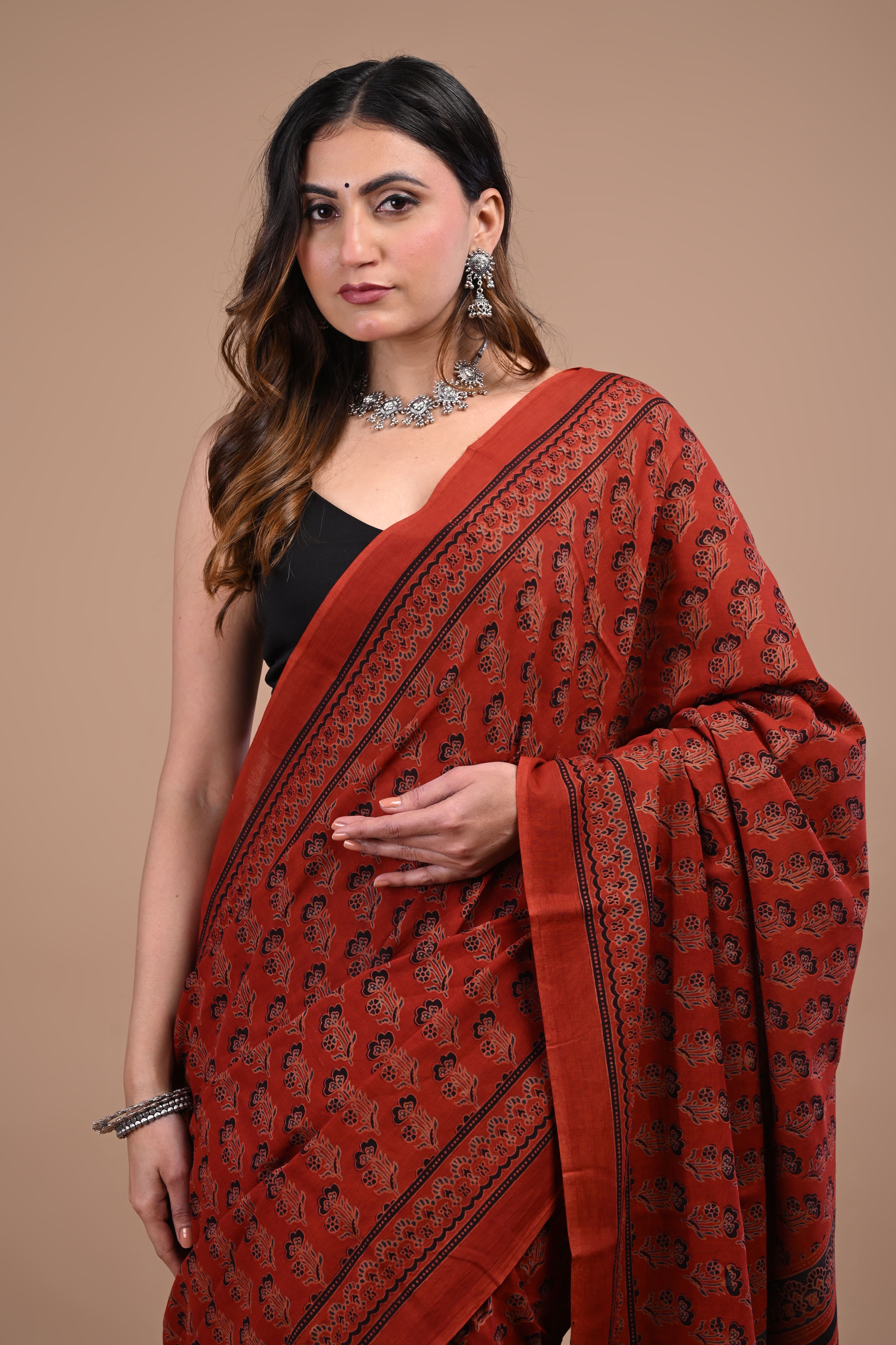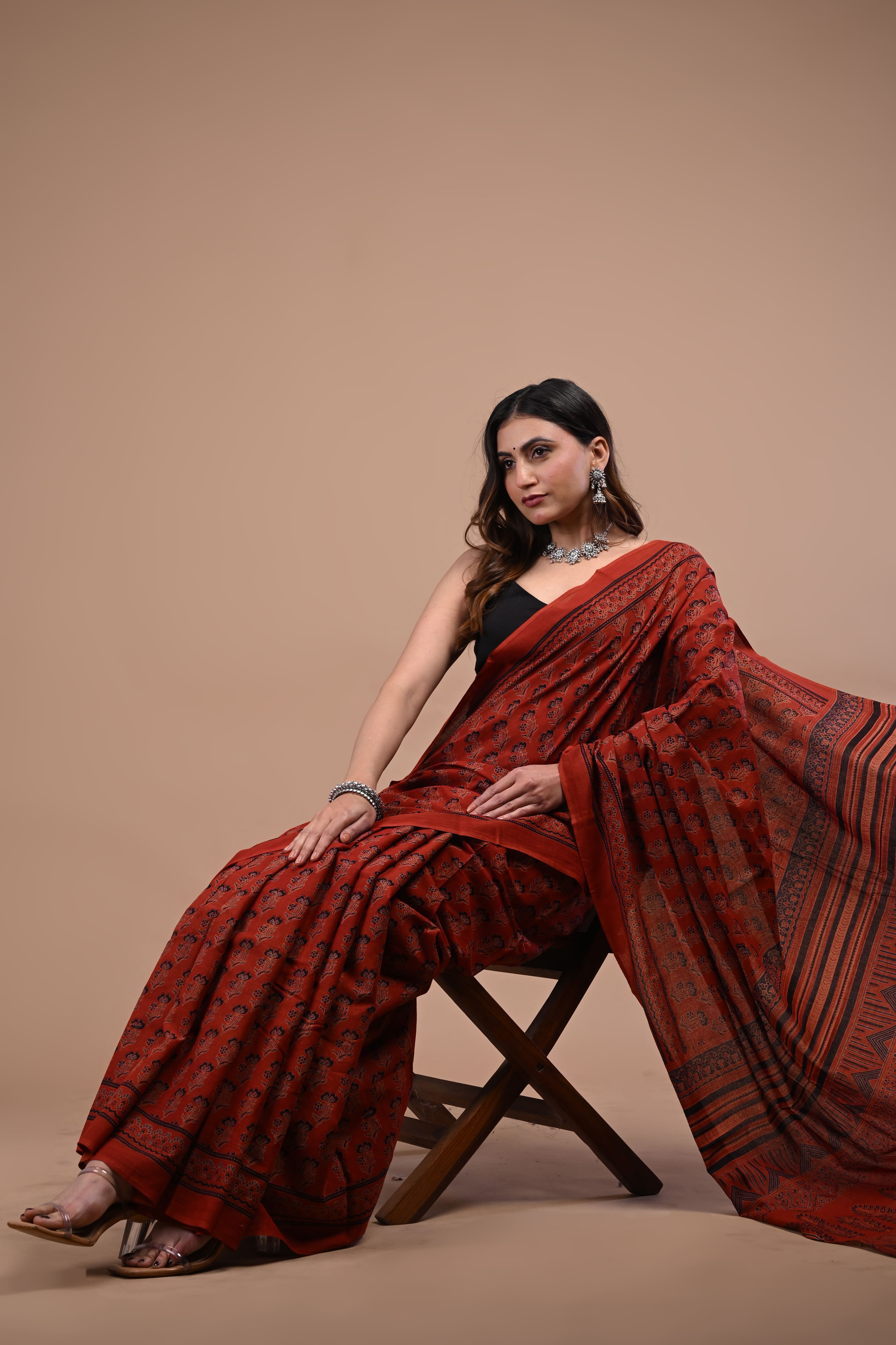 Vanaspati Ajrakh hand block printed cotton Mulmul sarees Size Saree = 5.5 mtr Blouse = 0.80 mtr