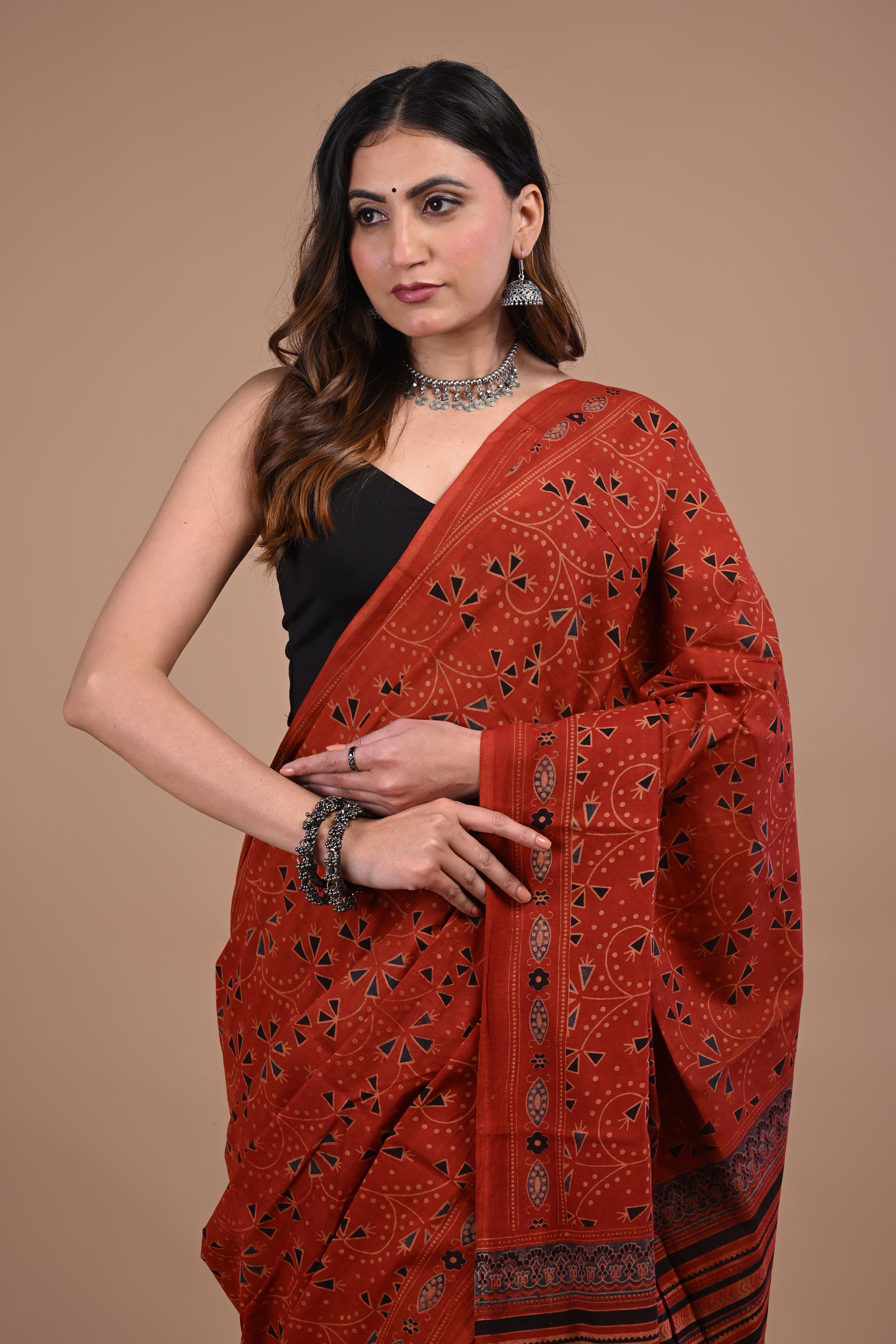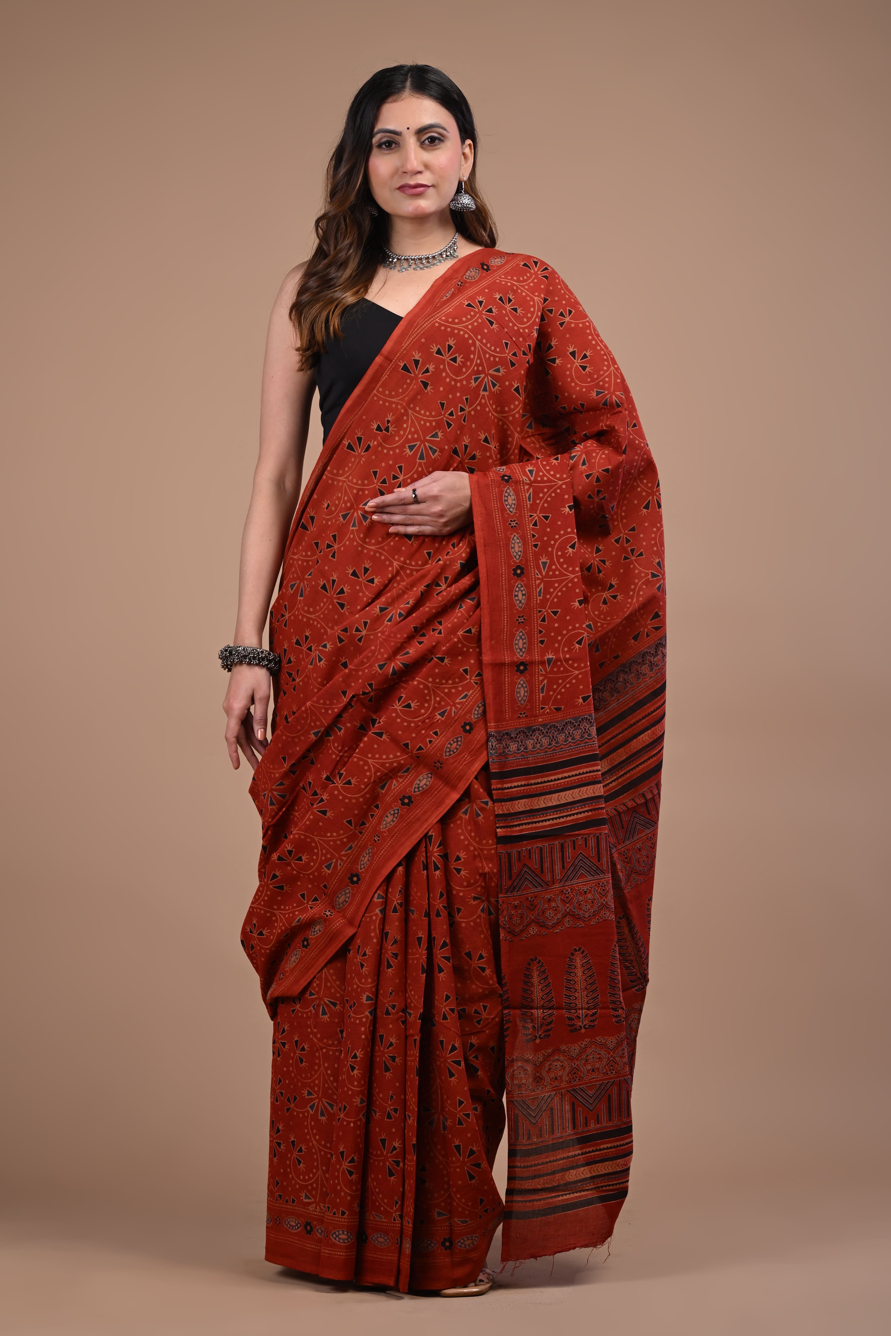 Vanaspati Ajrakh hand block printed cotton Mulmul sarees Size Saree = 5.5 mtr Blouse = 0.80 mtr