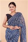 The saree is blue with a gold pattern. It's draped elegantly on the woman, and has a blue border with gold accents. The saree seems to be made of a lightweight fabric, possibly chiffon or georgette, given its flowy look. ??
