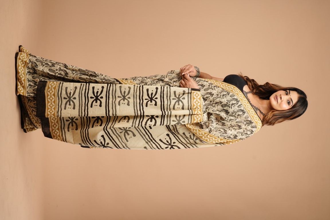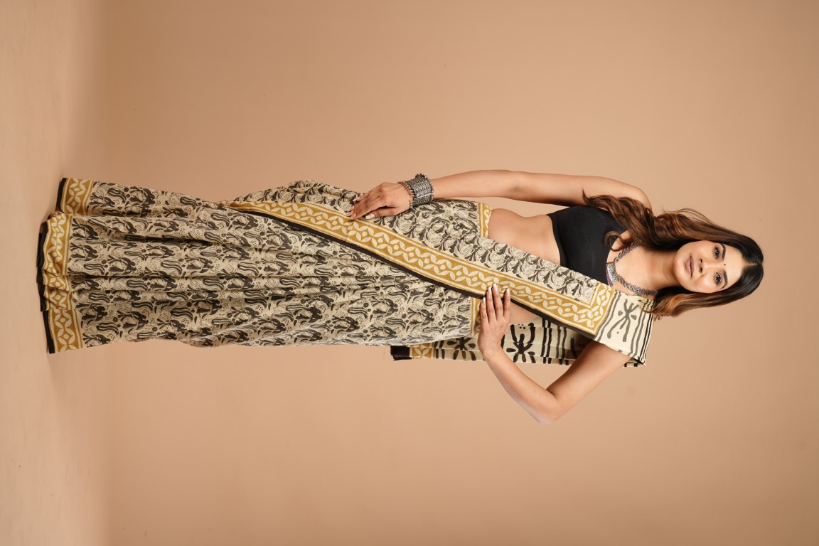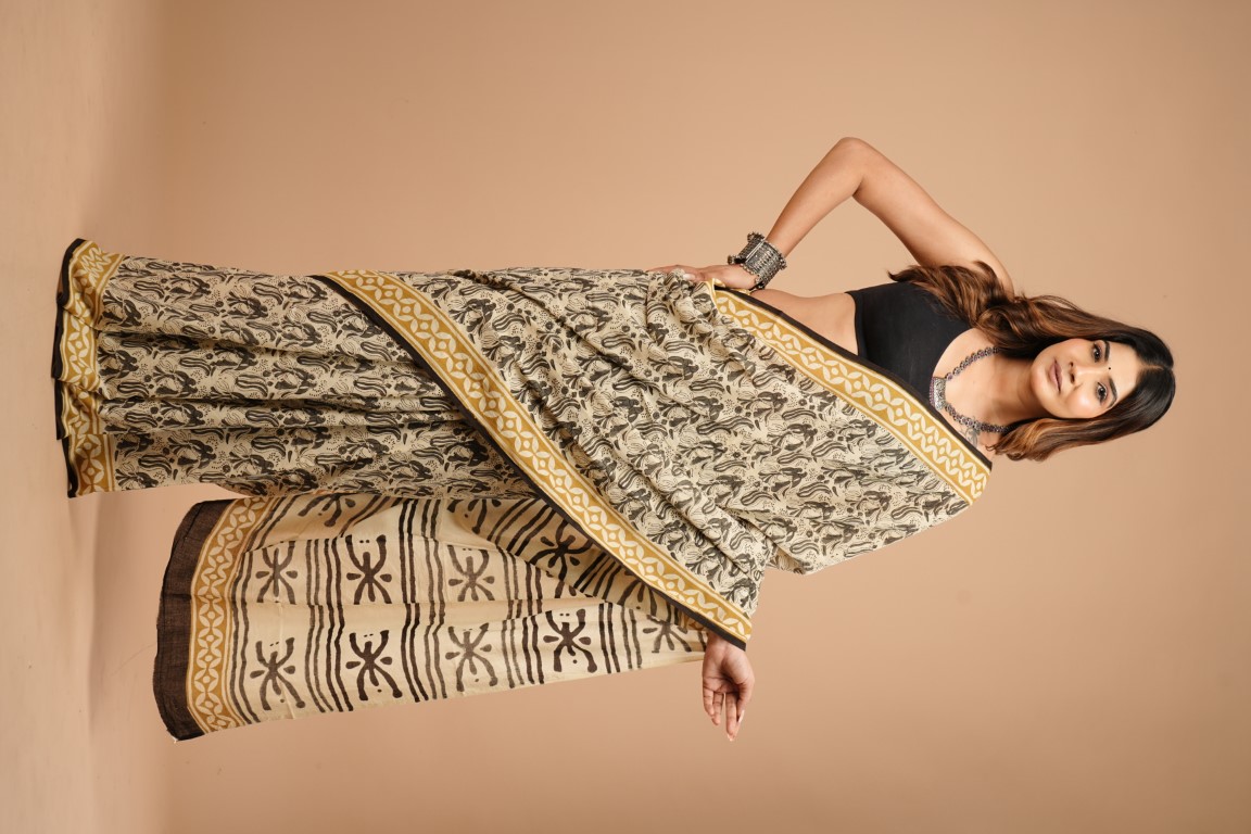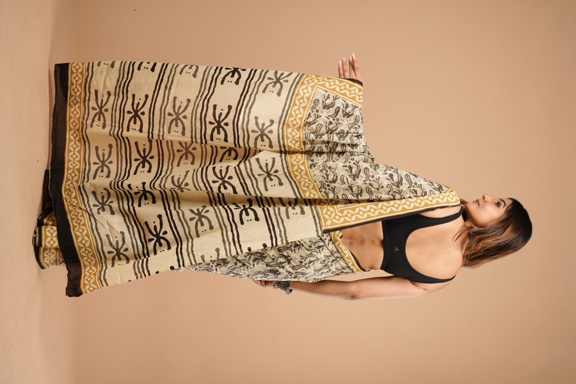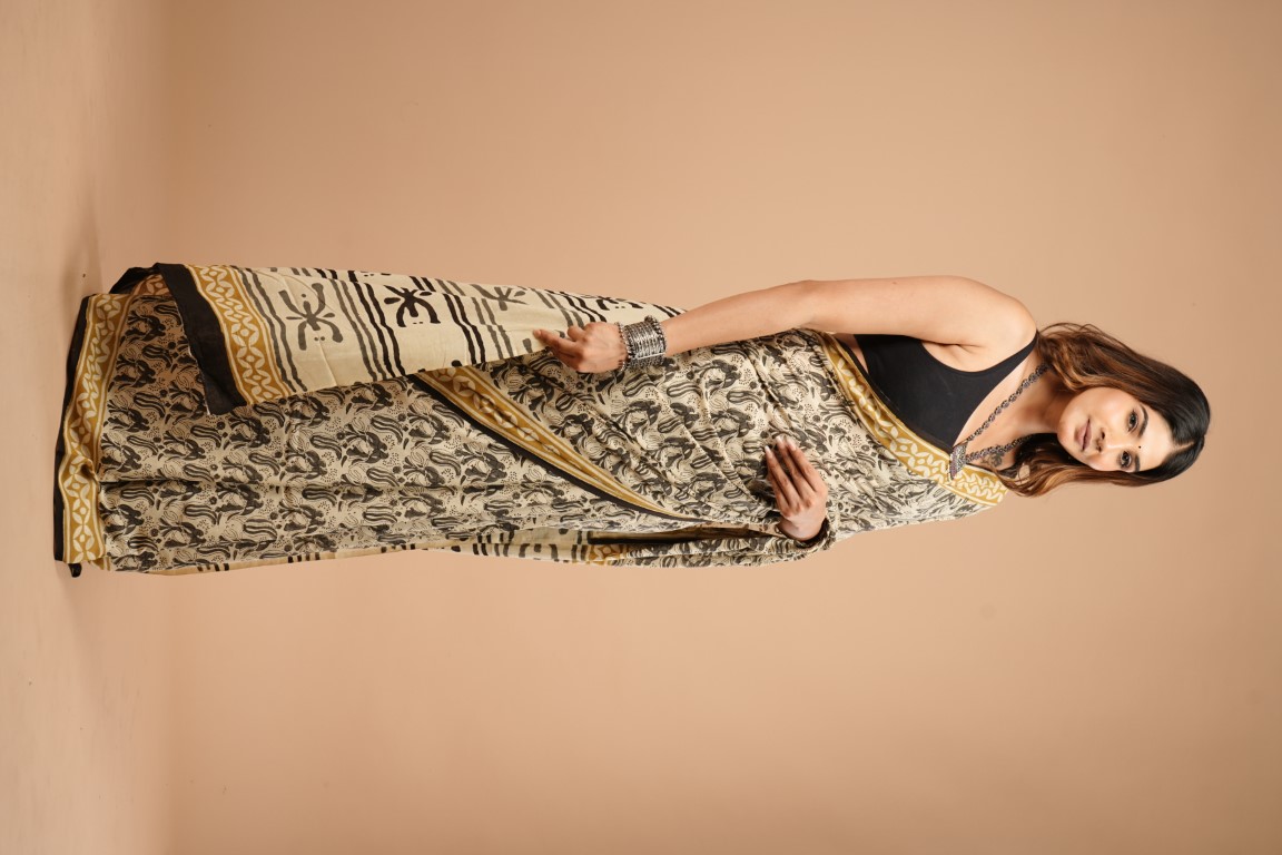 The saree in the image is primarily beige with black and gold accents. It features a bagru print design with black patterns on the beige fabric, complemented by gold borders. The woman is wearing it with a black blouse. Based on the description of the print and the look of the fabric, it appears to be a cotton hand saree with bagru print. ??