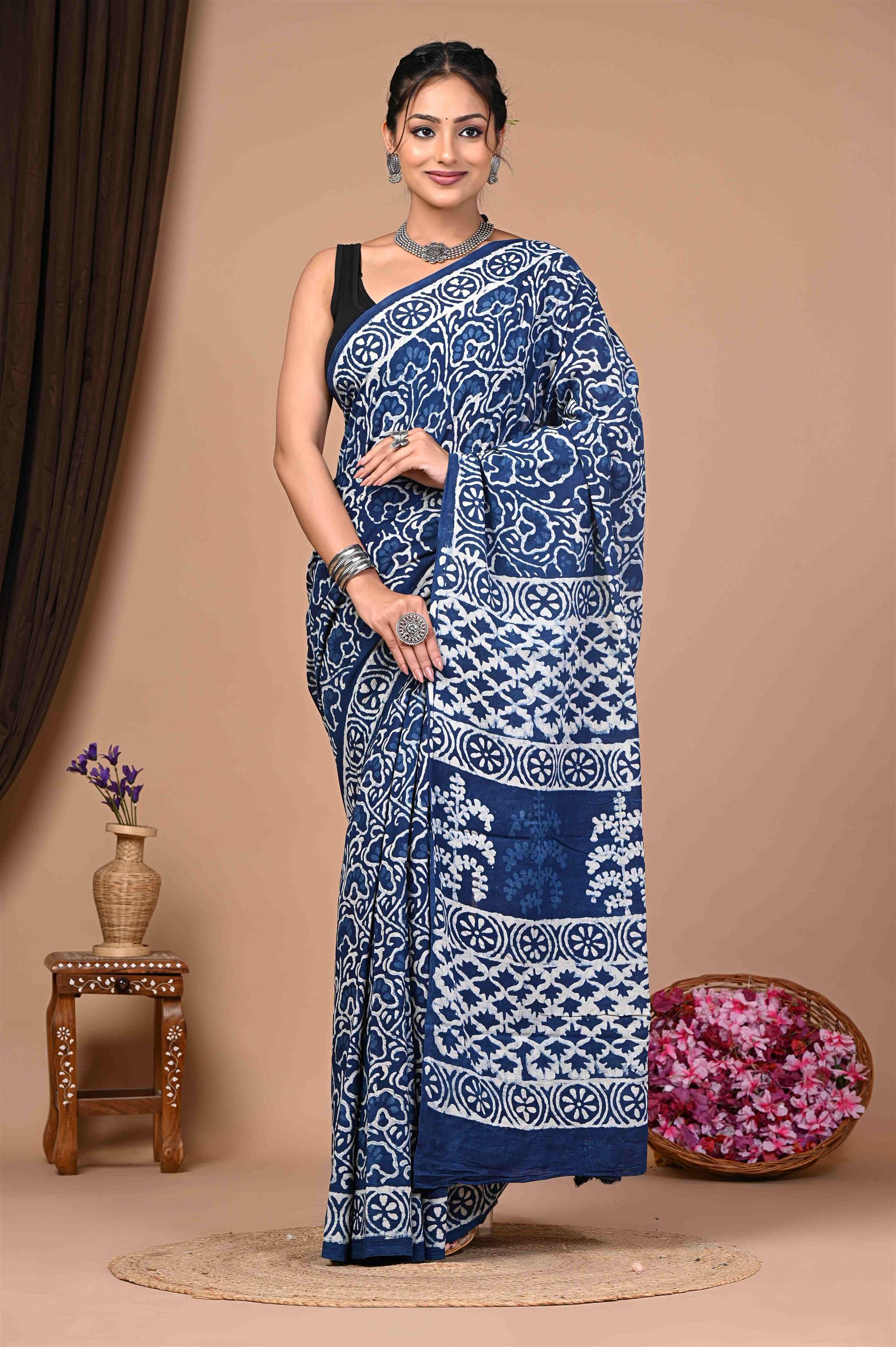 The woman in the image is wearing a blue and white saree with intricate patterns and designs. The saree is draped elegantly around her body, with a black sleeveless blouse underneath. The blue and white colors are complementary, creating a visually appealing contrast. The saree appears to be made of a lightweight material, possibly cotton or silk, and is draped in a traditional Indian style. The overall effect is one of elegance and sophistication, with the saree being the focal point of the image. The woman's accessories, including her jewelry and hairstyle, complement the saree nicely, adding to the overall aesthetic of the image.