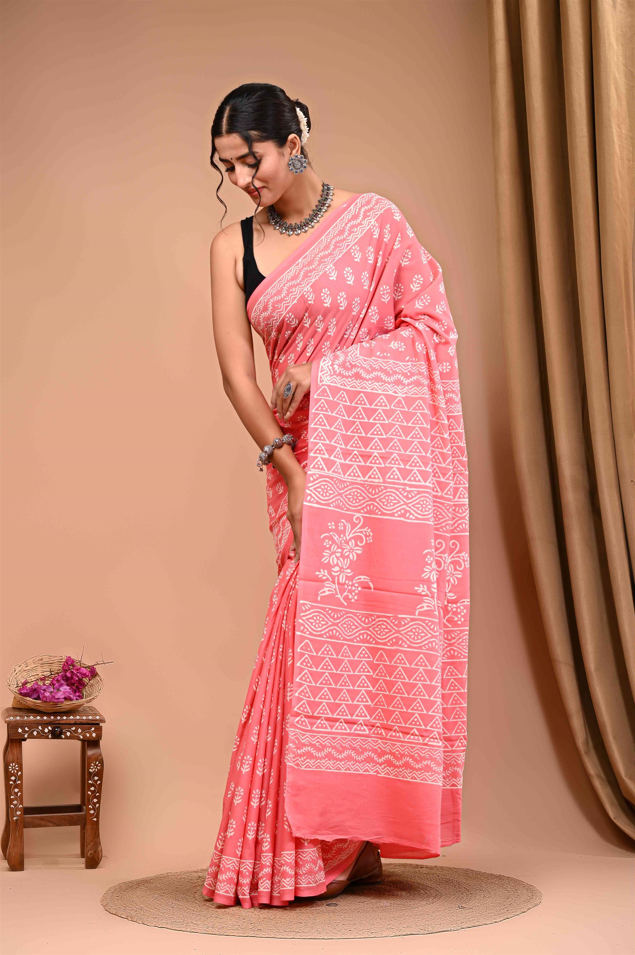 The saree is a beautiful shade of pink, adorned with intricate white designs and patterns. The fabric appears to be lightweight and flowing, draping elegantly around the woman's body. The saree features a unique blend of motifs, including leaf patterns and other traditional Indian designs, which add a touch of cultural heritage to the overall look. The white designs on the saree complement the pink color perfectly, creating a stunning visual effect. The saree is paired with a black sleeveless blouse, and the overall ensemble is accessorized with silver jewelry, including a necklace, earrings, and bangles, which add a touch of sophistication to the look.