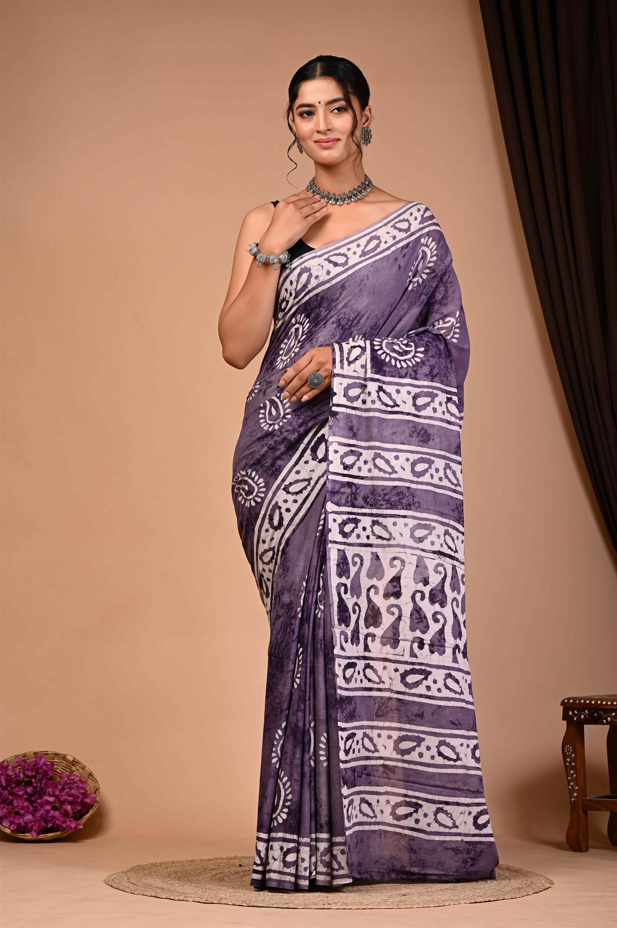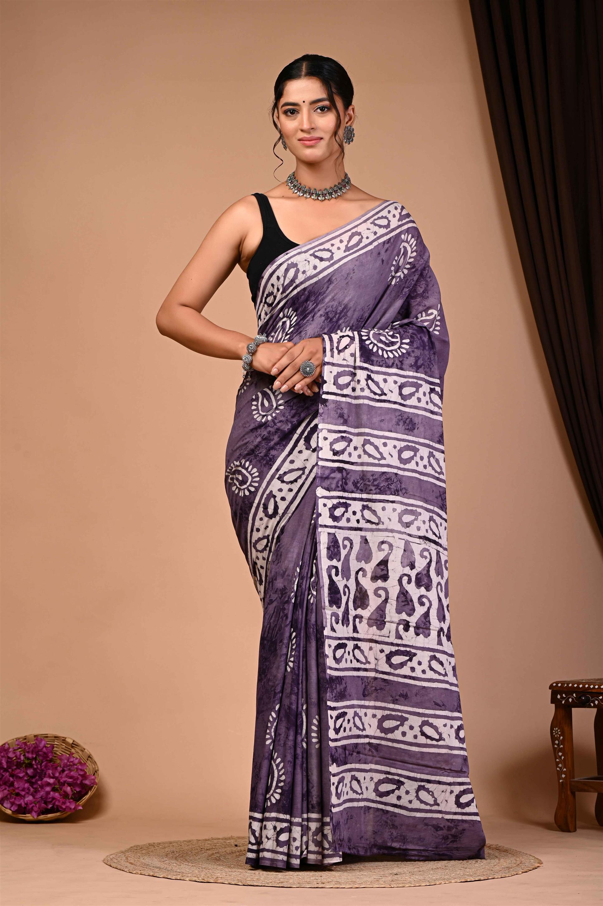 The saree is a beautiful shade of purple with intricate white designs and patterns. The fabric appears to be lightweight and flowing, draping elegantly around the woman's body. The saree features a unique blend of motifs, including geometric and floral patterns, which add a touch of cultural heritage to the overall look. The white designs on the saree complement the purple color perfectly, creating a beautiful visual effect. The saree is paired with a black sleeveless blouse, and the overall ensemble is accessorized with silver jewelry, including a necklace, earrings, and a bangle, which add a touch of sophistication to the look.