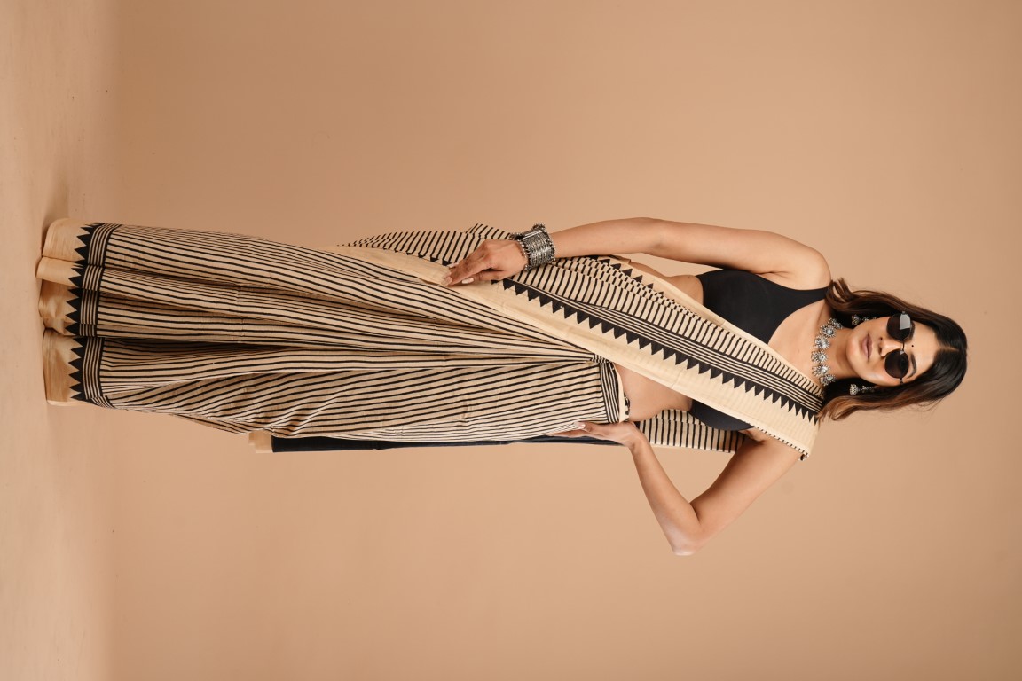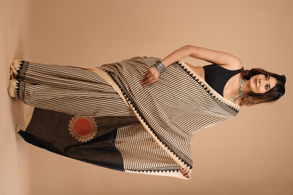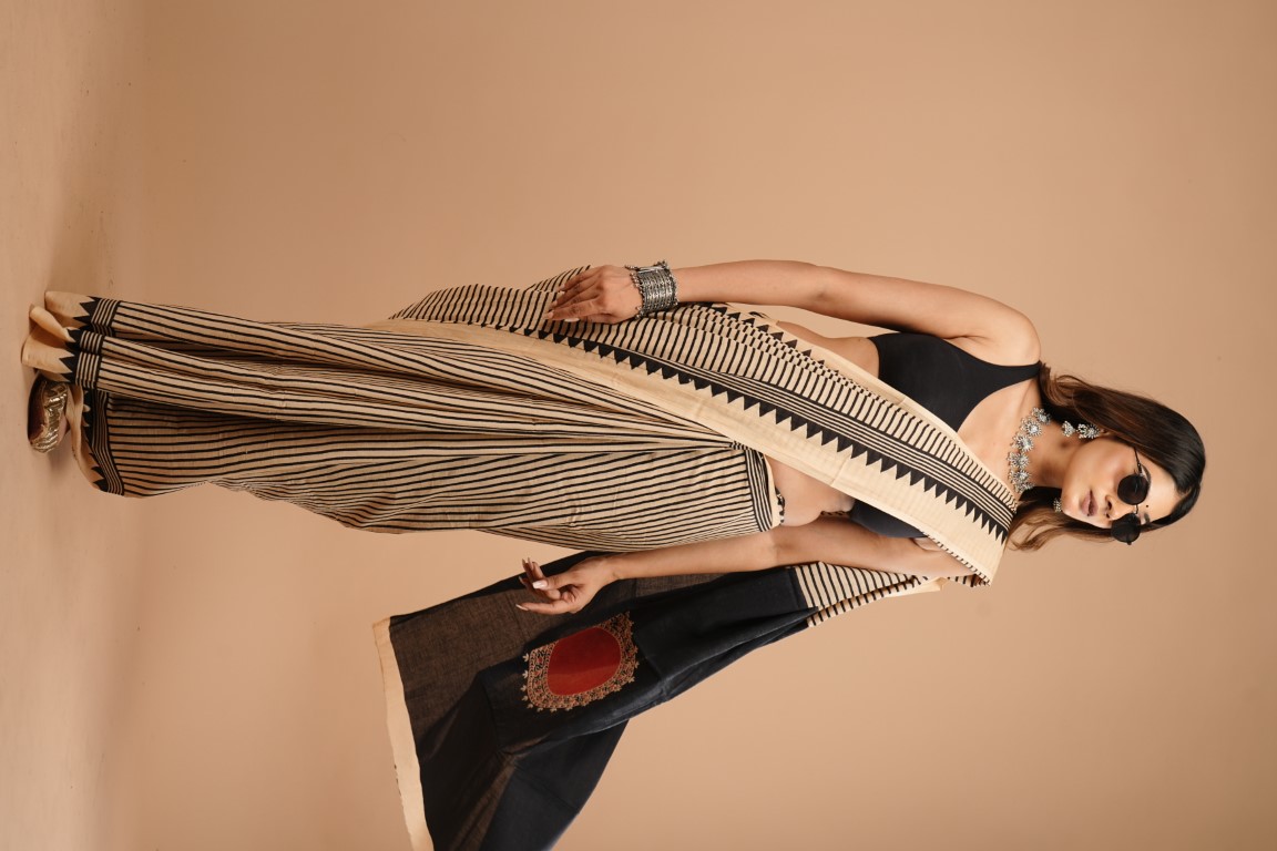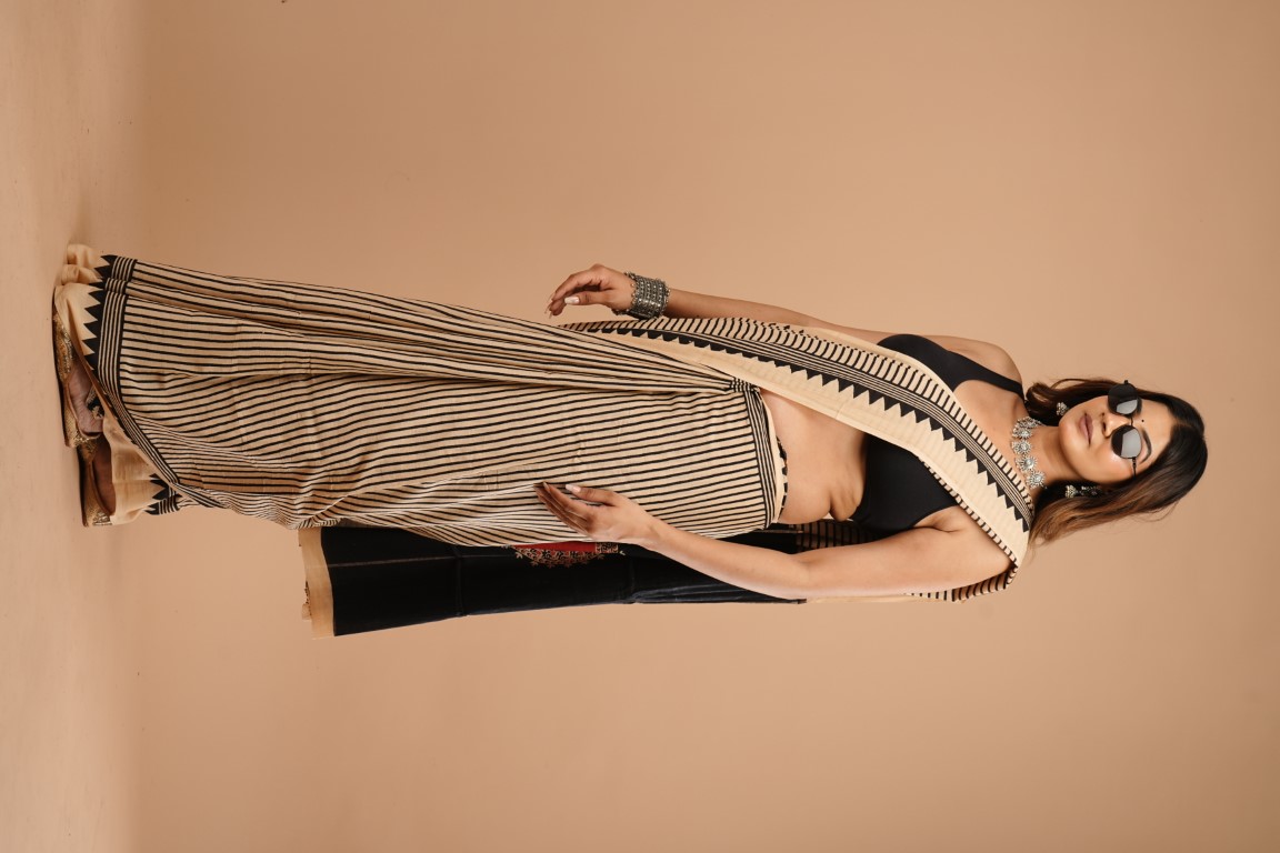 The saree is beige with black stripes and has a border with black triangles and stripes. It's paired with a black sleeveless blouse and accessorized with silver jewellery like a necklace, earrings, and bangles.