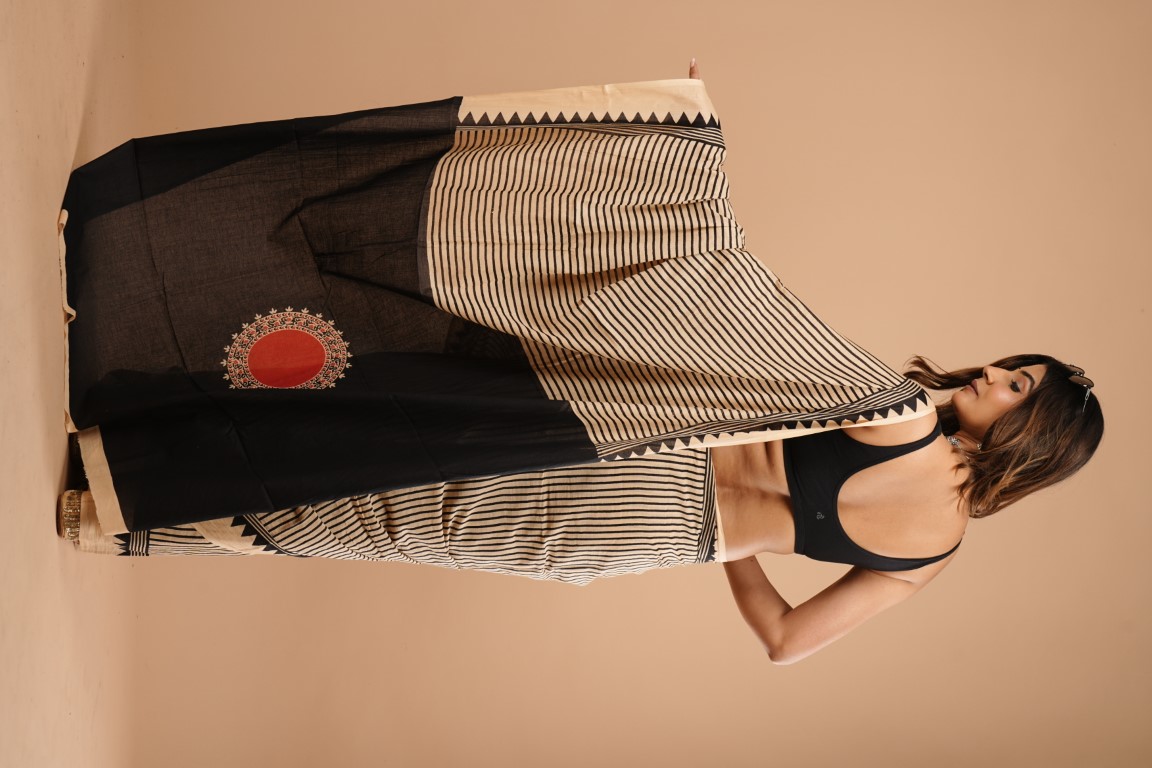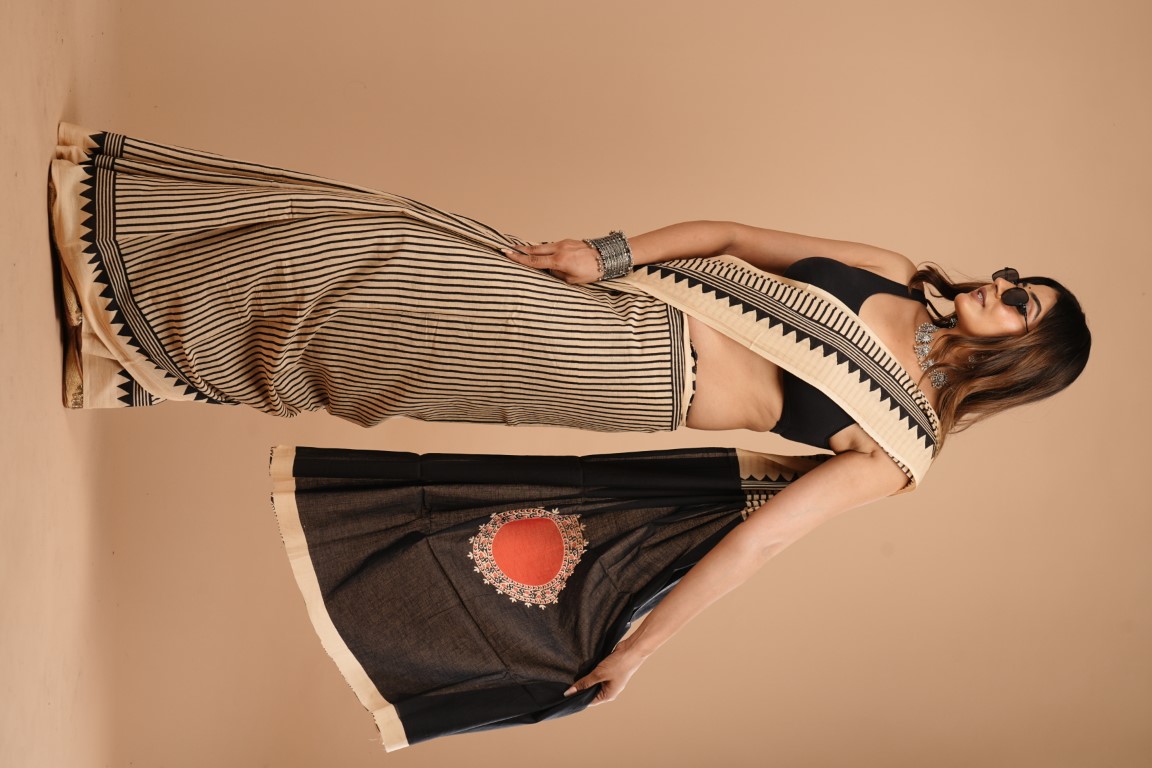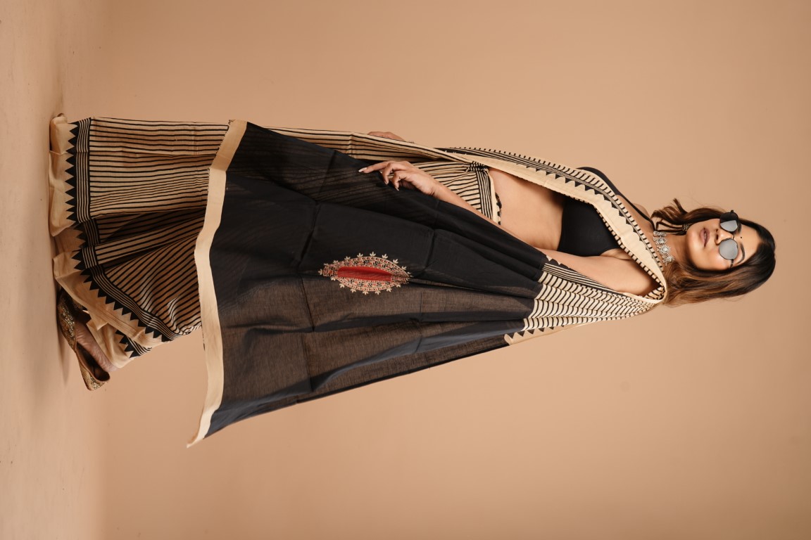 WOMENS BEIGEV WITH BLACK COTTON SAREE