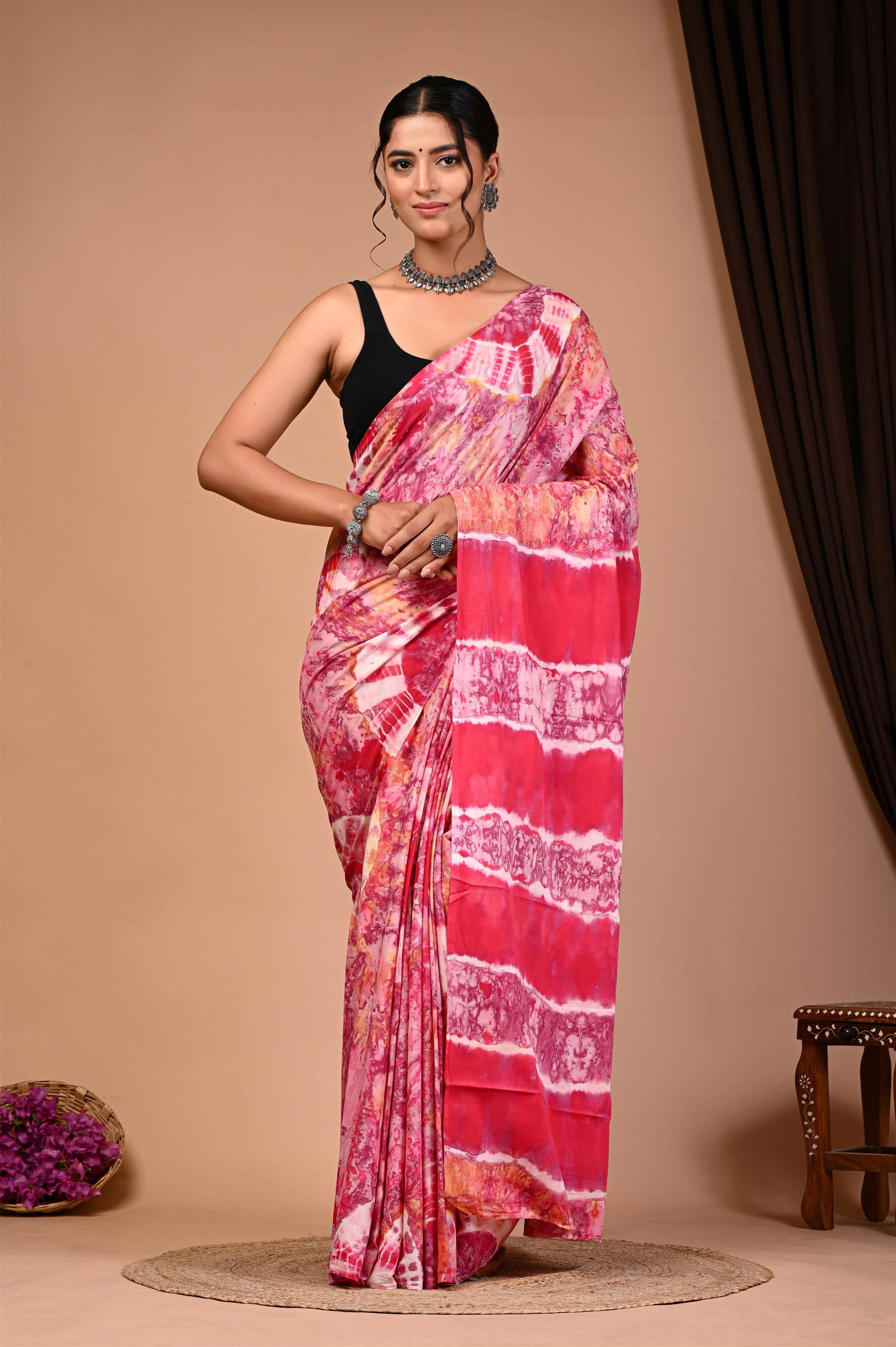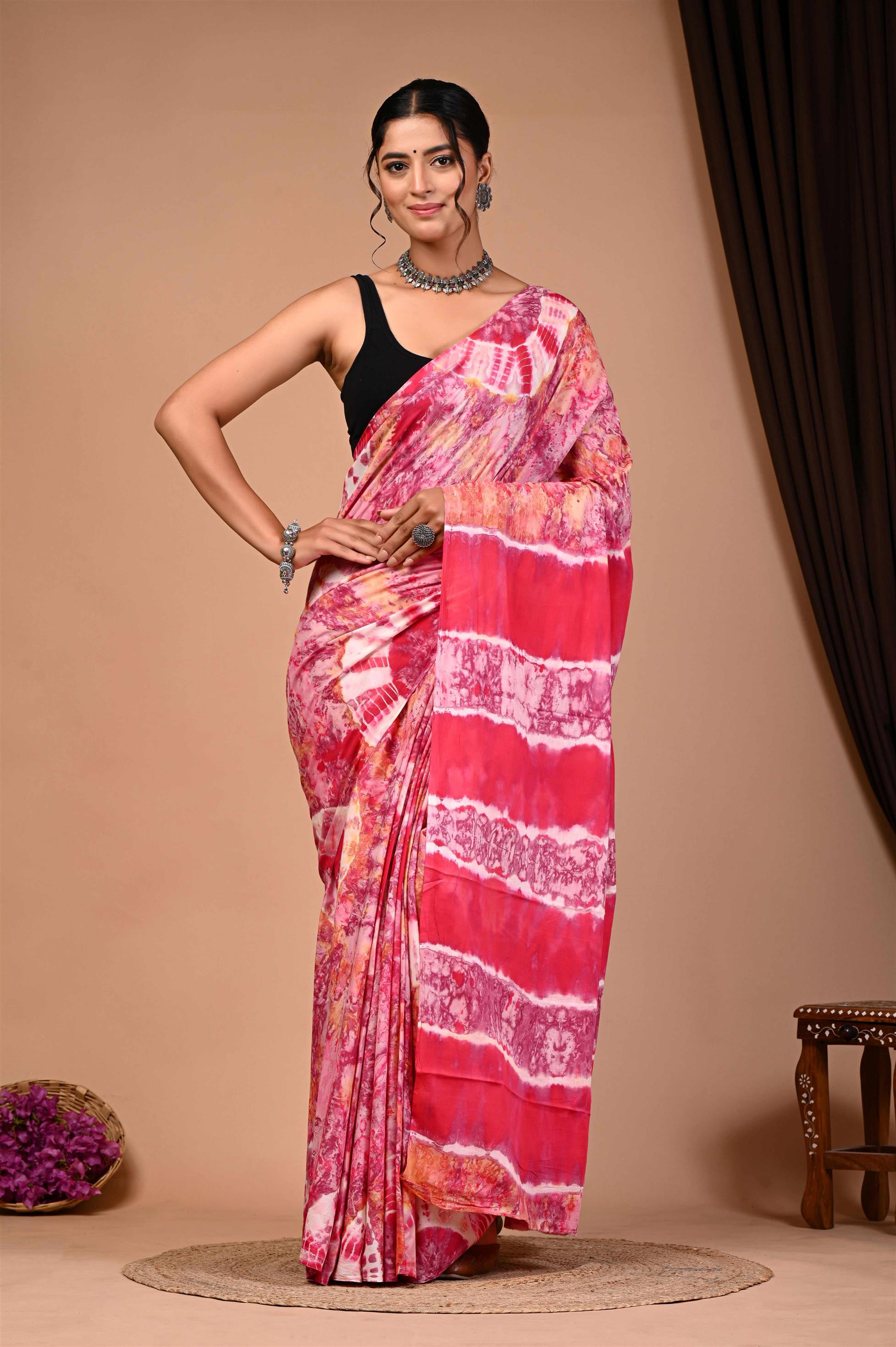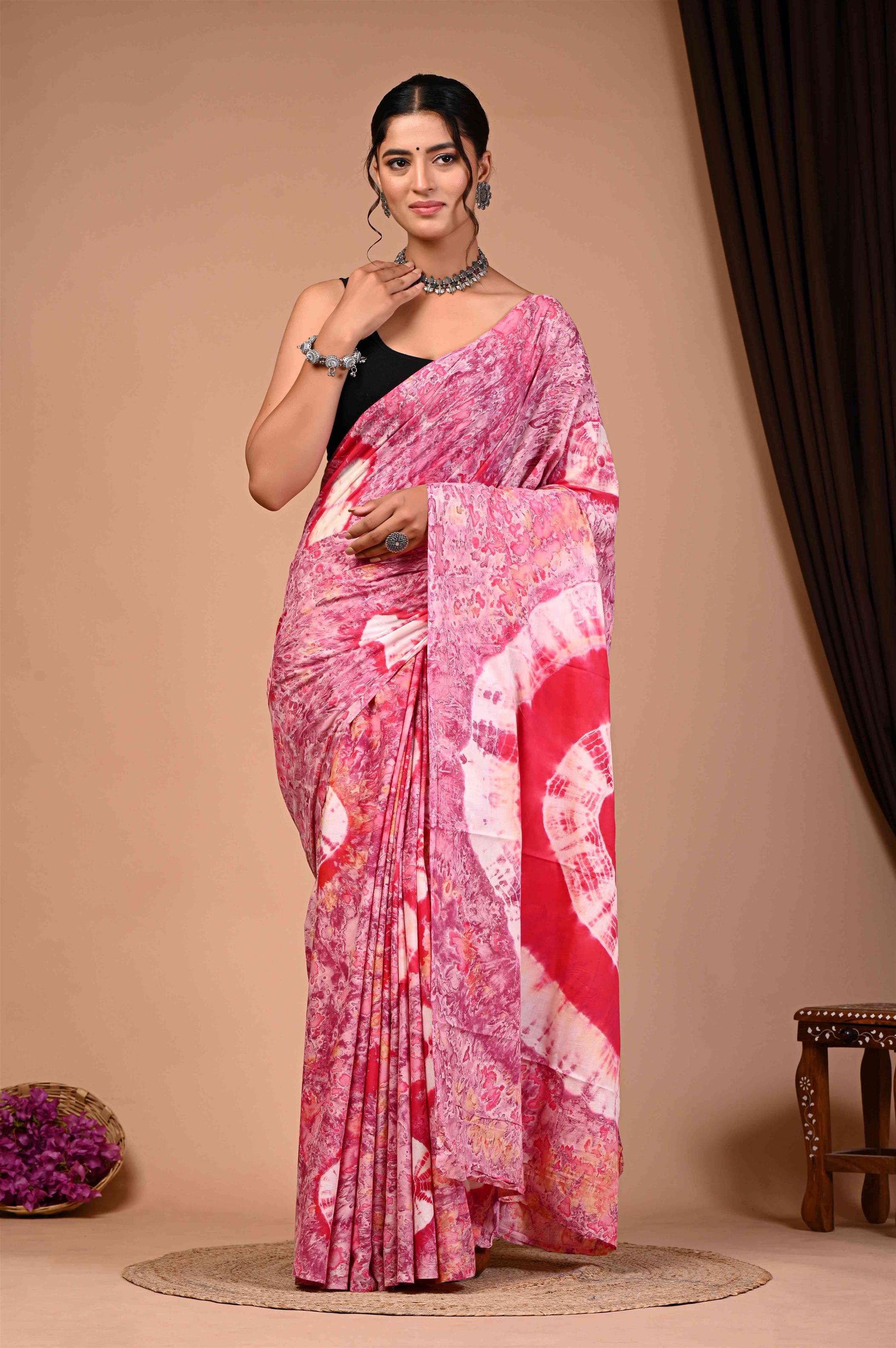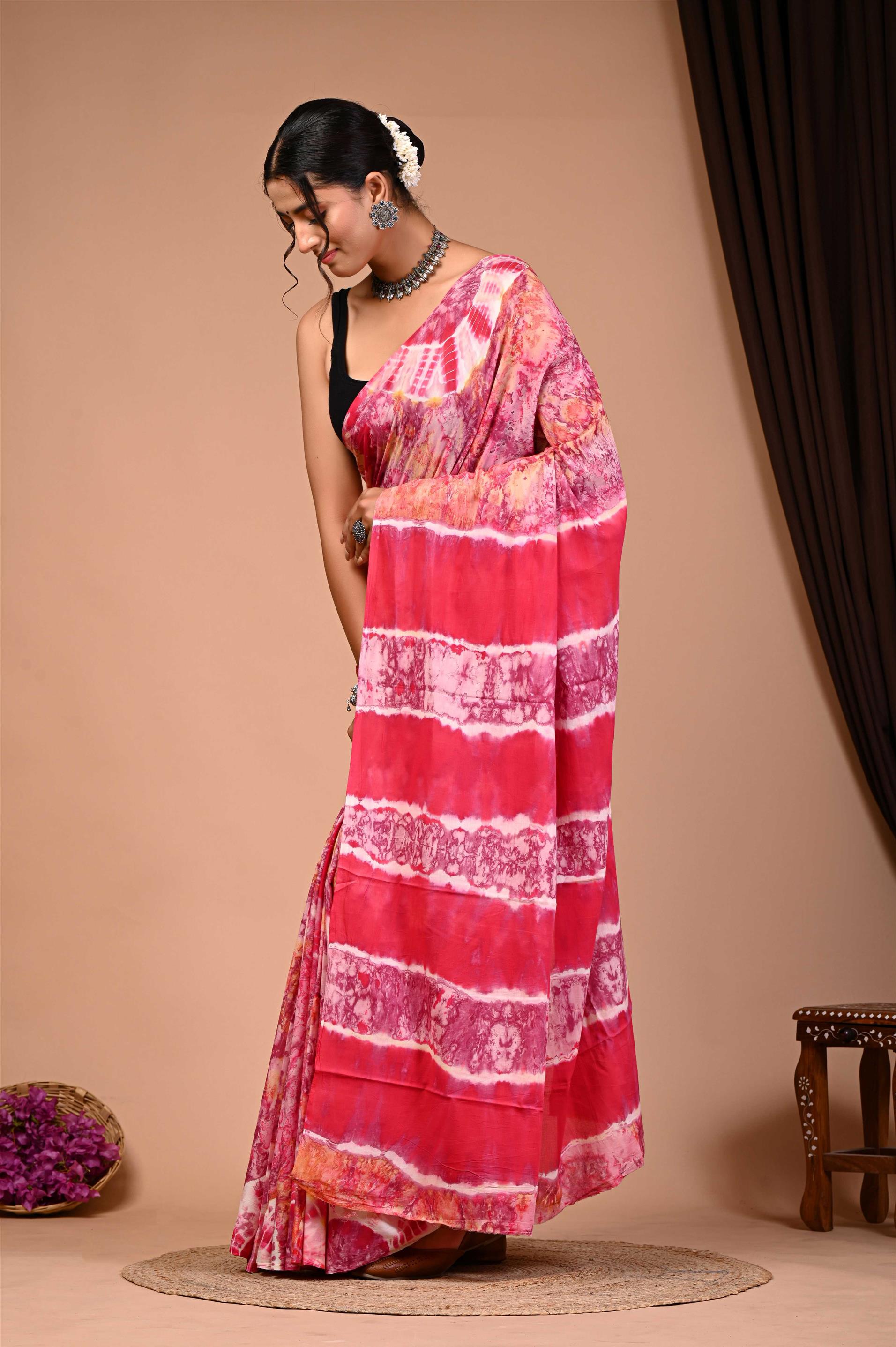 The saree in the image is a vibrant pink and red tie-dye saree with intricate patterns. The saree is draped elegantly around the woman, showcasing its unique design and color palette. The tie-dye effect gives the saree a distinctive and eye-catching appearance, making it a stunning piece of traditional Indian attire. The saree is paired with a black blouse, which provides a striking contrast to the bright colors of the saree. Overall, the saree is a beautiful representation of Indian fashion and culture.