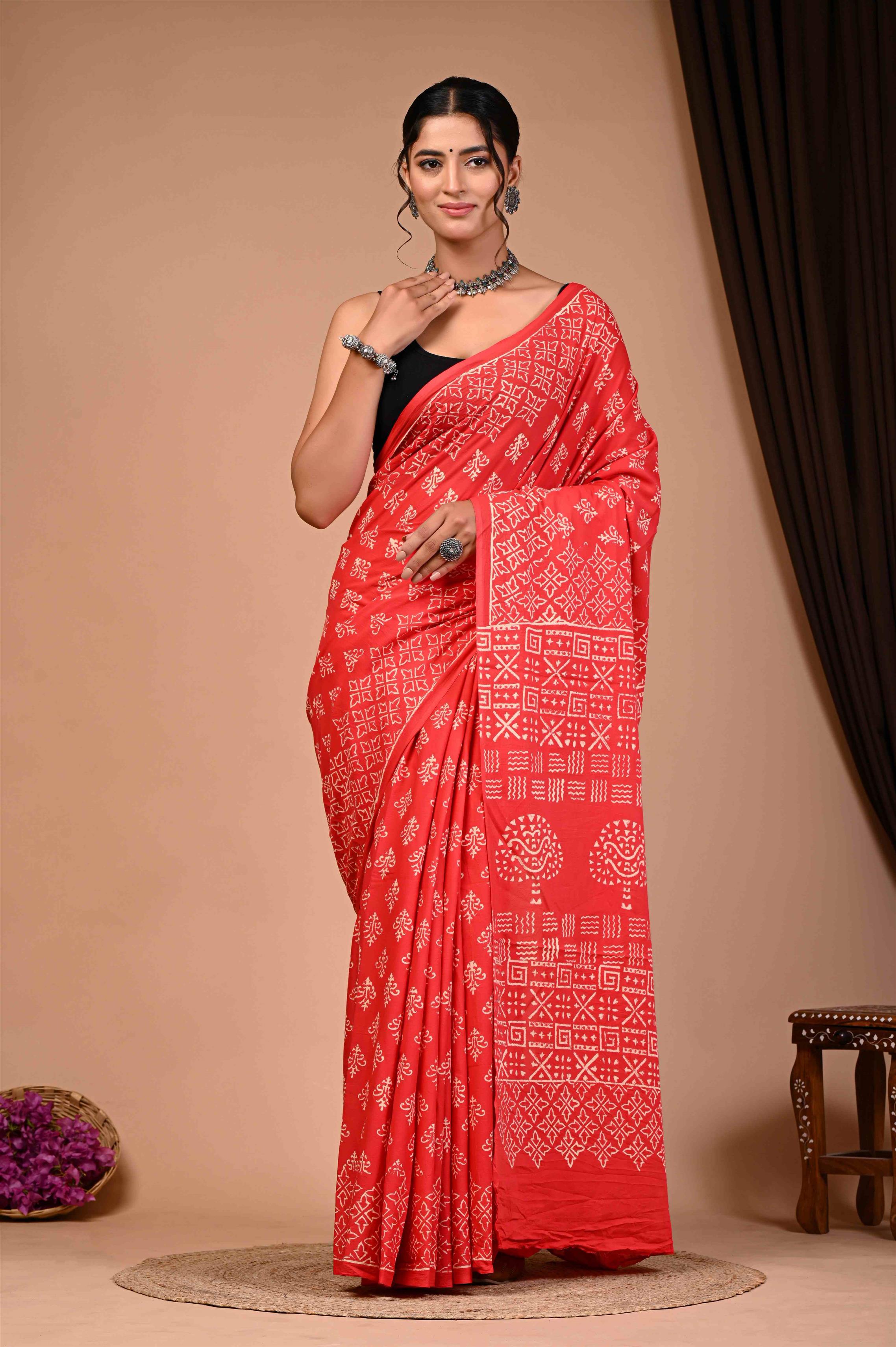 The saree in the image is a vibrant red color with intricate white patterns. The woman is draped elegantly in the saree, which is paired with a black sleeveless blouse. The saree's design features a variety of white patterns, including geometric shapes and floral motifs, adding to its beauty and cultural significance. The overall look is stunning and showcases the traditional Indian attire in a modern and stylish way.