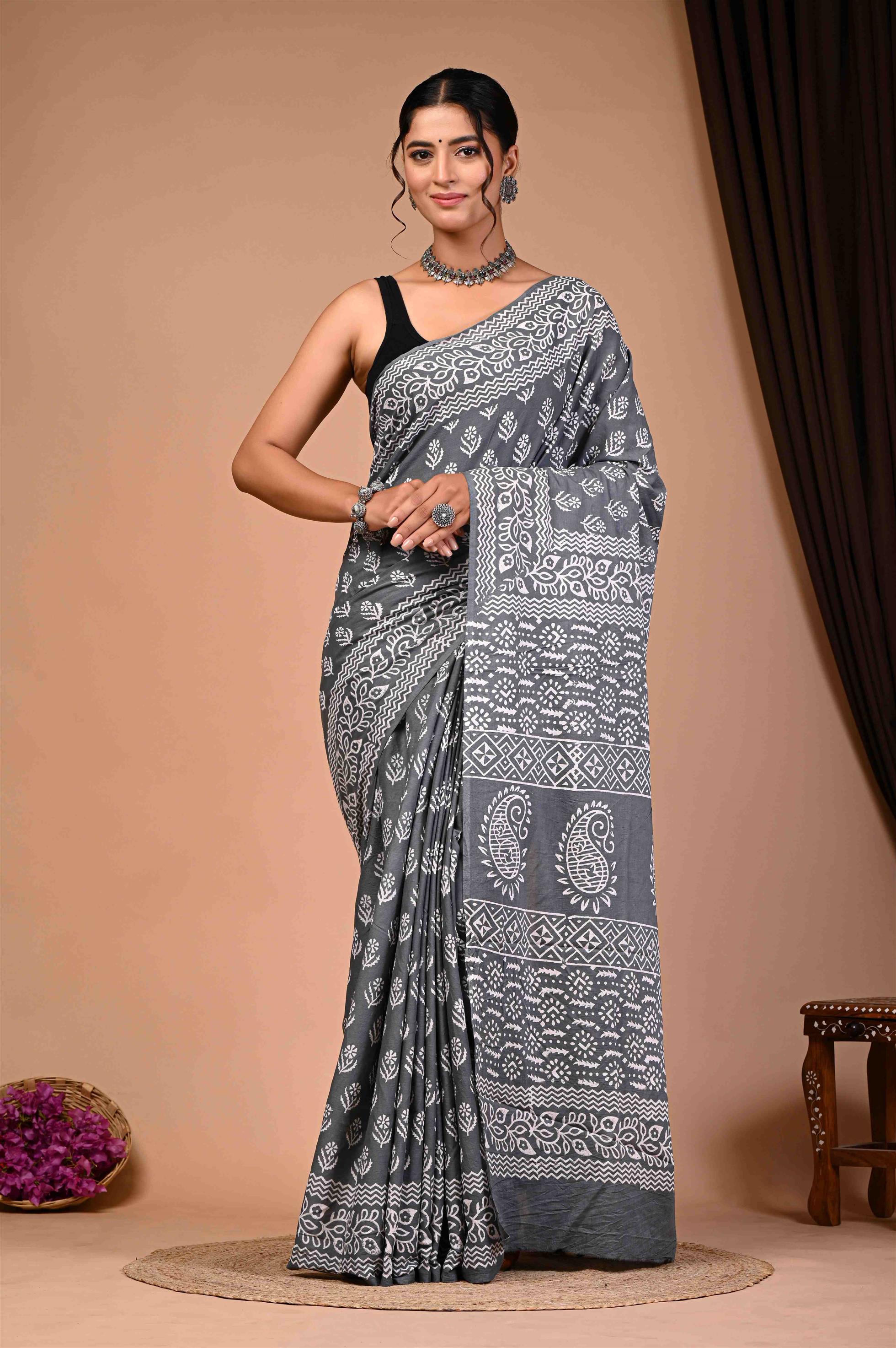 The saree is a beautiful gray and white ensemble, featuring intricate white patterns on a gray background. The design includes various motifs such as paisley, floral, and geometric shapes, adding to its elegance. The saree is draped elegantly around the woman, complemented by a black sleeveless blouse. The overall look is sophisticated and showcases traditional Indian attire with a modern twist.