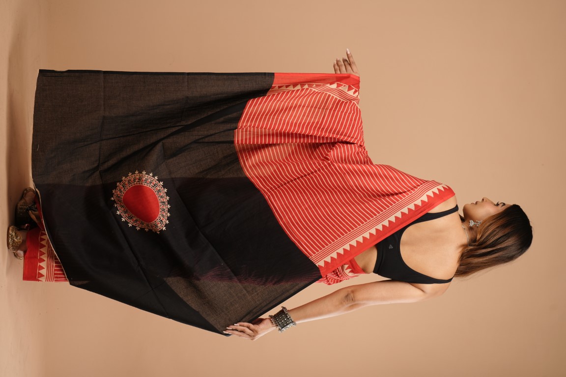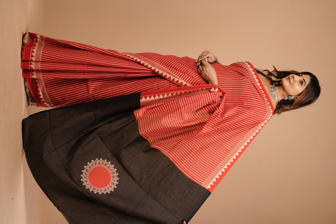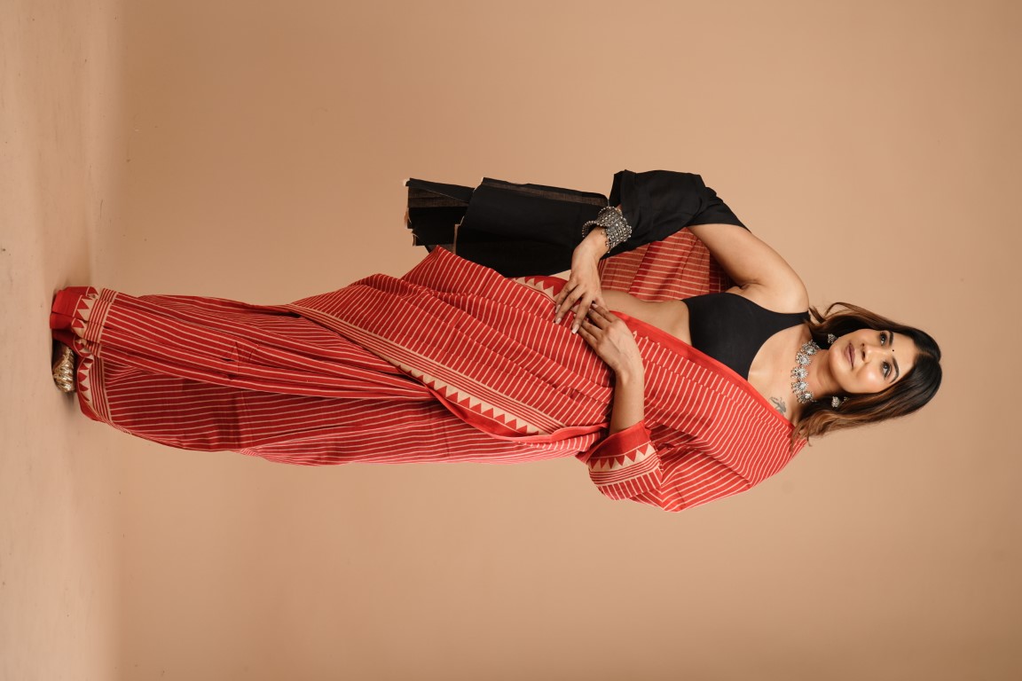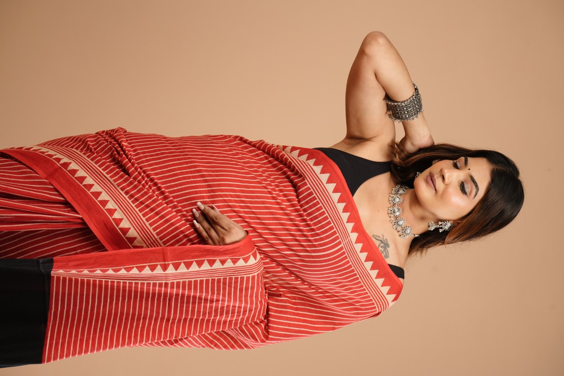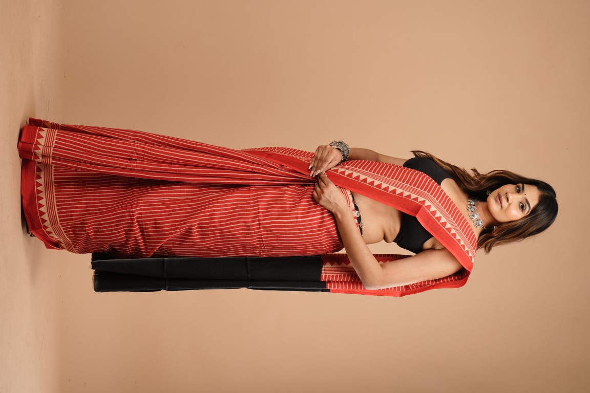 The saree in the image is red with white stripes and has a border with a pattern of triangles. It's paired with a black crop top and accessorized with silver jewellery like a necklace and bracelets.