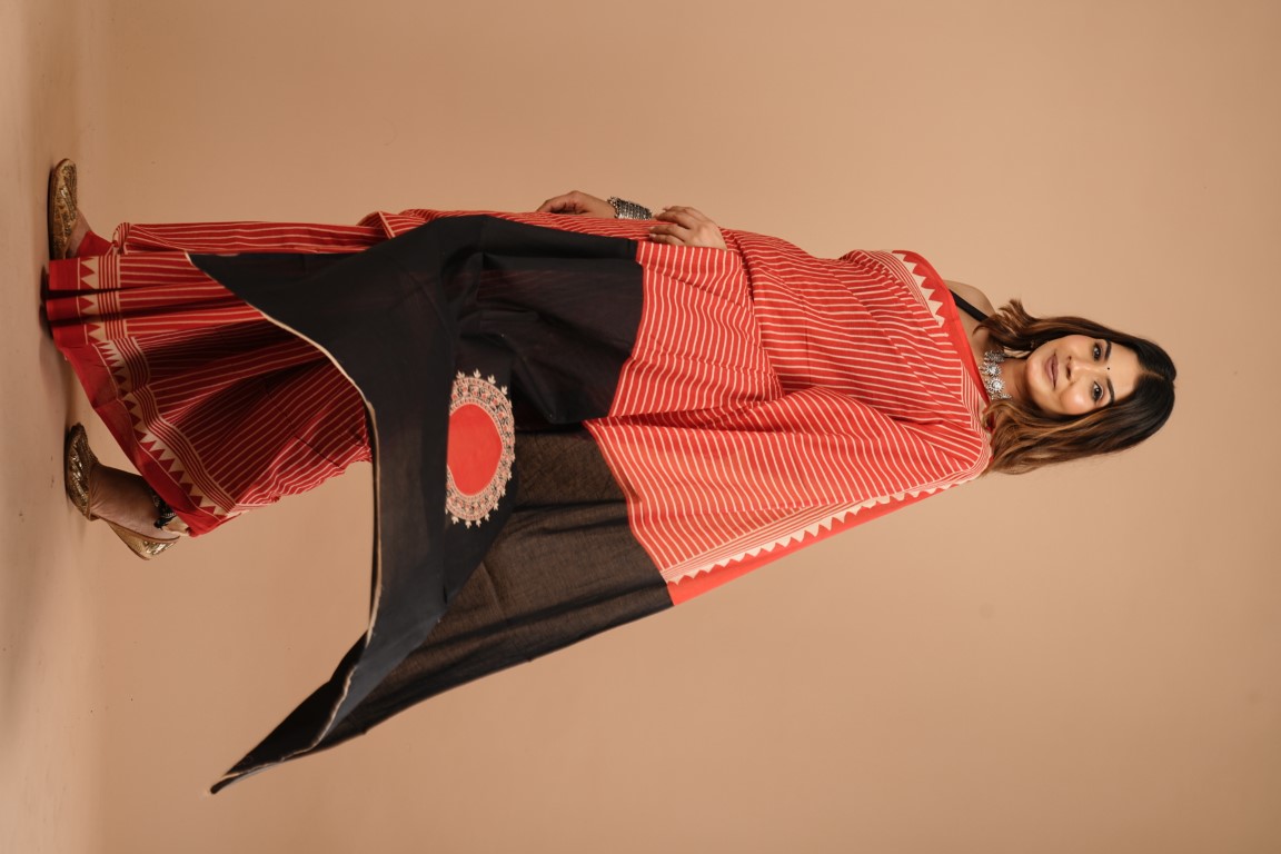 WOMENS RED WITH WHITE STRIPES COTTON SAREE