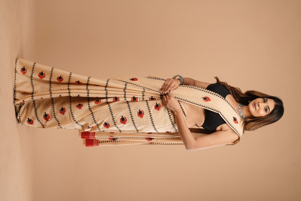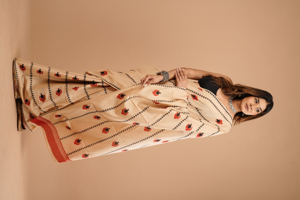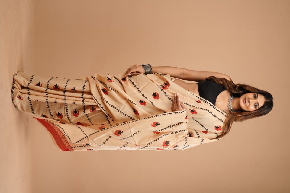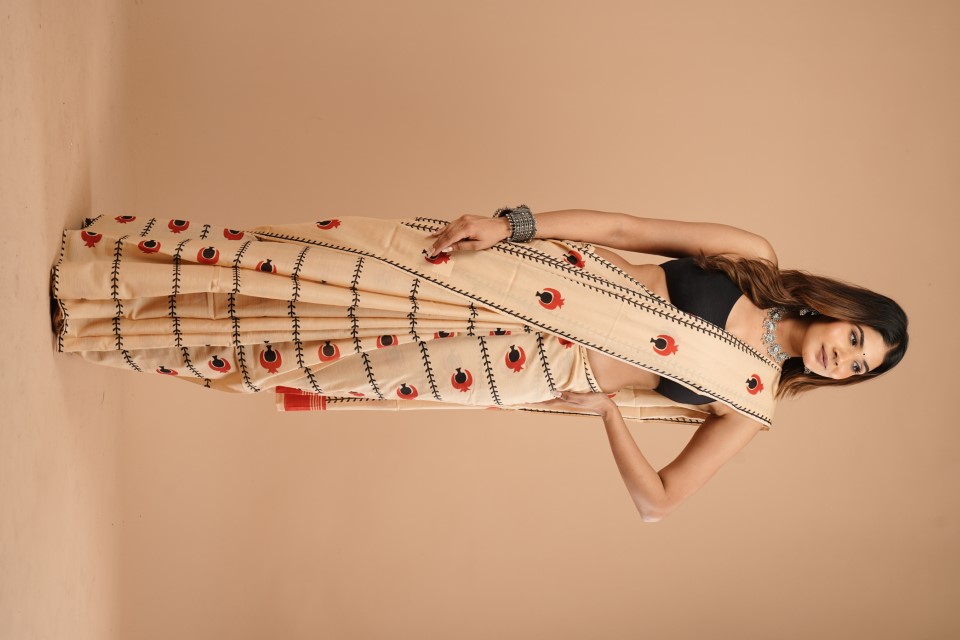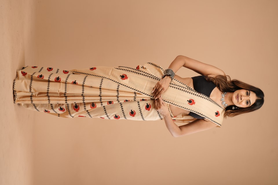 The woman in the image is wearing a cream-coloured saree with a peacock pattern. The saree has black stitching details and features red and black peacock motifs. She's paired it with a black blouse and accessorised with a silver necklace, earrings, and a bracelet. The background is a solid peach colour.