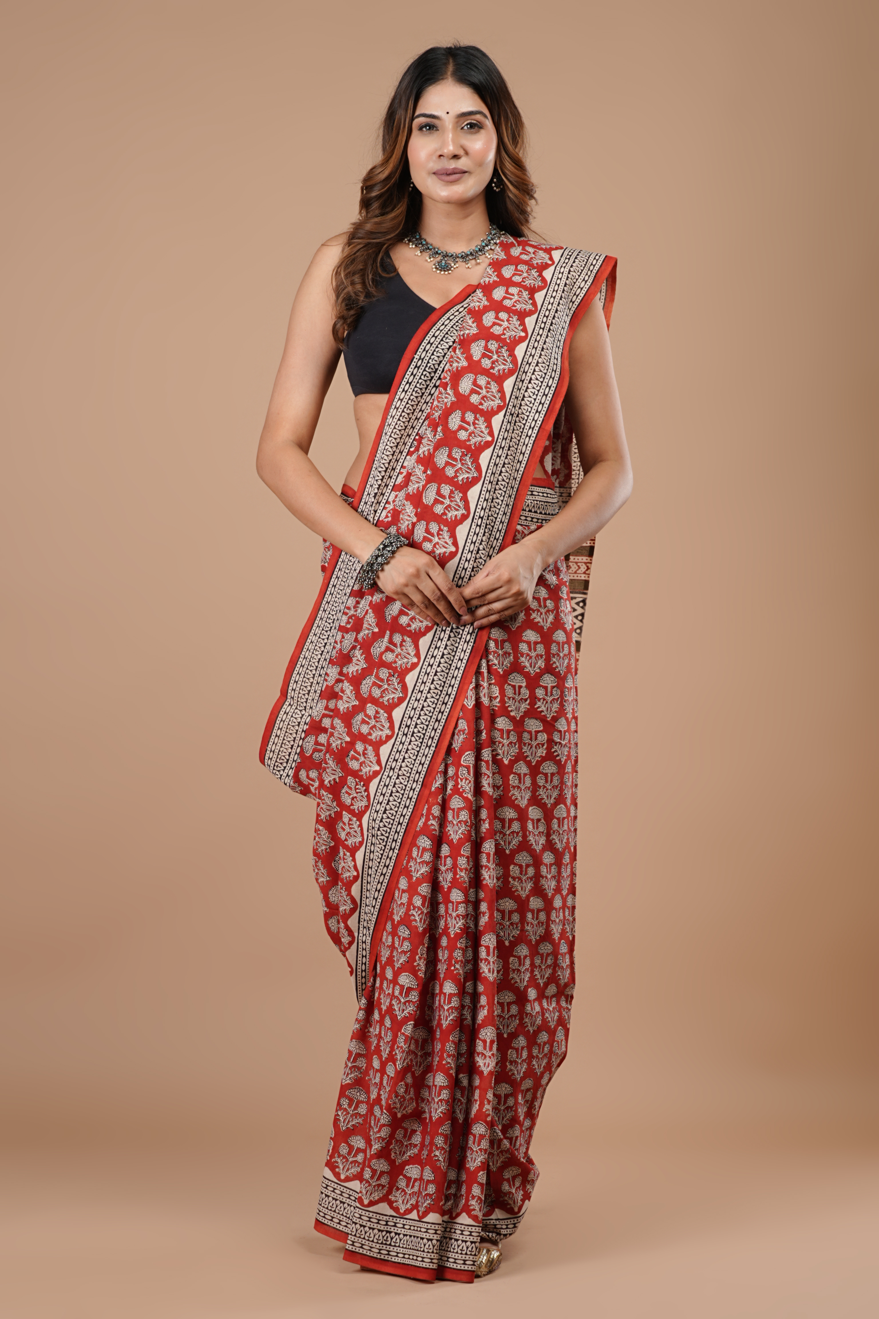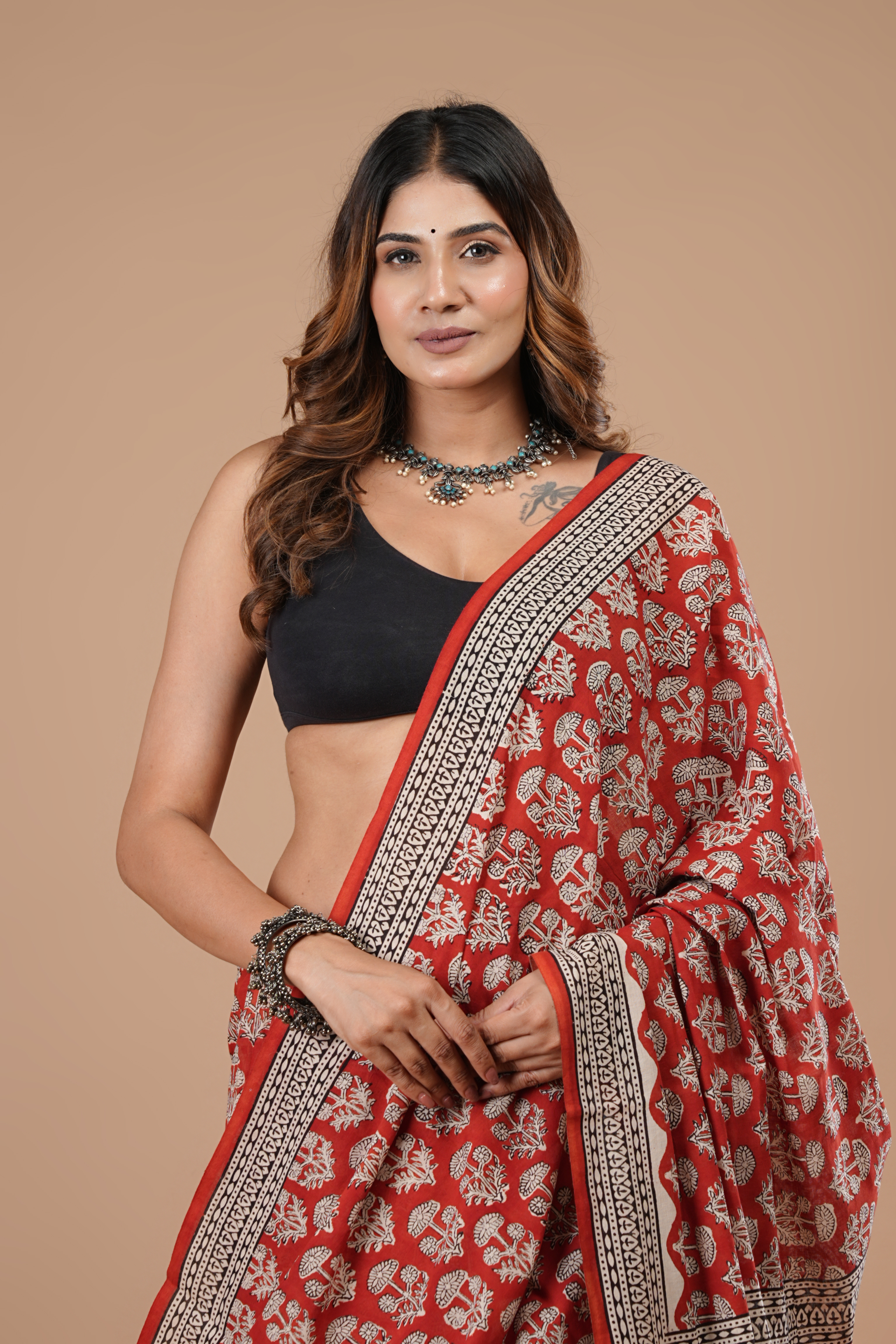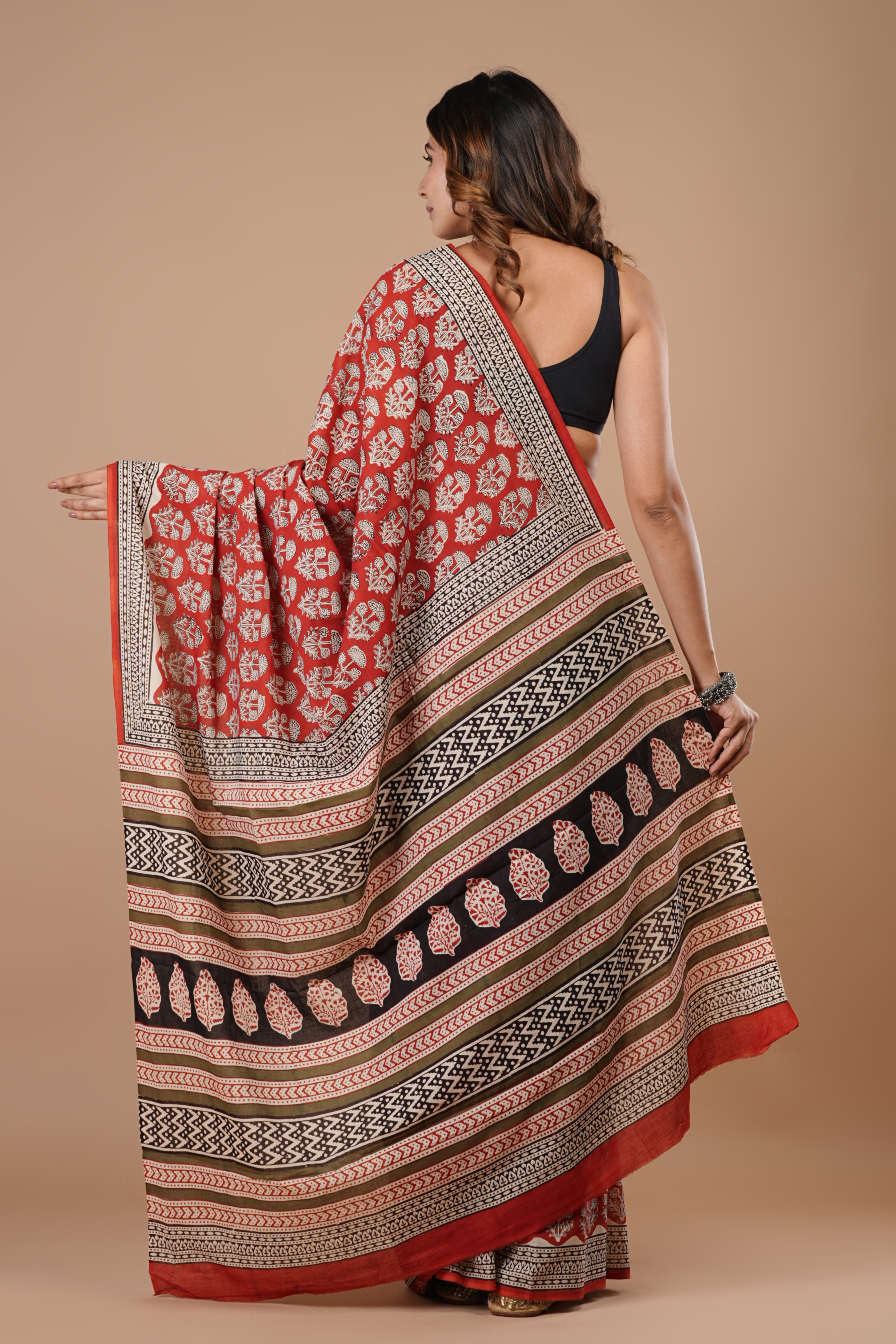 A woman wearing a rust-red saree with intricate beige and black floral block prints, paired with a black sleeveless blouse. The saree features a detailed black and cream patterned border with traditional motifs. She accessorizes with a statement oxidized choker necklace, matching earrings, and stacked bangles, giving the look a graceful yet bold traditional vibe.