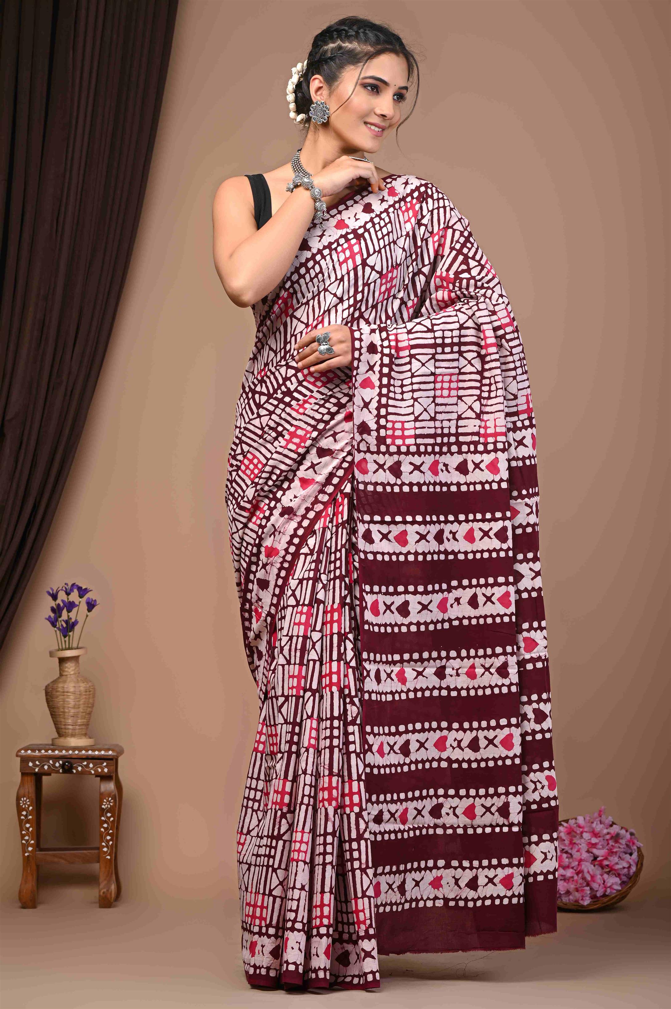 The saree in the image is primarily in shades of maroon, pink, and white with brown accents. It's a patterned saree with geometric designs and motifs. The woman wearing it has accessorized with silver jewellery like a bracelet, rings, and earrings. The saree has a striking pattern with lines, dots, and shapes in maroon, pink, and white on a predominantly white and maroon base.