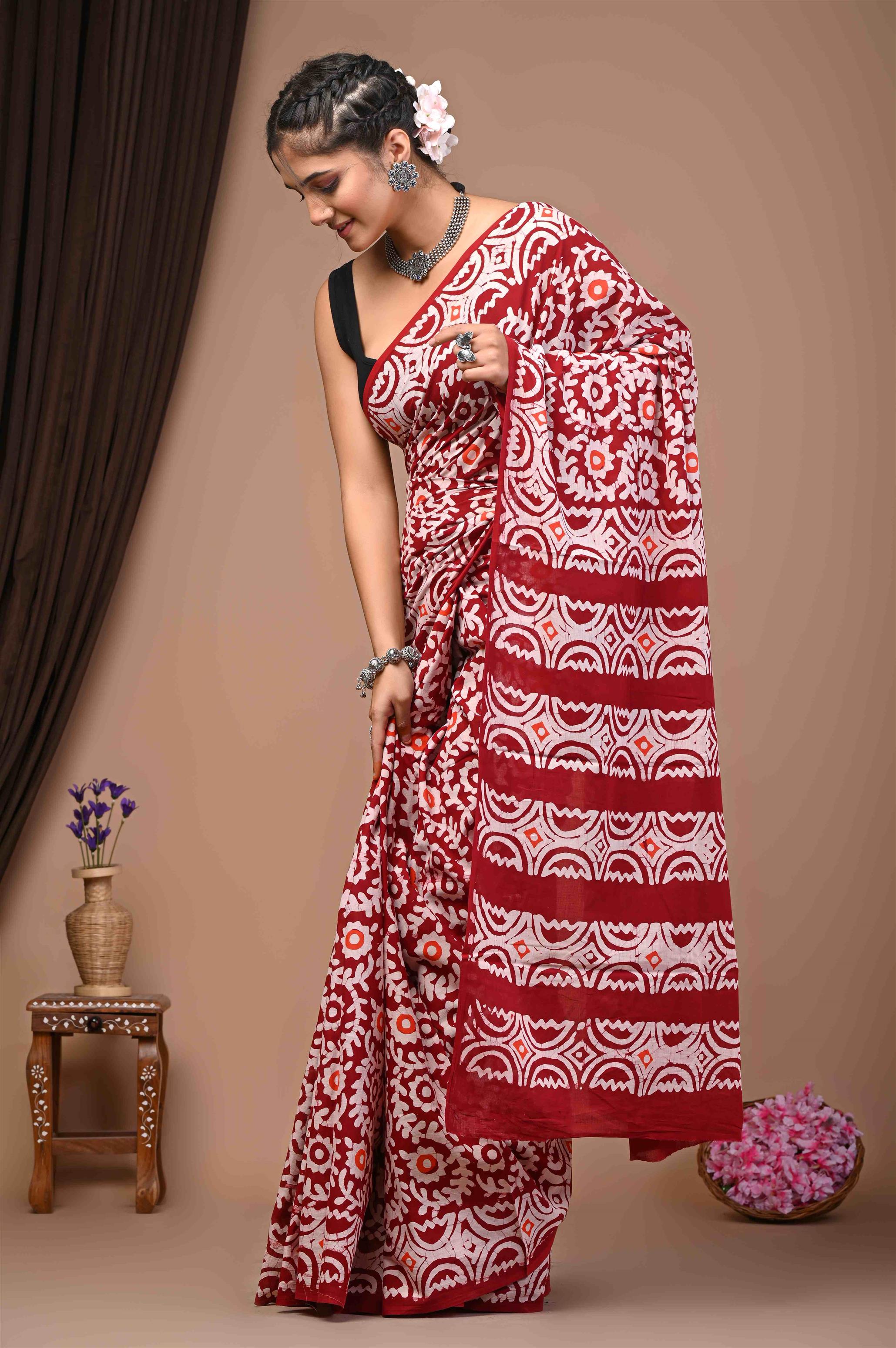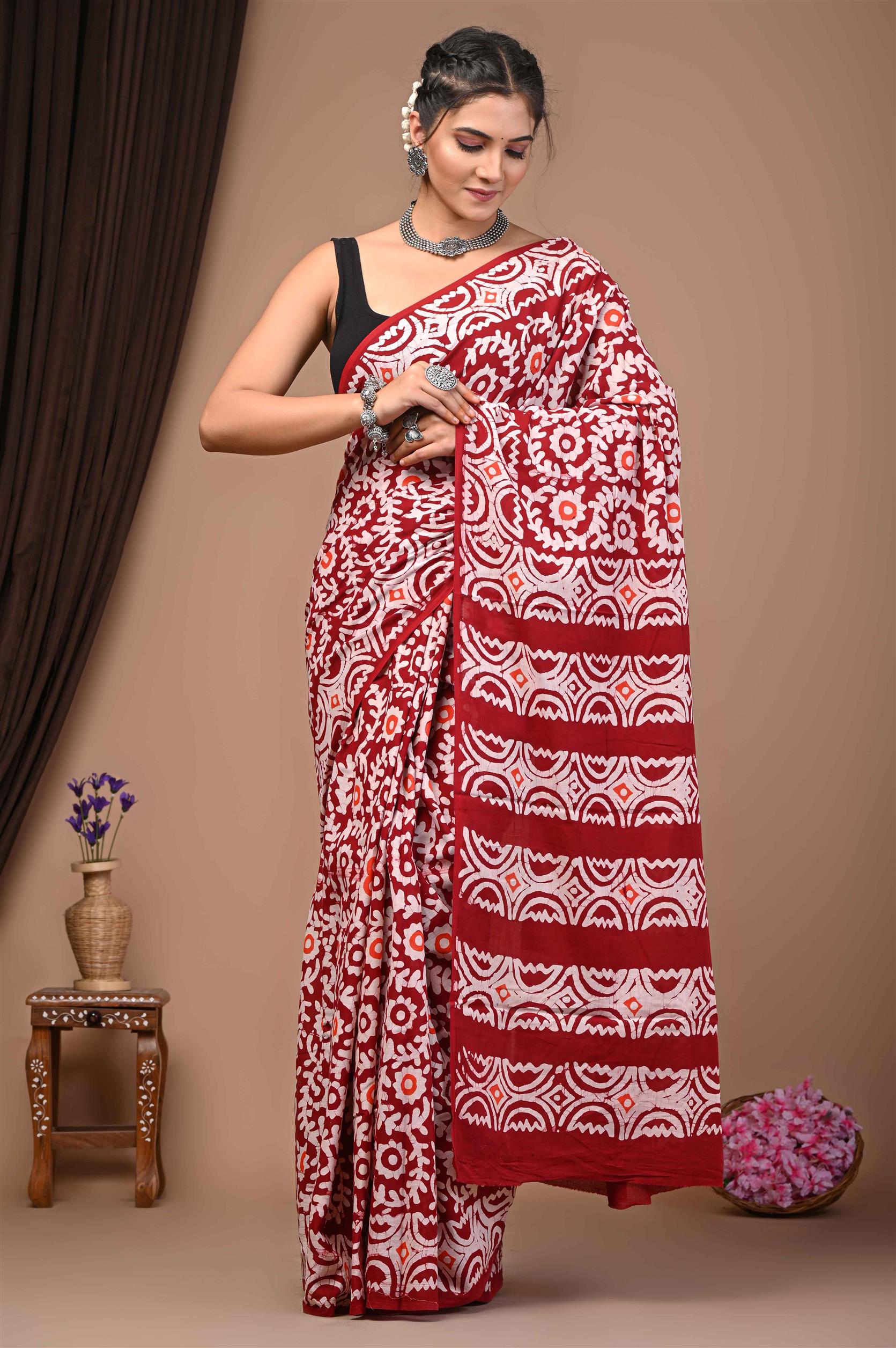 The sari in the image is predominantly red and white with some orange accents. It's draped elegantly on the woman, showcasing a striking pattern of white designs on a red background. The pattern features various motifs like semicircles, diamonds, and floral elements. The woman's black blouse complements the sari nicely. ??