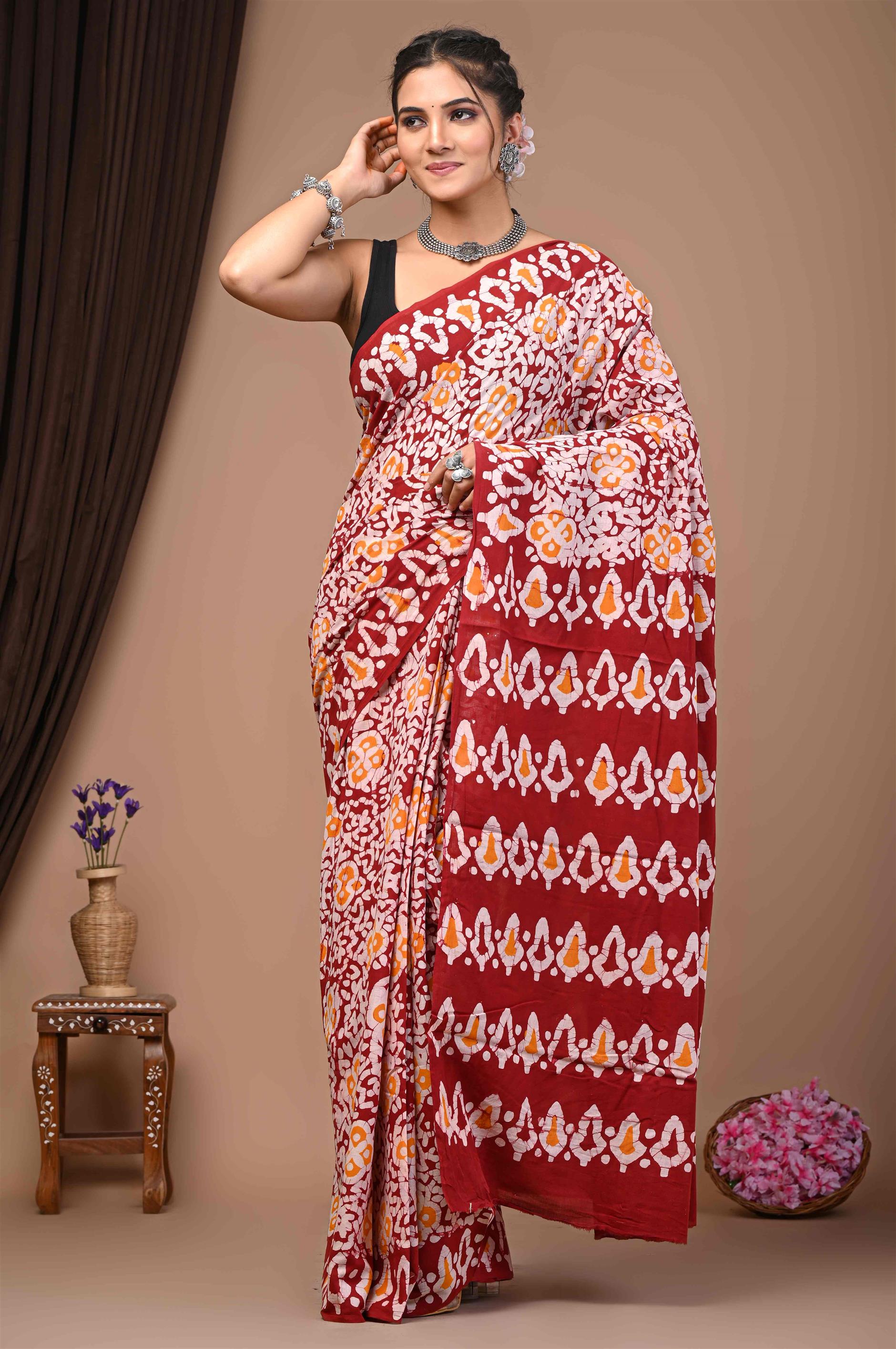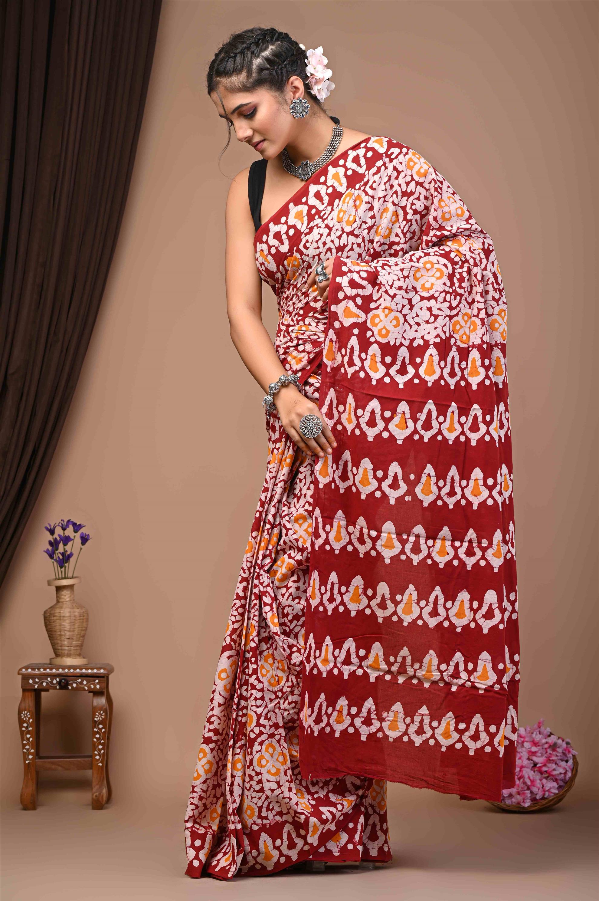 The saree in the image is predominantly red with white and orange patterns. The patterns are in a repeating motif resembling stylized shapes or motifs, giving the saree a traditional and ethnic look. The woman wearing the saree has accessorized it with silver jewellery and a black blouse.