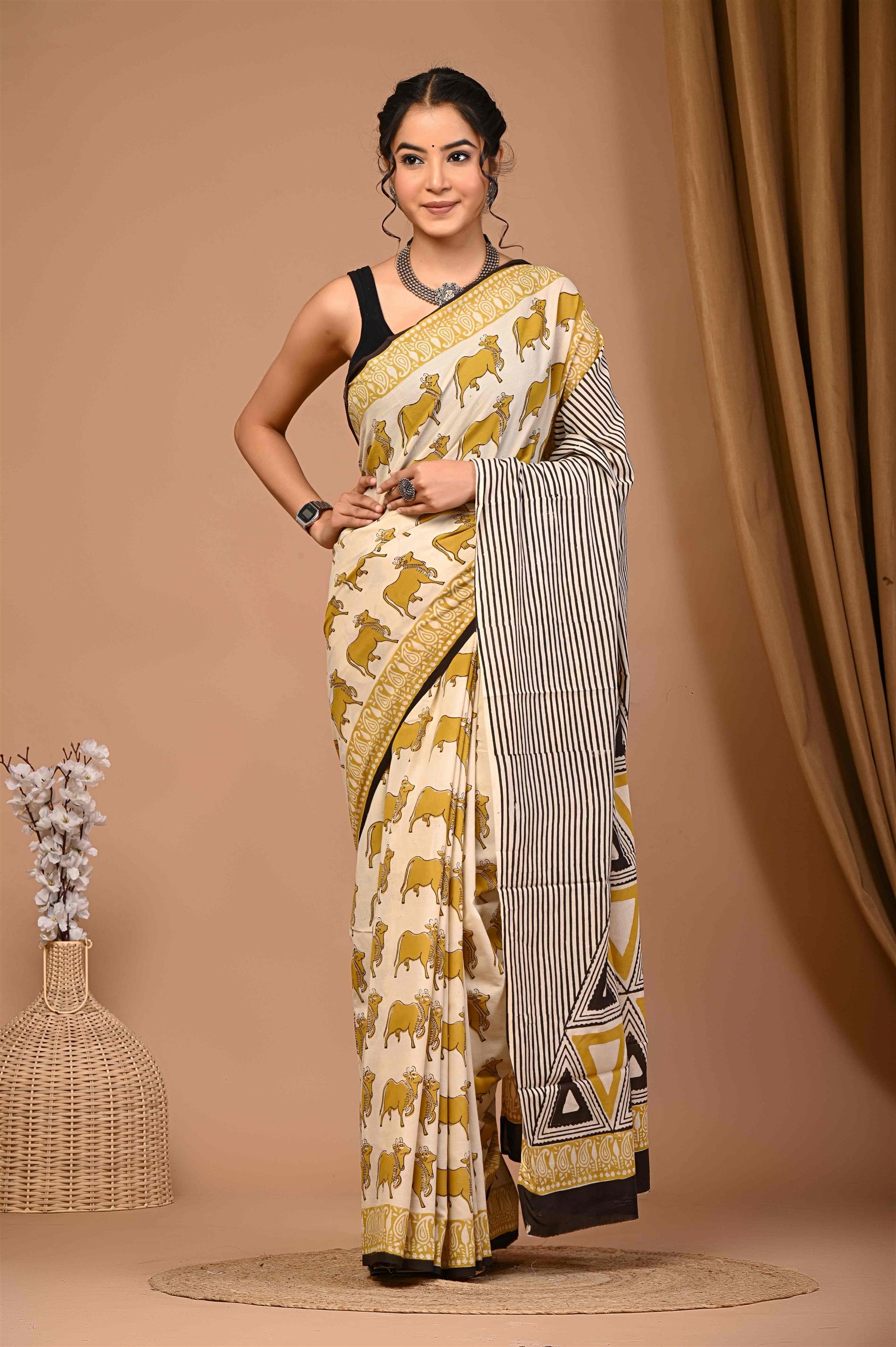 The saree is primarily off-white with golden cow prints all over it. It has a golden border and a pallu with black and white stripes along with golden and black geometric patterns. The woman wearing it has accessorized with a black sleeveless blouse, a silver necklace, earrings, a bindi, rings, and a watch. ??