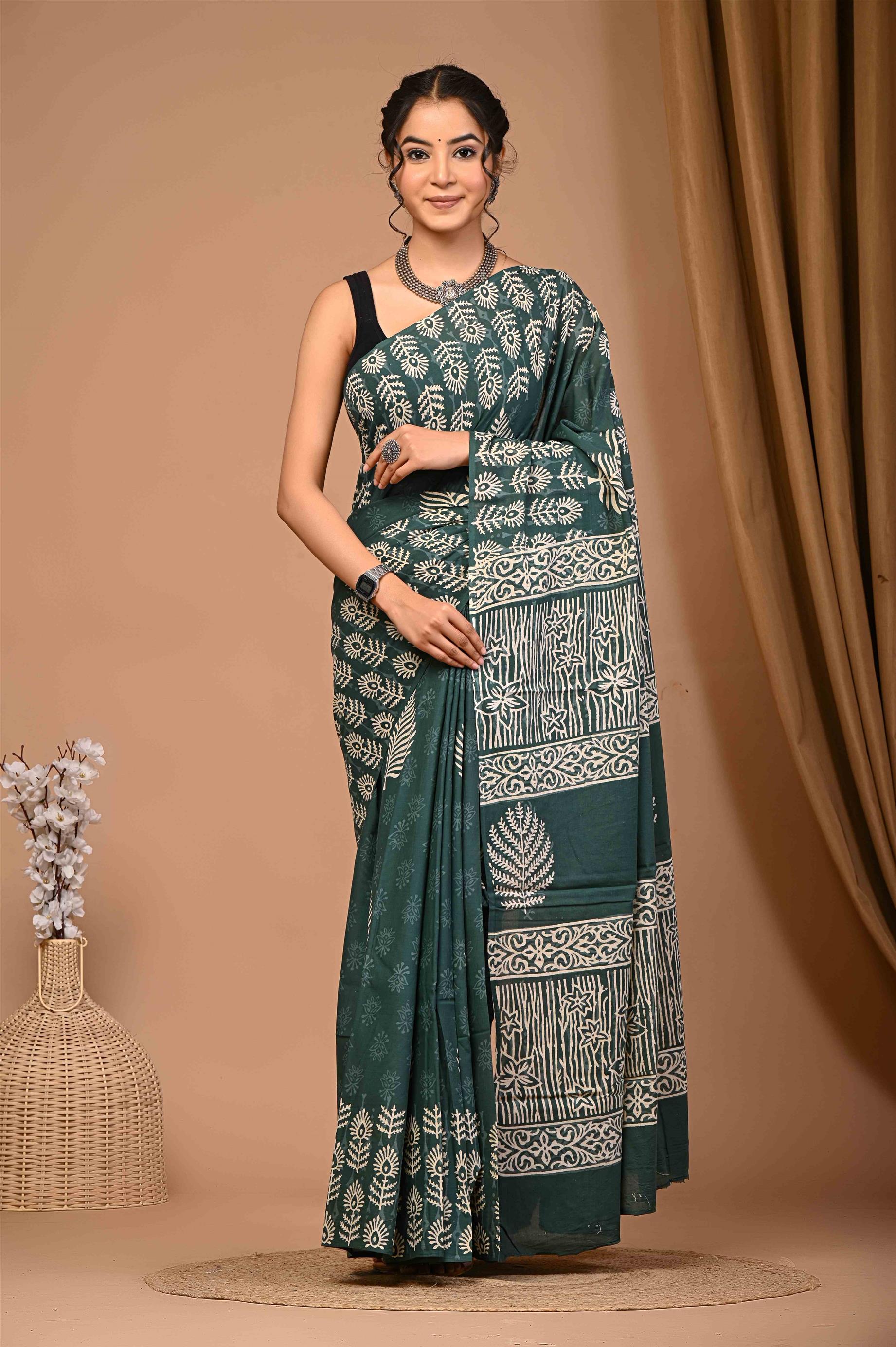 The colour of the saree is dark green with white patterns. The saree has intricate white designs and patterns all over it, including floral motifs and geometric patterns at the bottom. The woman wearing it has accessorised it with a silver necklace and a black strap blouse.