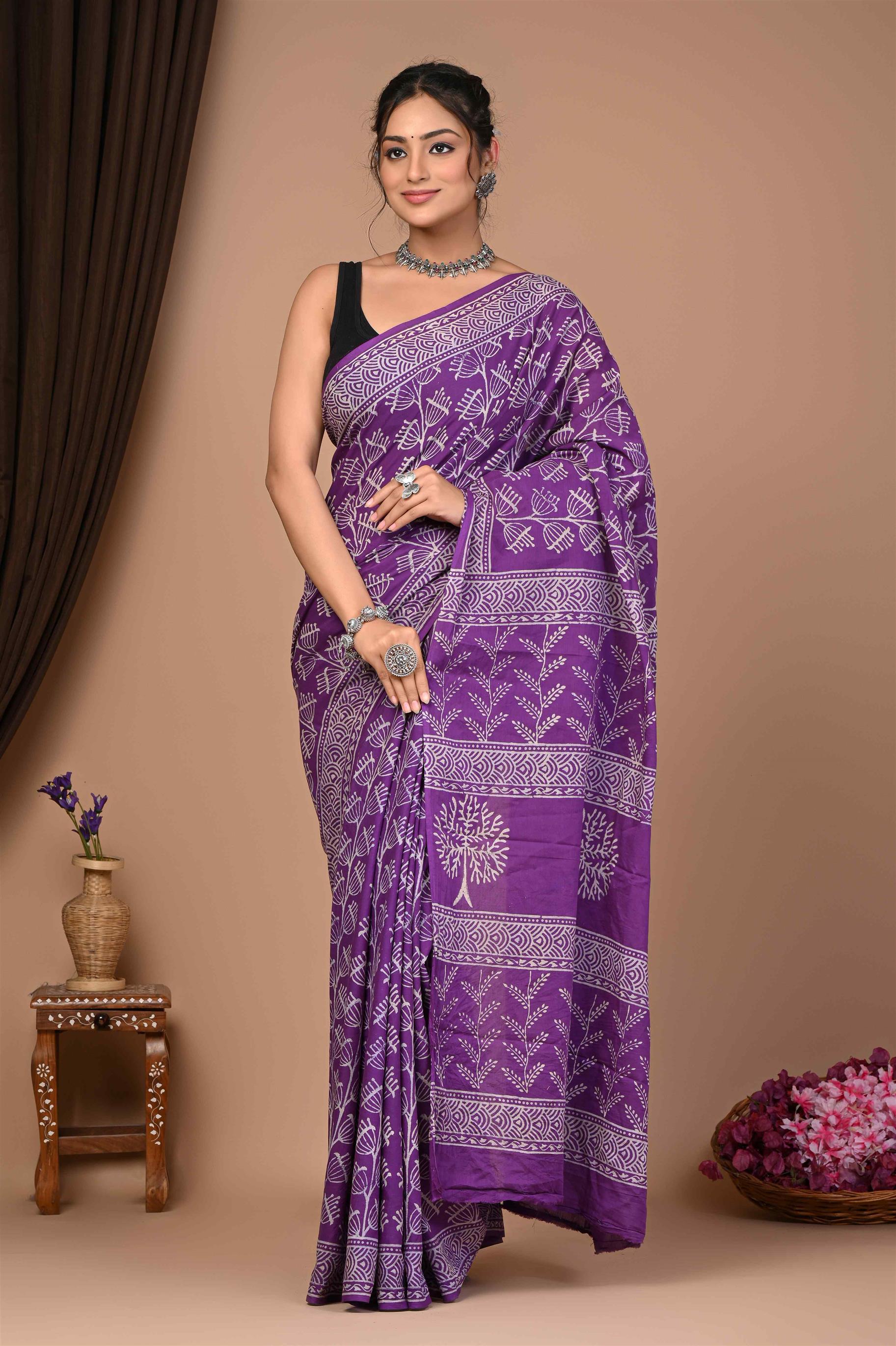 The saree is purple with intricate white patterns and designs all over it. It looks like a traditional Indian saree, beautifully draped by the woman in the image. The white patterns add a nice contrast to the rich purple colour of the saree.