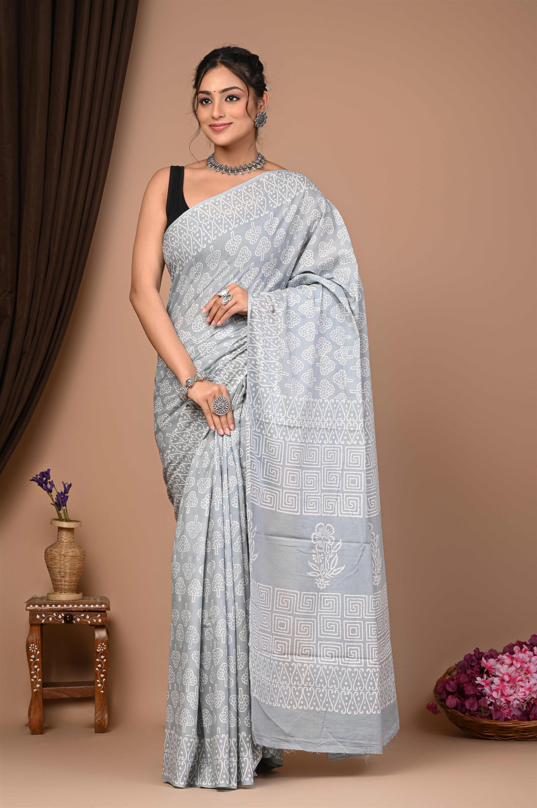 The saree is light grey with intricate white designs and patterns printed all over it. It has a traditional look with detailed motifs like paisley, geometric patterns, and floral designs in white, giving it an elegant appearance. The saree is draped in a classic style, complemented by the woman's silver jewellery ??.