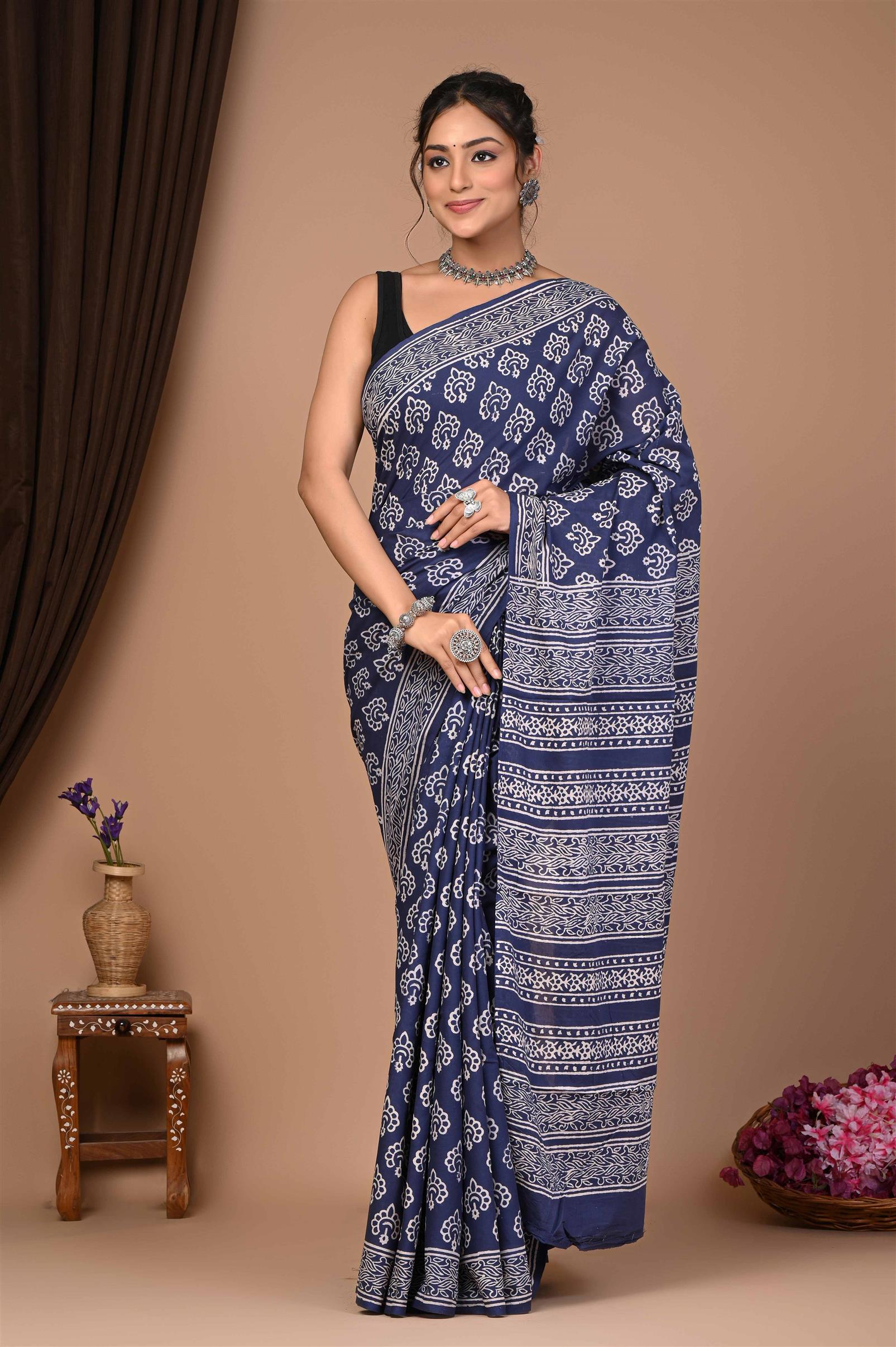 The saree is navy blue with intricate white patterns. It has a beautiful design with various motifs and stripes, adding a touch of elegance to the overall look. ??