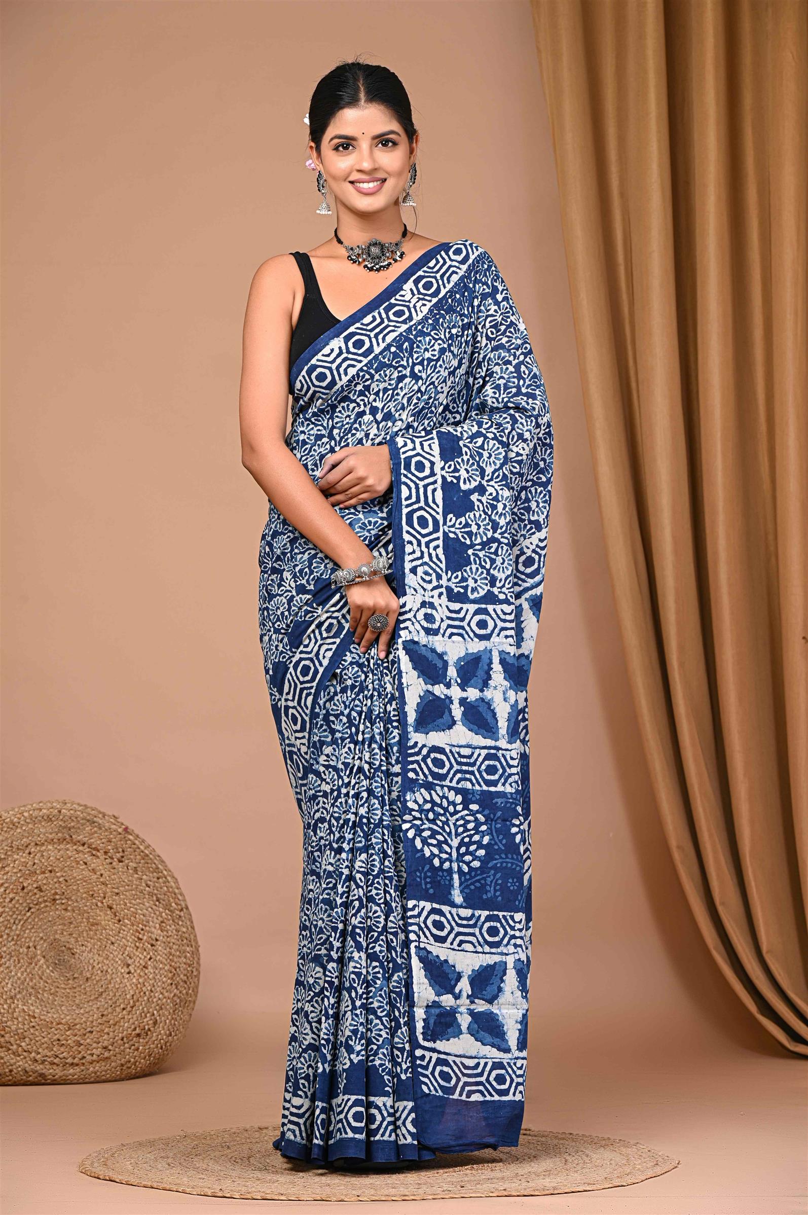 The saree is blue and white with a mix of geometric and floral patterns. It's draped elegantly on the woman, showcasing a traditional Indian look. The blue and white colour combo gives it a classic and chic vibe ??.