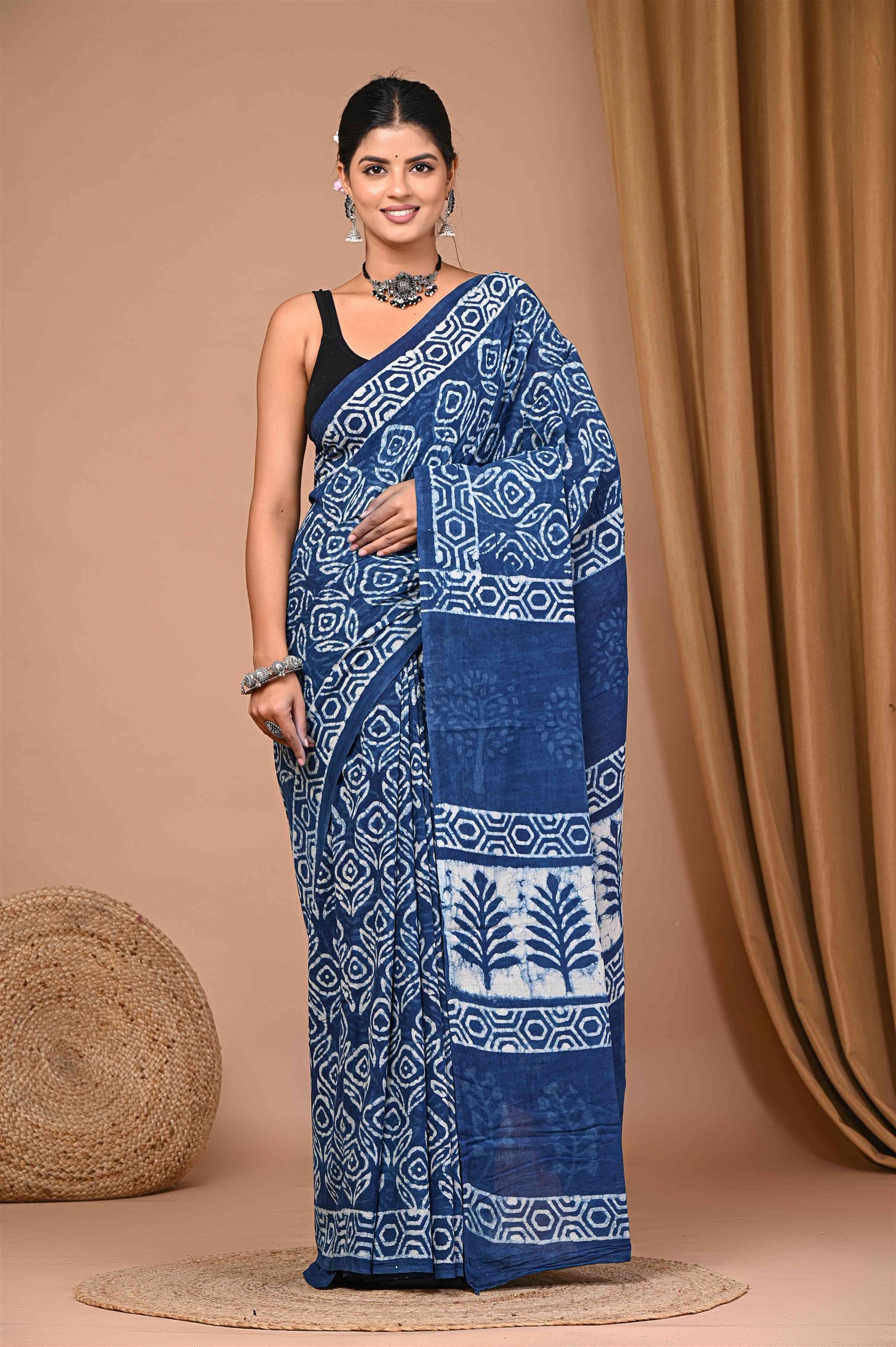 The saree is blue with white patterns. It's a blue and white batik print saree with various geometric and floral designs. The saree has a mix of patterns like hexagons, circles, and leaf-like motifs in white on a blue background.