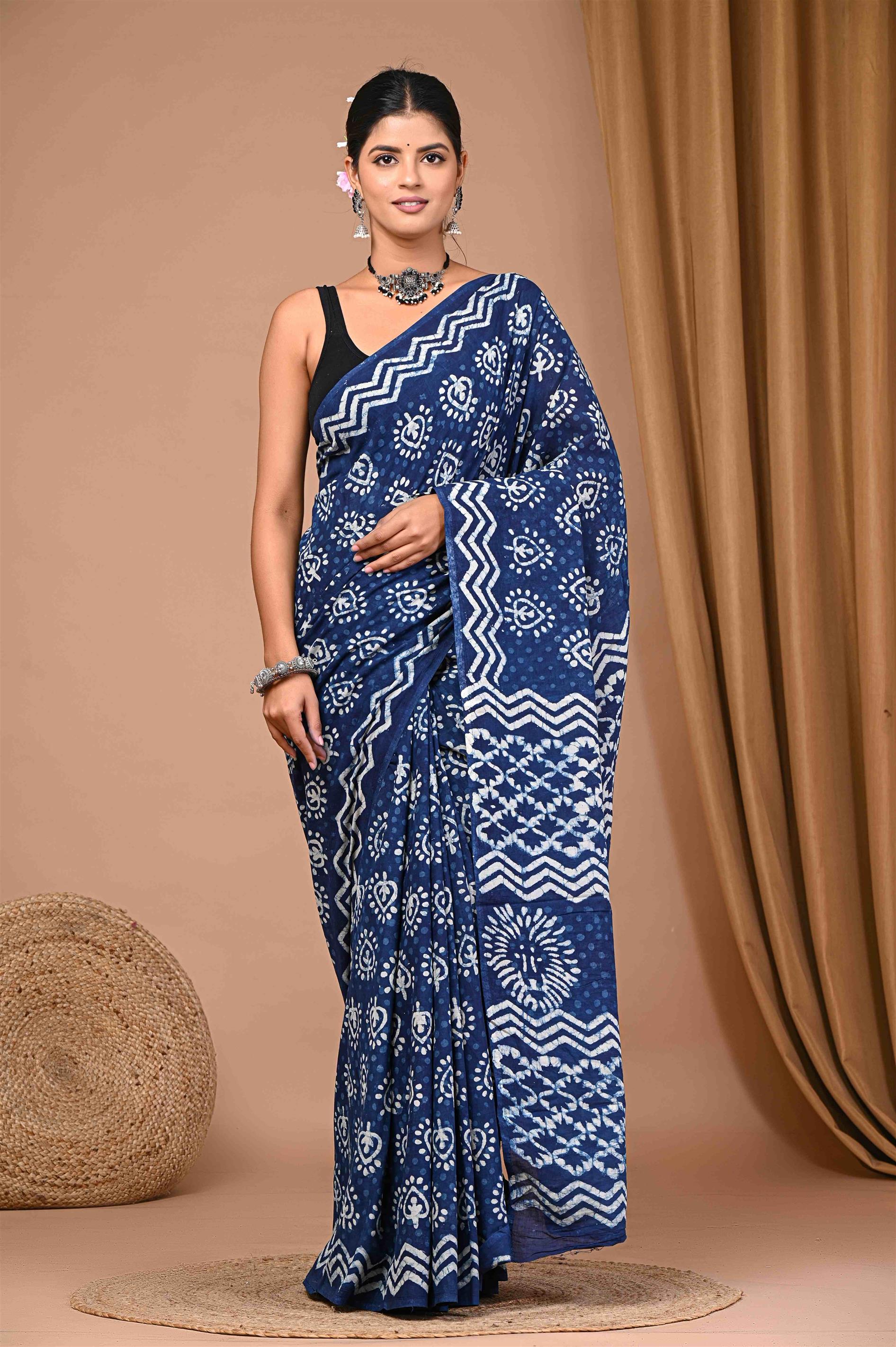 The saree is blue with white patterns. It has a mix of geometric and floral designs, including zigzag lines and circular motifs. The saree is draped over a black sleeveless blouse, and the overall look is complemented by traditional jewelry like a necklace, earrings, and a bangle.