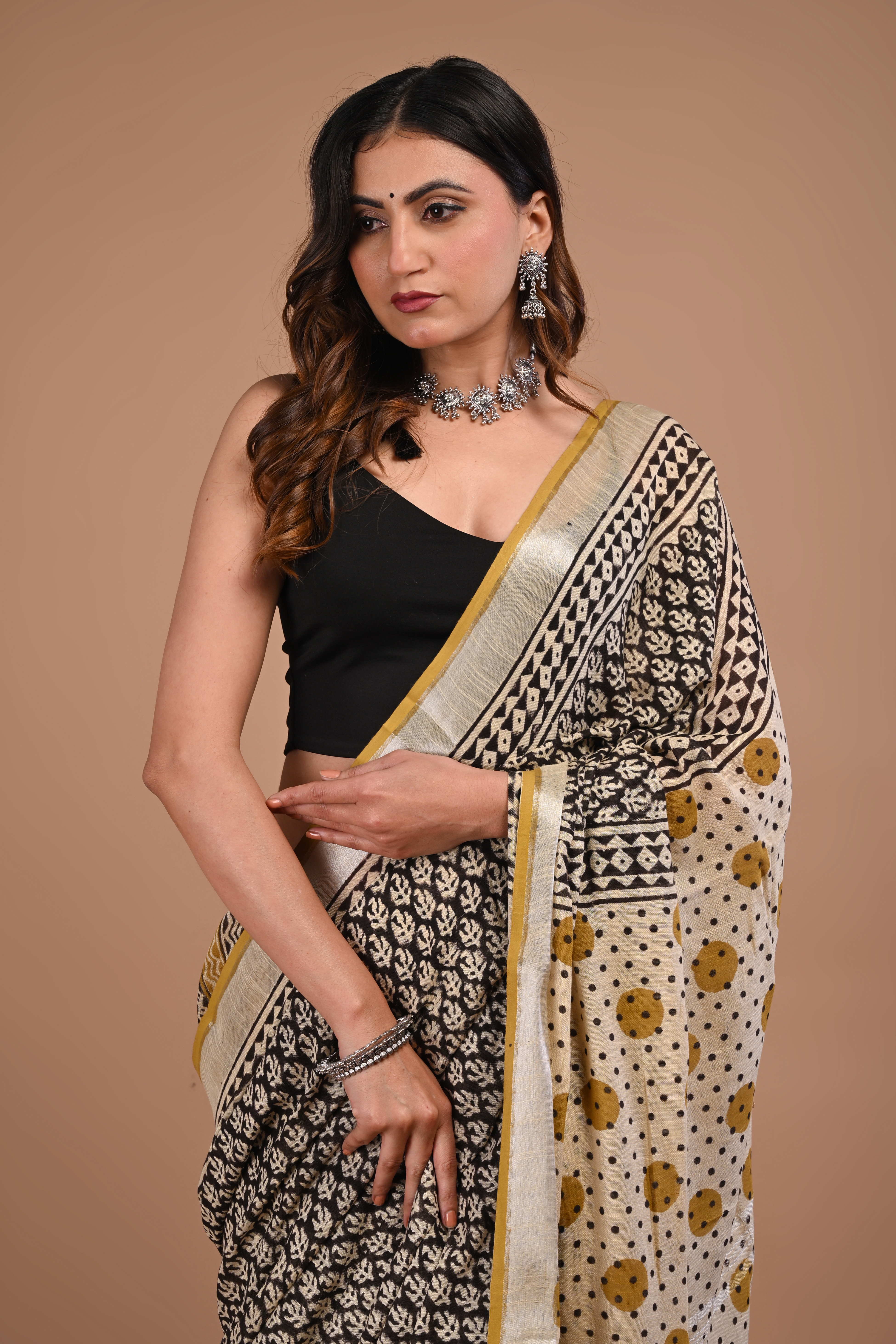 Midnight Ivory Heritage Cotton Linen Saree Elevate your ethnic wardrobe with this timeless Black and Ivory Cotton Linen Saree, beautifully enhanced with a subtle mustard gold border. Crafted from breathable cotton linen fabric, this saree offers the perfect blend of comfort and elegance. The intricate traditional prints add a graceful charm, making it ideal for festive gatherings, office wear, and casual celebrations. Lightweight and easy to drape, this saree ensures all-day comfort while maintaining a sophisticated look. Pair it with a black or mustard blouse and statement silver jewellery for a refined ethnic appeal.