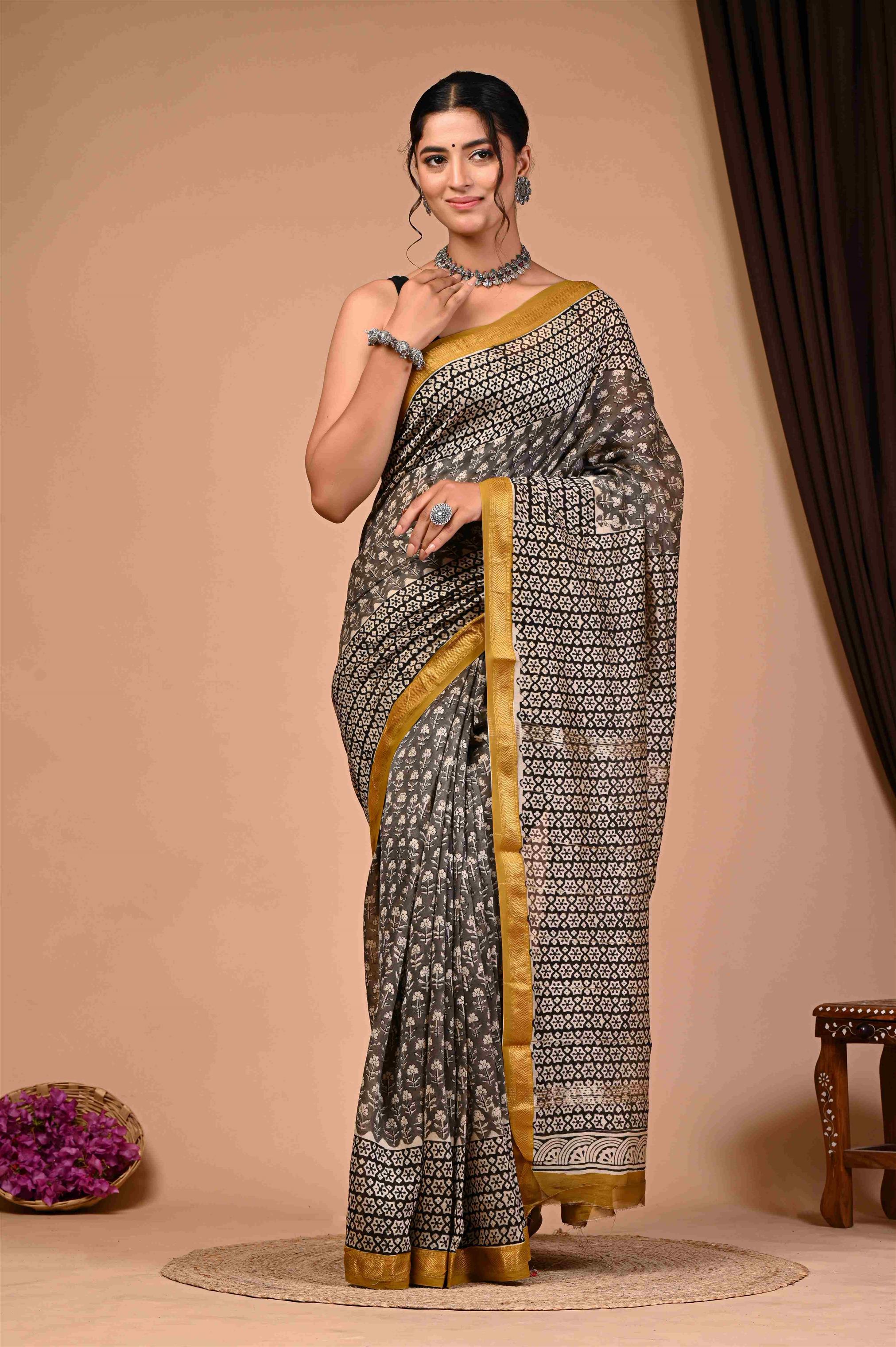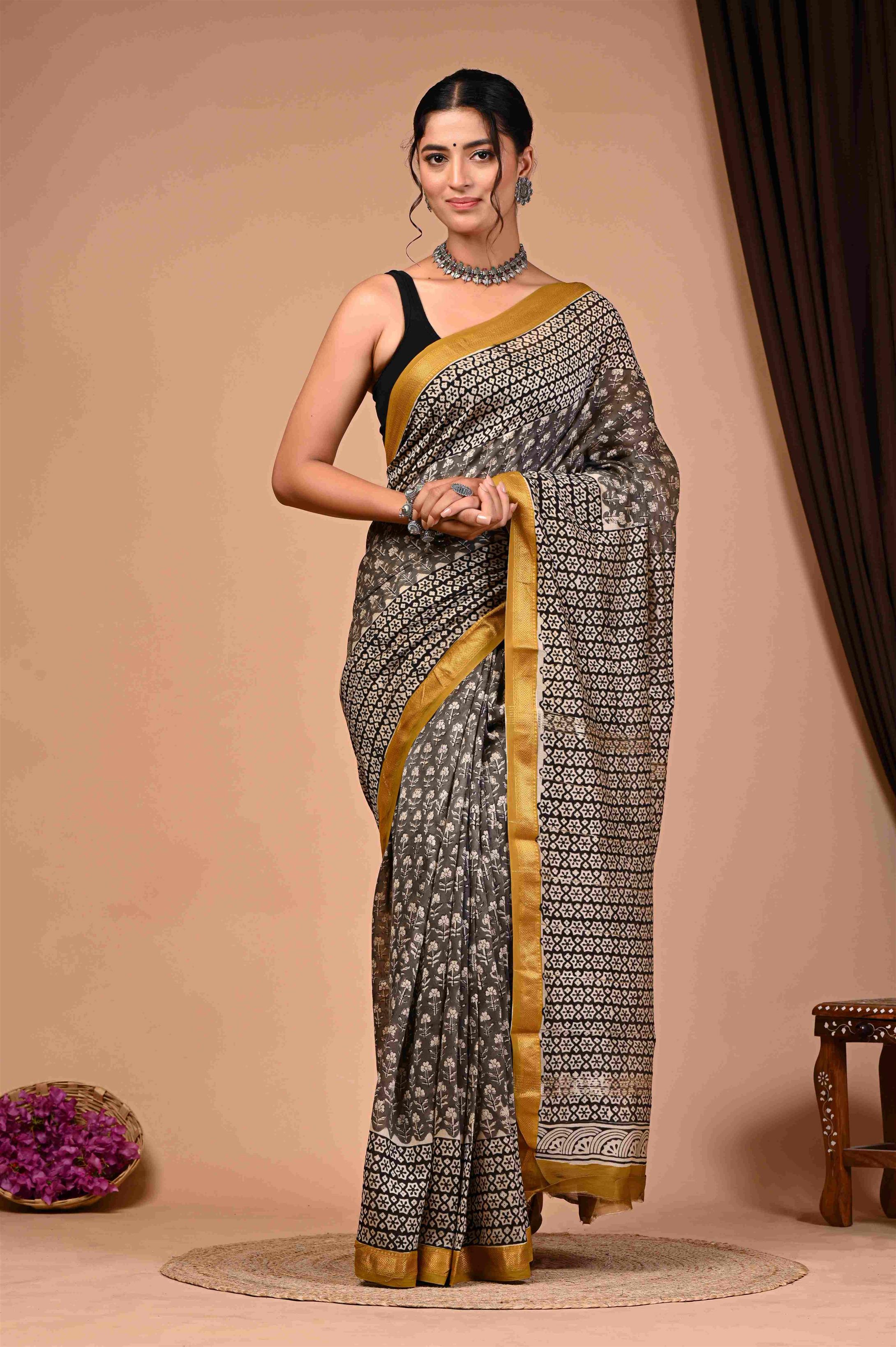 The saree is a beautiful gray and white ensemble with intricate patterns and a gold border. The gray base is adorned with white designs, while the gold border adds a touch of luxury and elegance. The saree's design is a perfect blend of traditional and modern elements, making it a stunning and sophisticated garment.