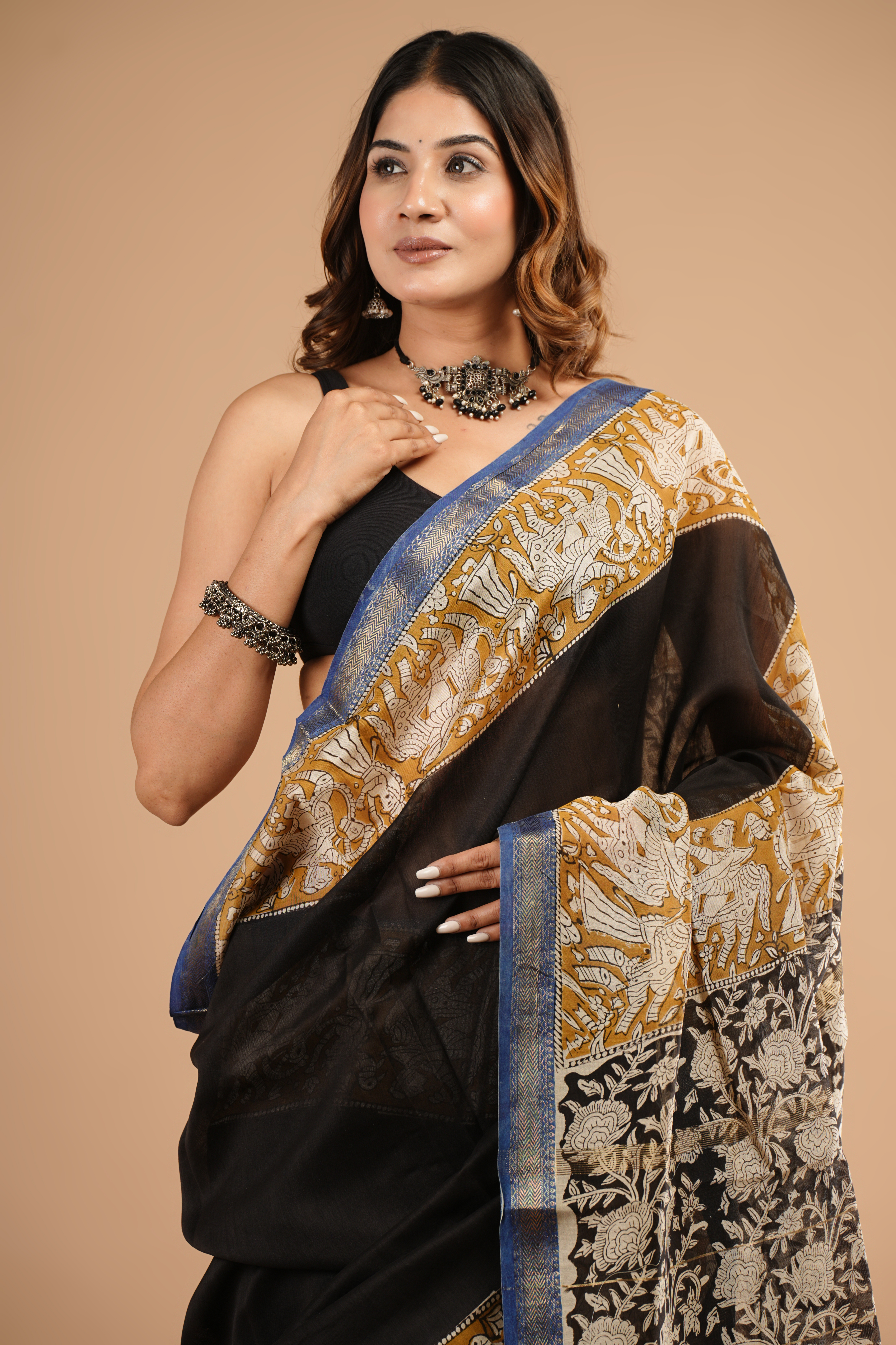 Midnight Royal Maheshwari Silk Saree Elevate your ethnic wardrobe with this elegant Black Maheshwari Silk Saree, beautifully crafted with traditional weaving. The deep black base is complemented by an antique gold zari woven border featuring intricate elephant motifs, symbolizing heritage and grace. A subtle royal blue border accent enhances the richness of the saree, making it perfect for festive occasions and cultural celebrations. The lightweight and breathable Maheshwari silk fabric offers comfort along with timeless elegance. The beautifully designed pallu with detailed floral patterns adds a royal touch, making this saree an ideal choice for weddings, festive gatherings, and special occasions. Fabric : Maheshwari Silk Colour : Deep Black with Antique Gold & Royal Blue Border Work : Traditional Woven Zari Design Occasion: Festive | Wedding | Traditional Wear
