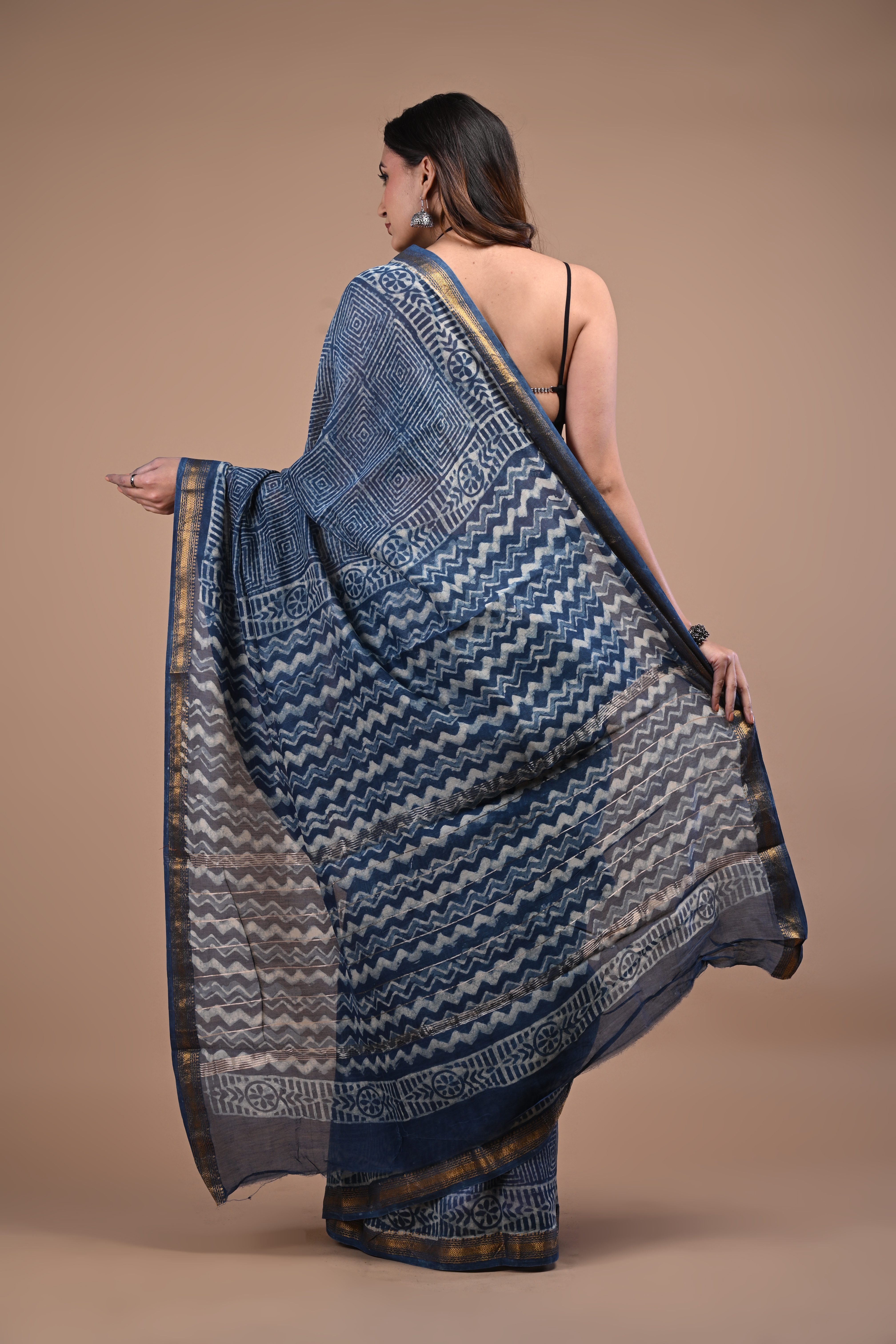 Indigo Grace Maheshwari Silk Saree Add timeless elegance to your wardrobe with this beautiful Indigo Blue Maheshwari Silk Saree, crafted with traditional artistry. The saree features intricate geometric and wave-inspired woven patterns across the body, giving it a rich and contemporary ethnic appeal. The antique gold zari border enhances the sophistication of the saree, while the detailed pallu with traditional motifs reflects the heritage of Maheshwari weaving. Lightweight and graceful, this saree is perfect for festive occasions, cultural gatherings, and elegant day wear. Fabric: Maheshwari Silk Colour: Steel Blue / Indigo Blue with Antique Gold Border Work: Traditional Woven Design Occasion: Festive | Traditional | Casual Elegance