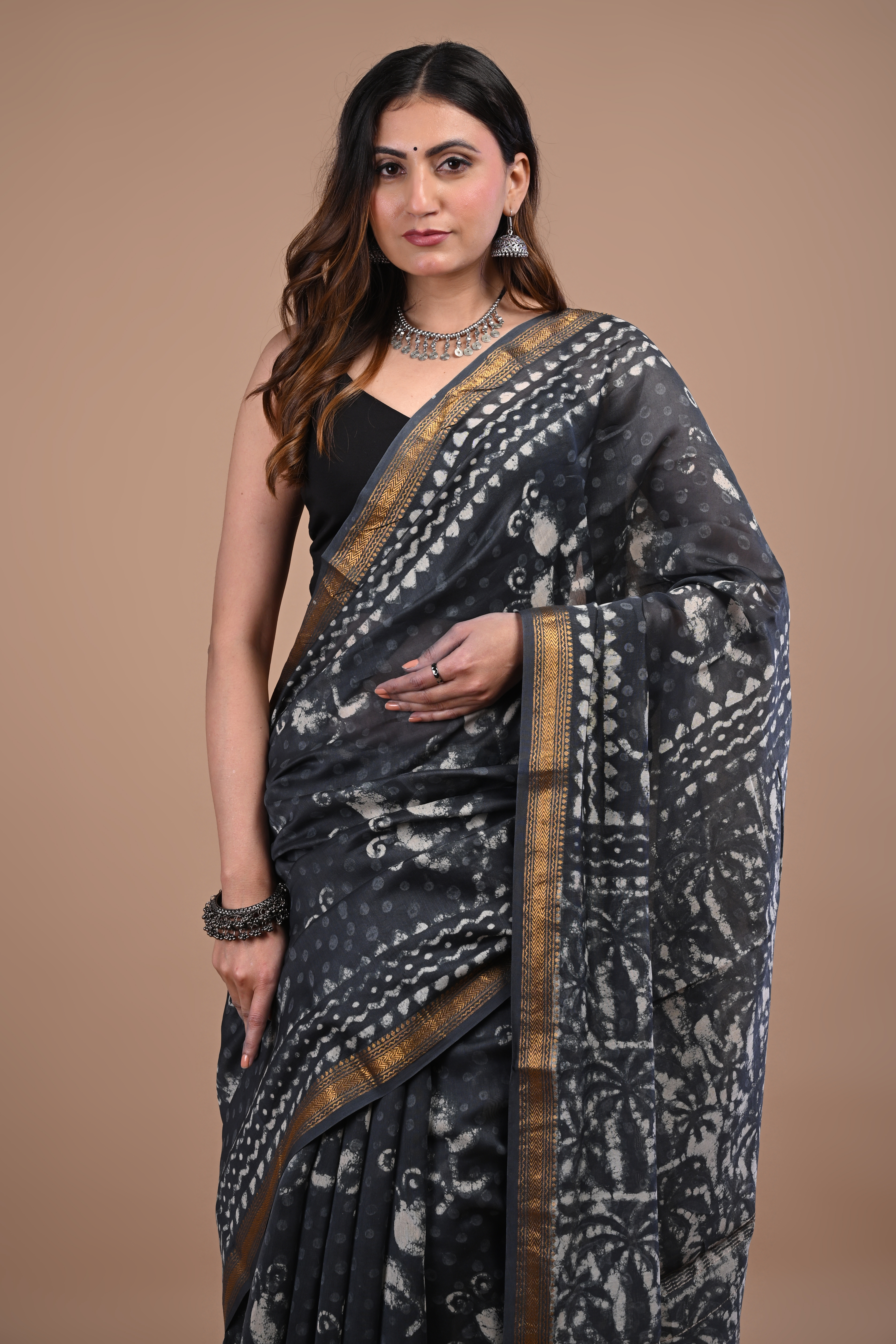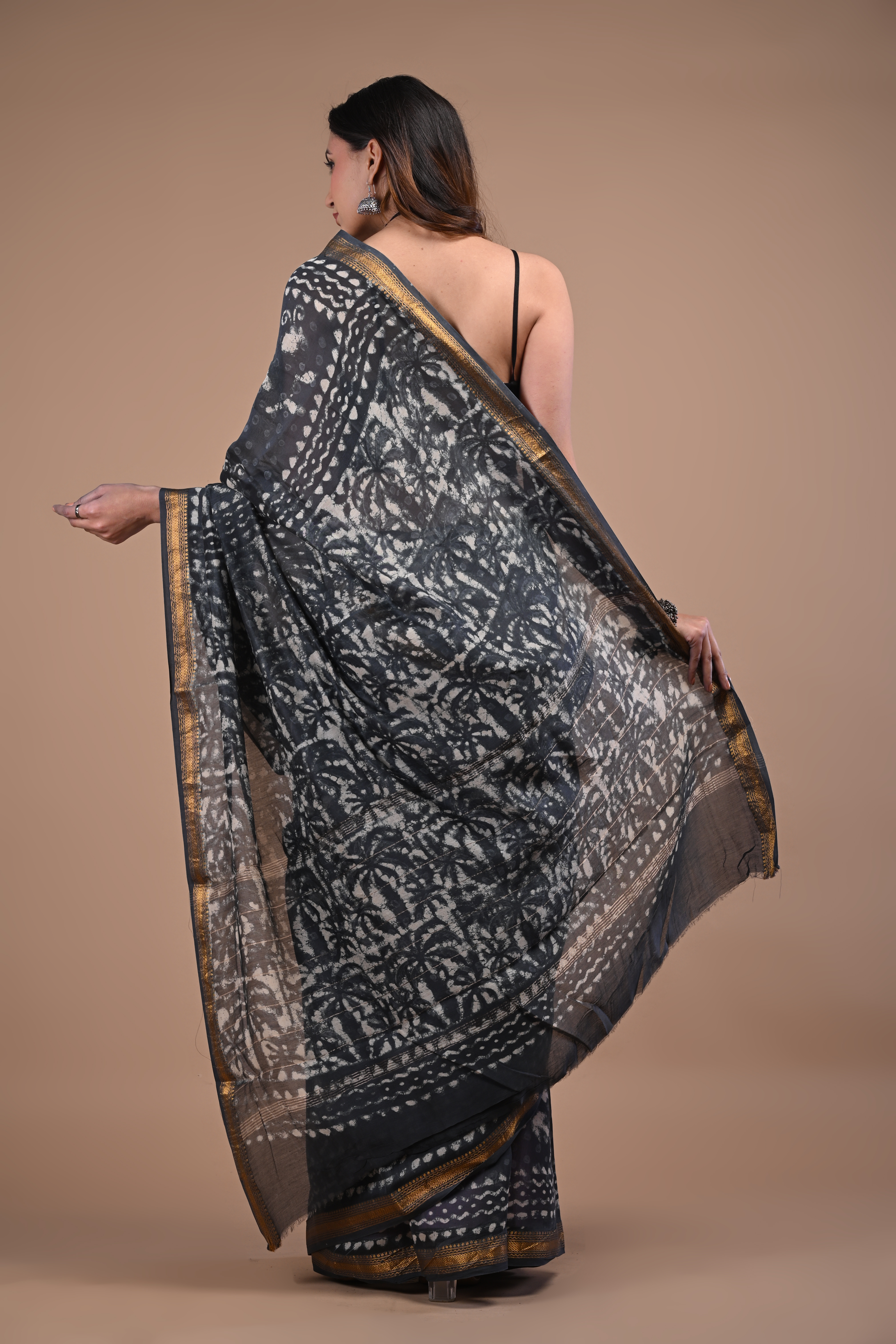 Midnight Charcoal Maheshwari Silk Saree Step into timeless elegance with this stunning Charcoal Black Maheshwari Silk Saree, beautifully designed with artistic dabu-inspired tie-dye patterns across the fabric. The deep charcoal base creates a bold and sophisticated look, while the delicate ivory motifs add a subtle traditional charm. The saree is highlighted with a classic antique gold zari border, enhancing its richness and elegance. Crafted from lightweight and breathable Maheshwari silk, this saree drapes gracefully and offers both comfort and style. Perfect for festive occasions, cultural gatherings, and elegant evening wear, this saree blends traditional craftsmanship with modern sophistication. Fabric: Maheshwari Silk Colour: Charcoal Black with Ivory Dabu Print Border: Antique Gold Zari Occasion: Festive | Party Wear | Traditional Events