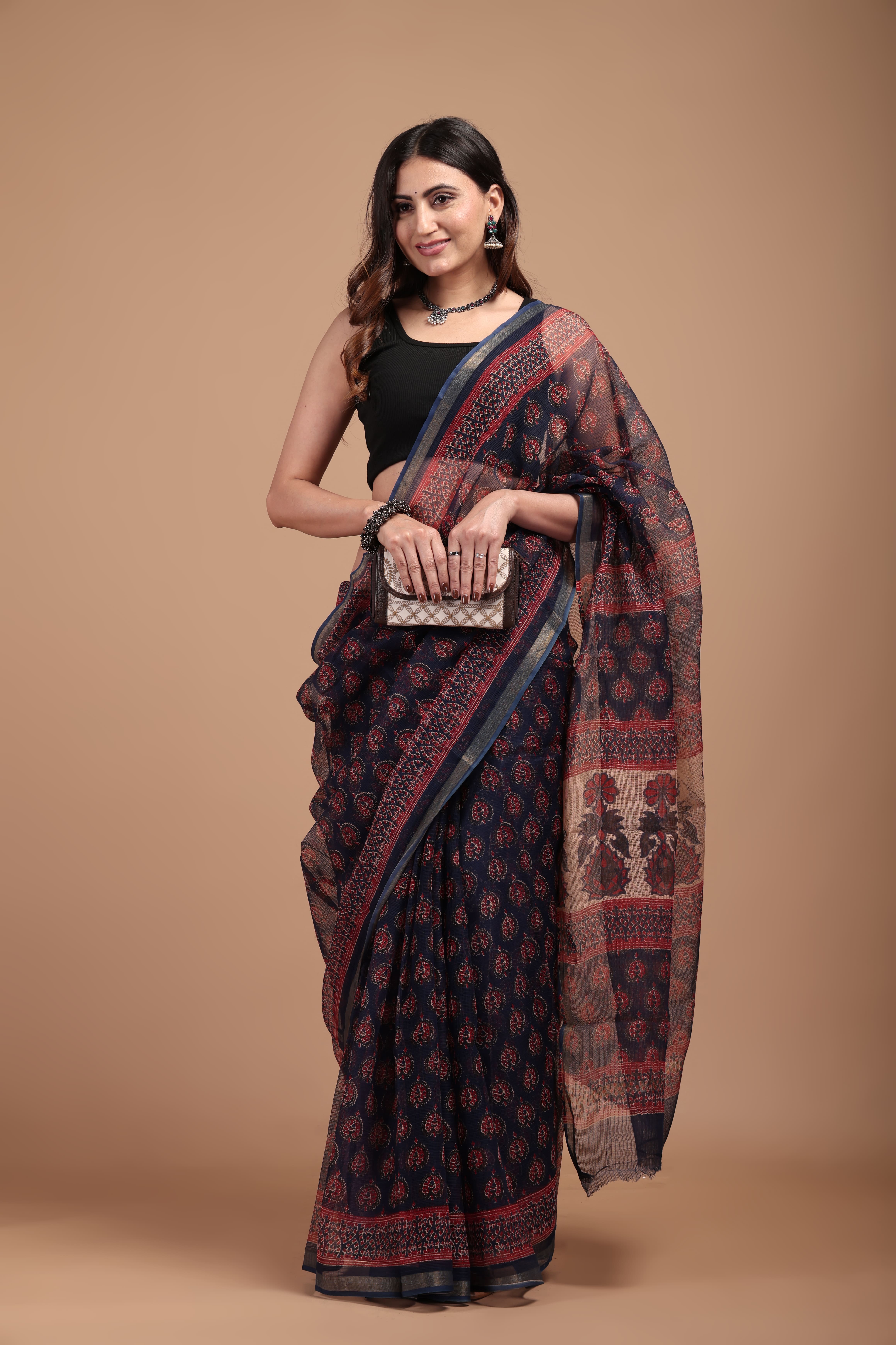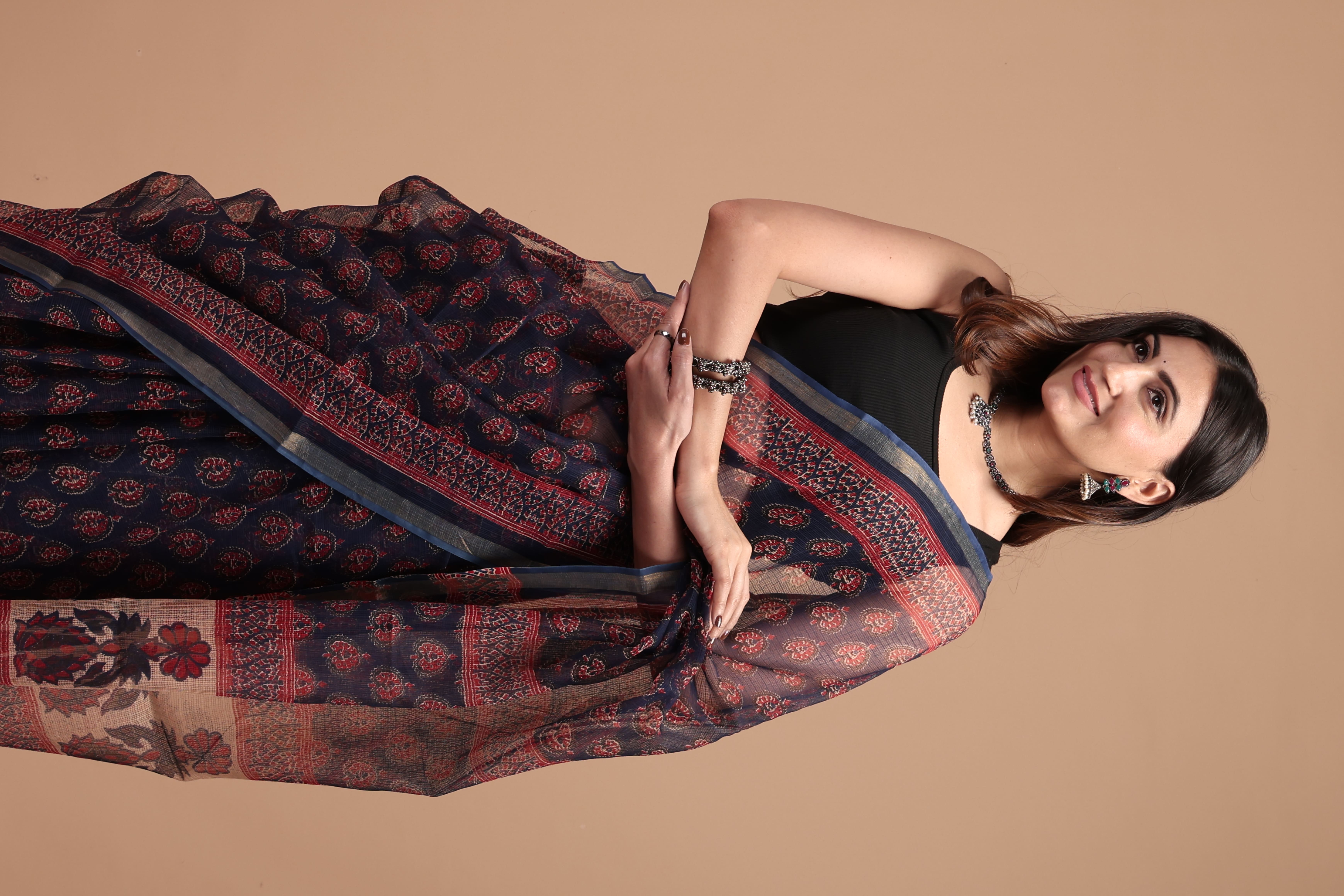 Exlcusives - natural dye vegetable hand block print ajrakh vanaspati PURE MODAL SILK SAREE IMPORTED SILK FABRIC with printed beautiful blouse Size Saree = 5.5 Mtr Blouse = 0.8-1 Mtr