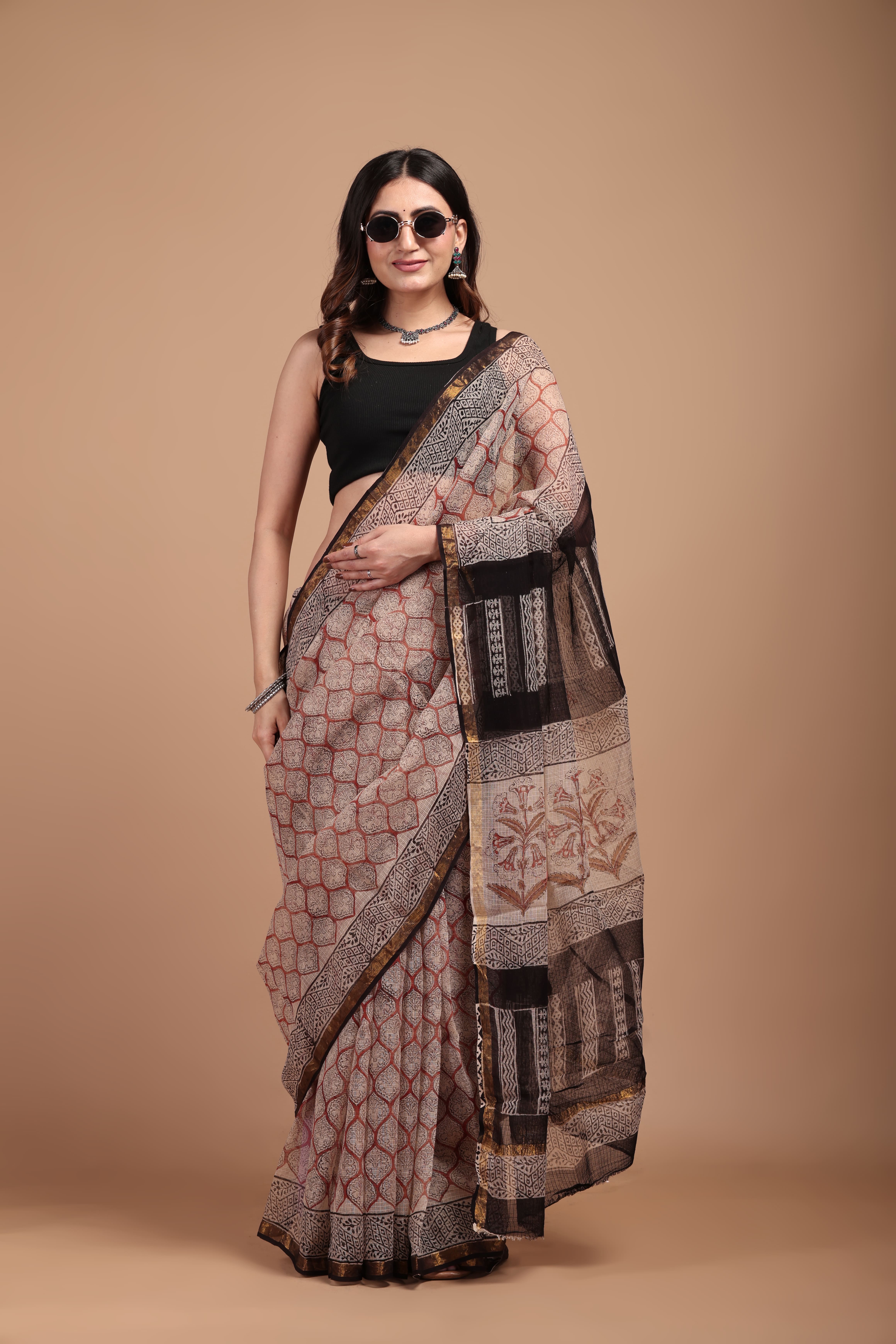 Printed pure Kota doriya saree with golden border (With blouse ) Saree-5.5 mtr Blouse -0.80cm
