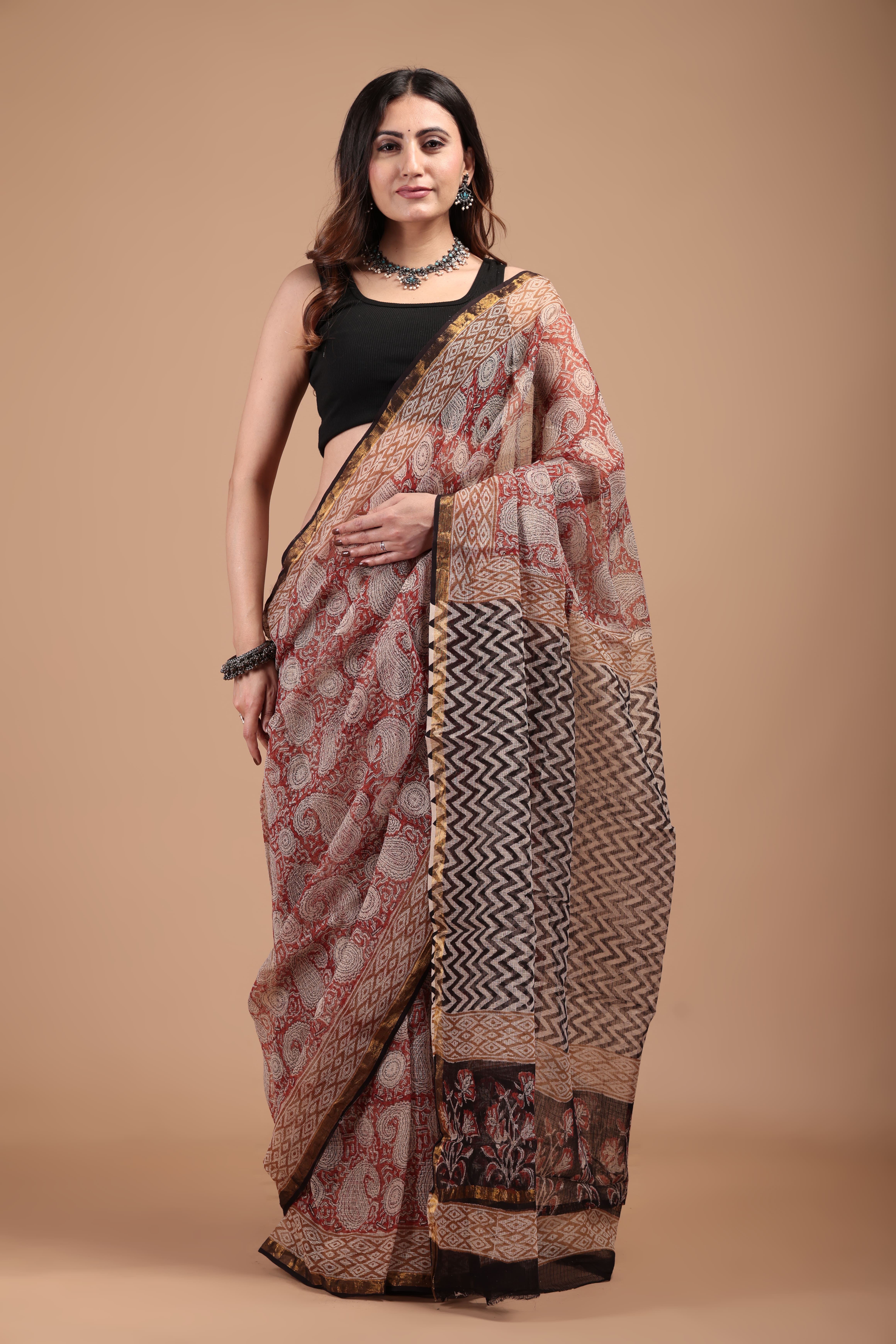 Printed pure Kota doriya saree with golden border (With blouse ) Saree-5.5 mtr Blouse -0.80cm