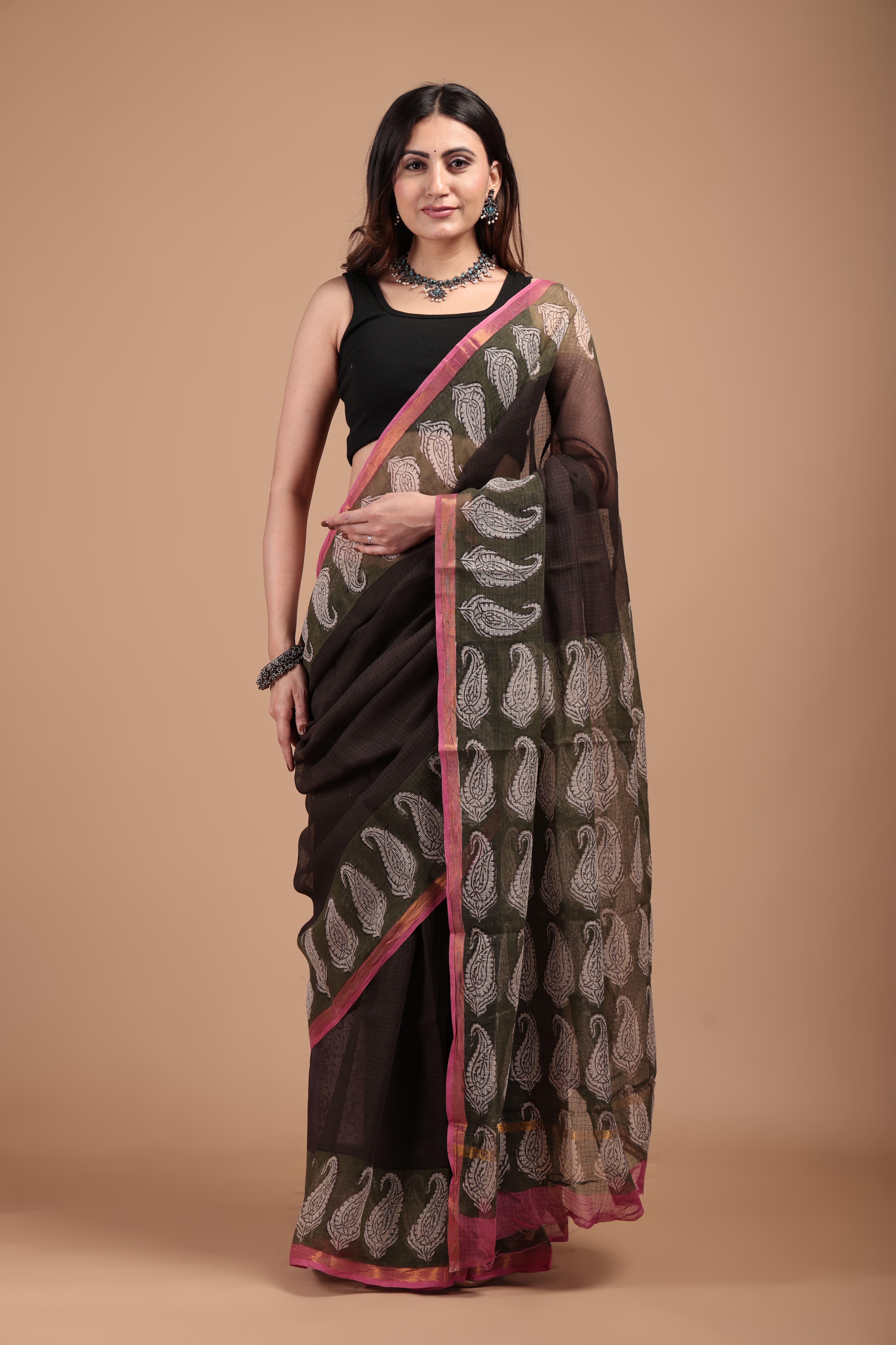 Printed pure Kota doriya saree with golden border (With blouse ) Saree-5.5 mtr Blouse -0.80cm