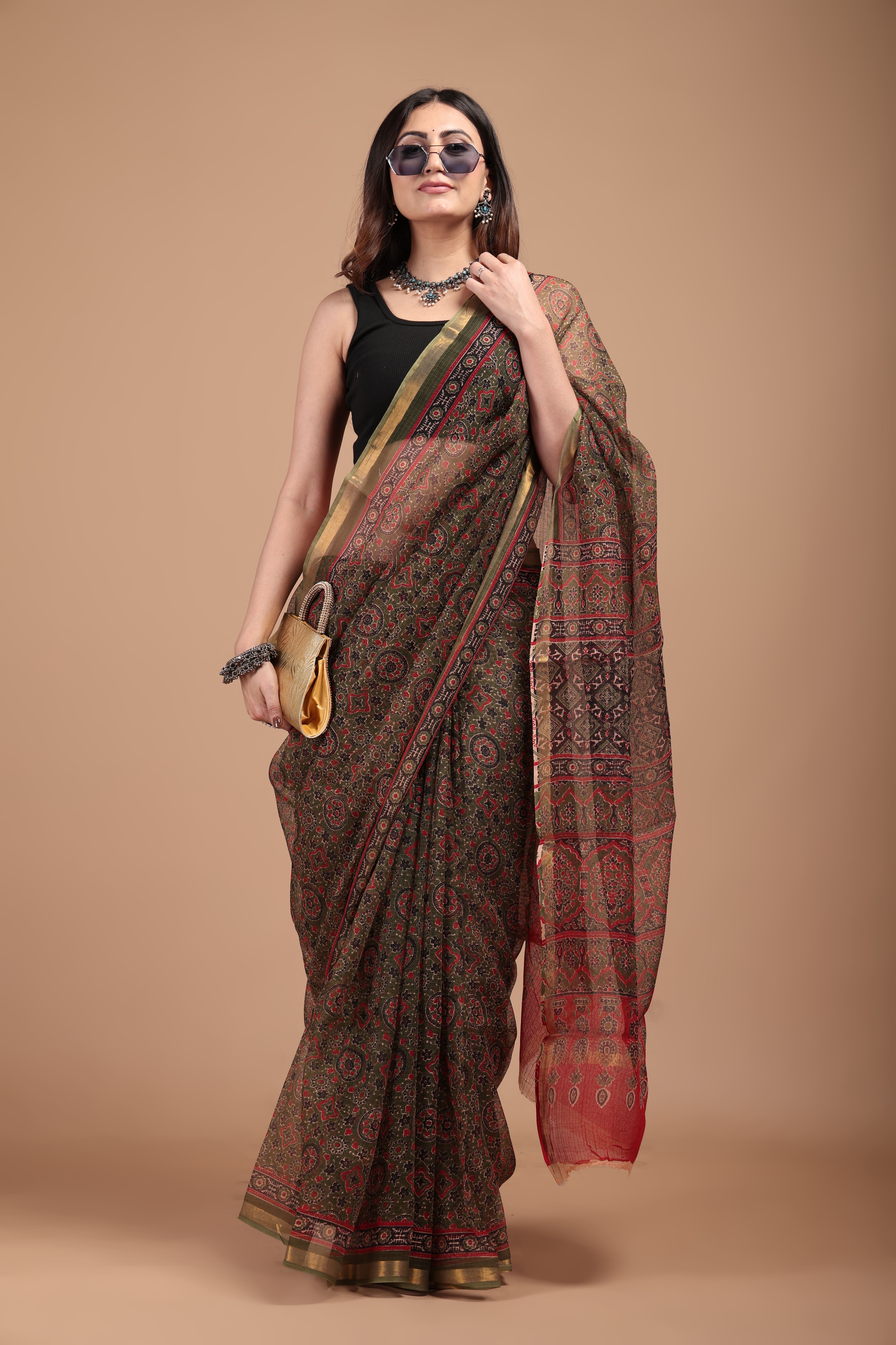 Printed pure Kota doriya saree with golden border (With blouse ) Saree-5.5 mtr Blouse -0.80cm